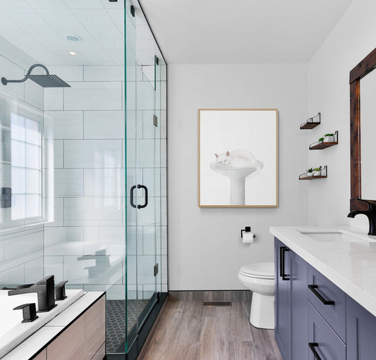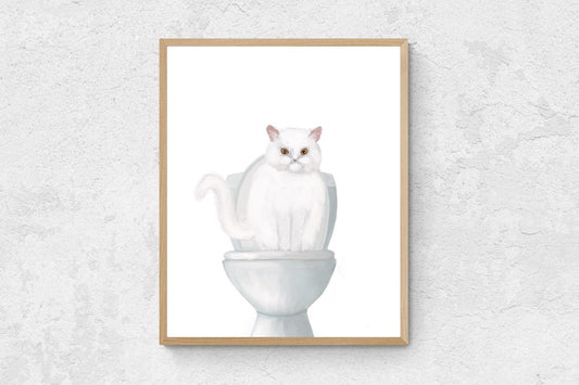 White Cat Sitting on Toilet Art Print – Playful and Quirky Wall Decor