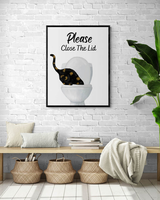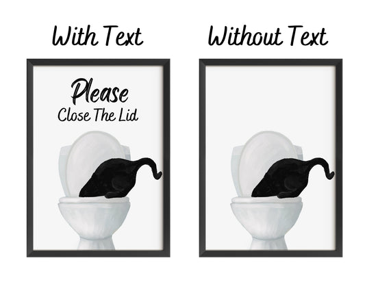 Black Cat Drinking from Toilet Art Poster – "Please Close The Lid" Fun Bathroom Art Print