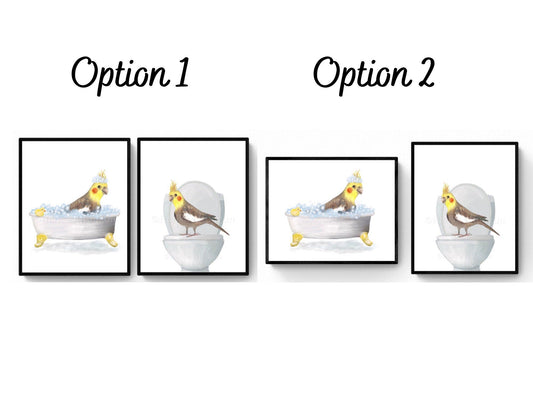 Cockatiel Bathroom Art Print Set – Whimsical Bird Bathroom Decor