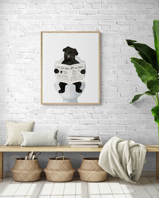 Funny Black Pug Dog Reading Newspaper Art Print – Doggie Daily Bathroom Decor