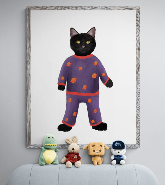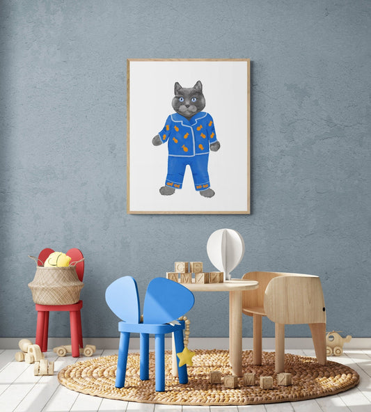 Gray Cat in Blue Pajamas – Cute and Playful Cat Art Print