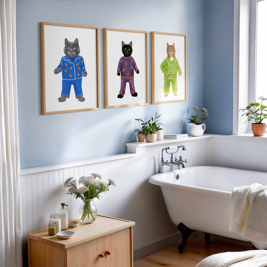 Cat Pajama Party Art Print Set of 3 – Playful Trio in Cozy Pajamas