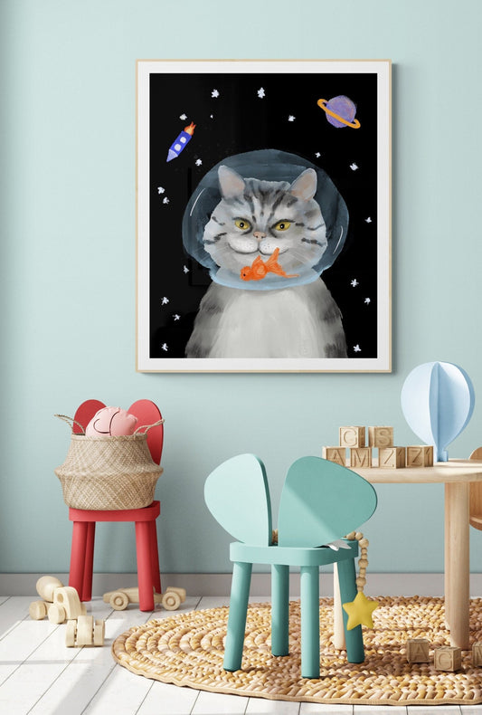Gray Tabby Cat In Space – Fun and Whimsical Cat Art Print