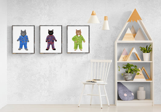 Set of 3 Cats Wearing Pajamas Print Set, Pajama Cat Print, Sleeping Cat Art, Home Decor Set, Black Cat Painting, Funny Cat Art Set