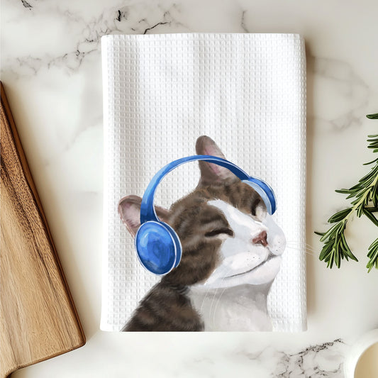 Cat Listening to Music Kitchen Towel