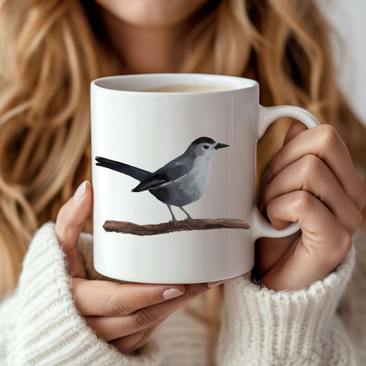 Gray Catbird Mug with Artistic Illustration