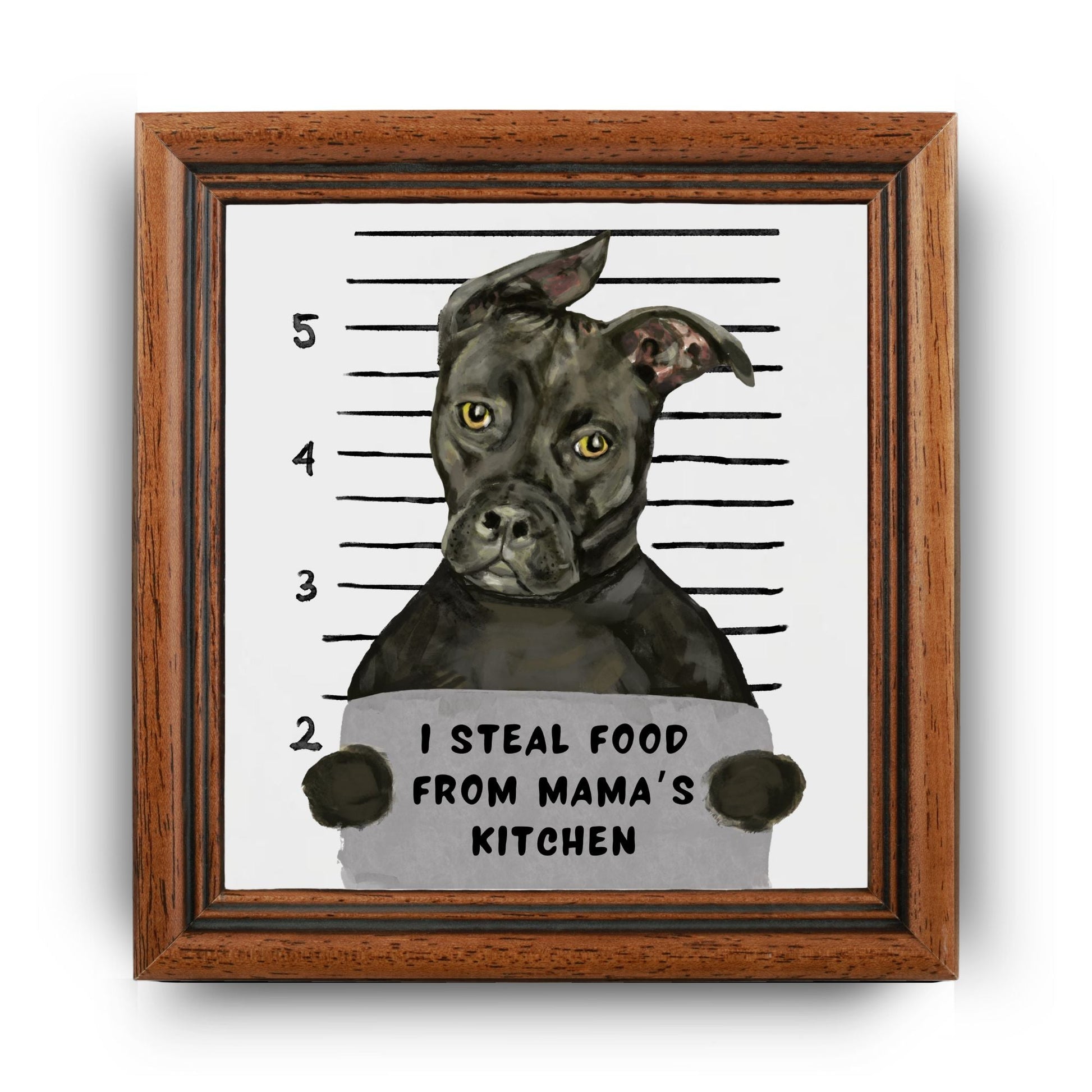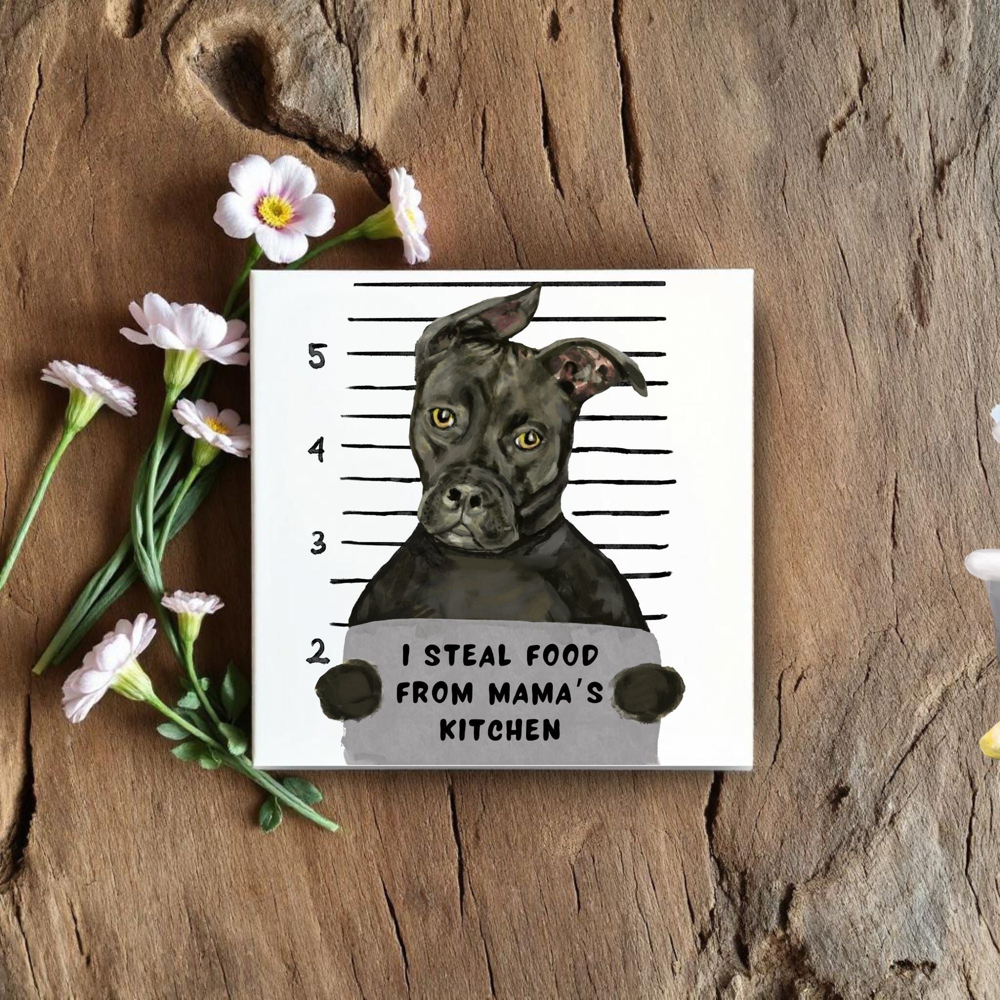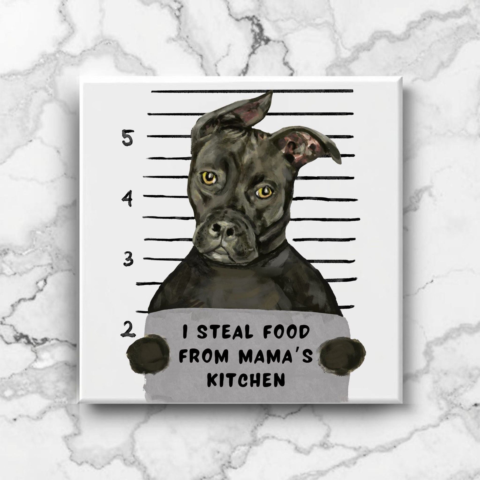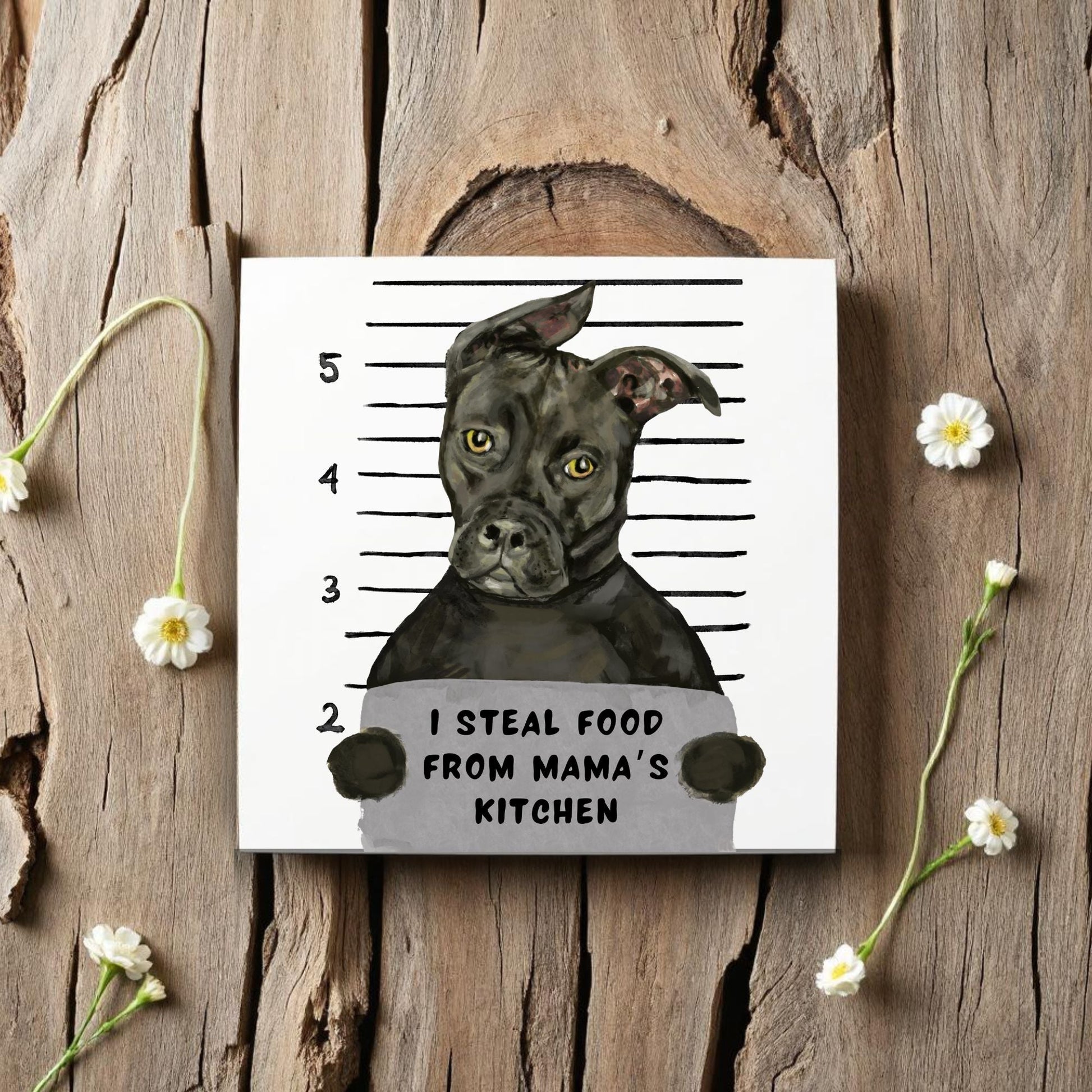 Strong, sweet, and slightly guilty! This 4.25x4.25-inch ceramic tile stars an American Staffordshire Terrier mid-confession, holding a sign that reads “I Steal Food From Mama’s Kitchen.” With soulful amber eyes and one floppy ear, this hand-painted mugshot captures the lovable duality of the breed—loyal protector by day, snack thief by night. A funny and heartwarming addition to any kitchen or gift collection. Glossy finish provides durability and visual pop.