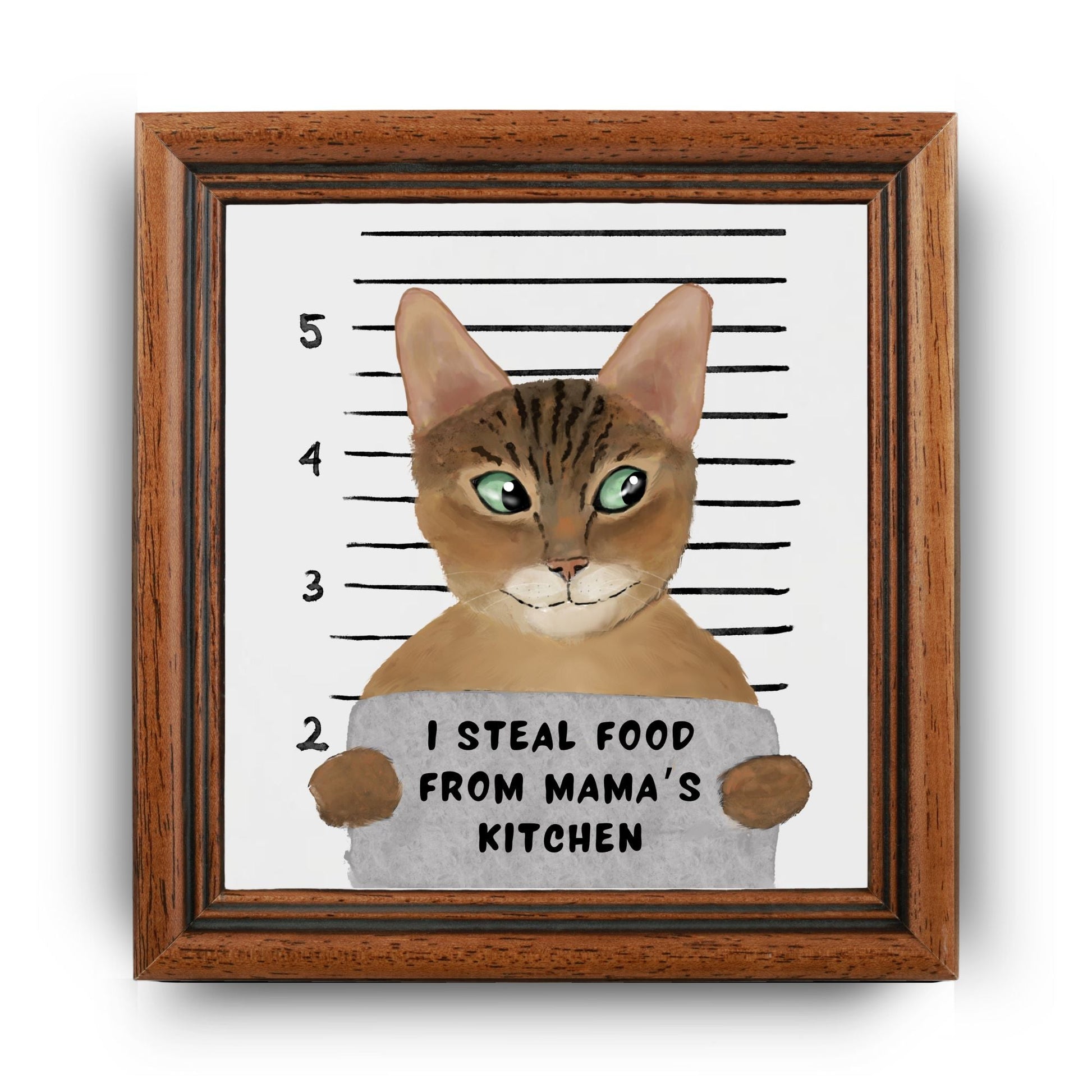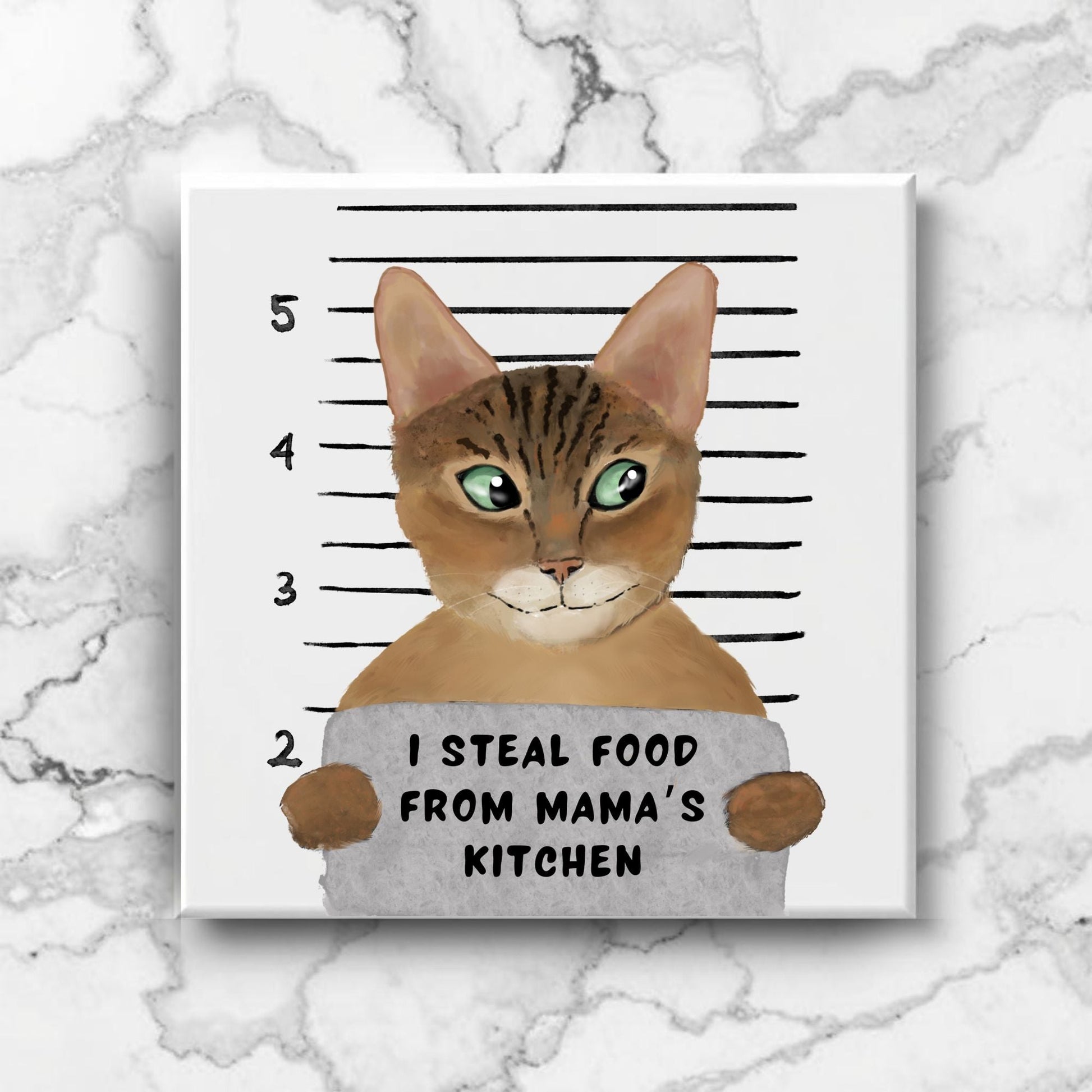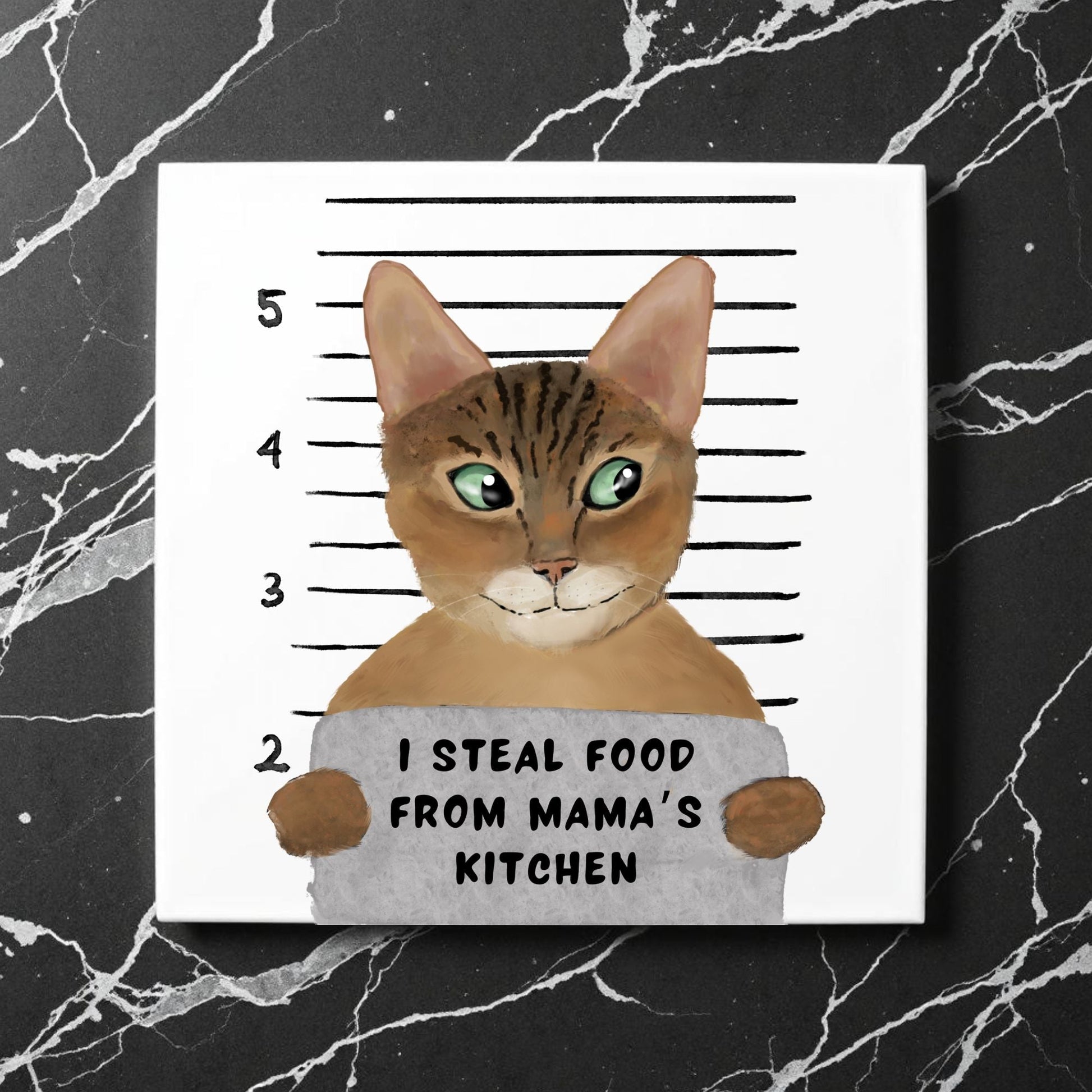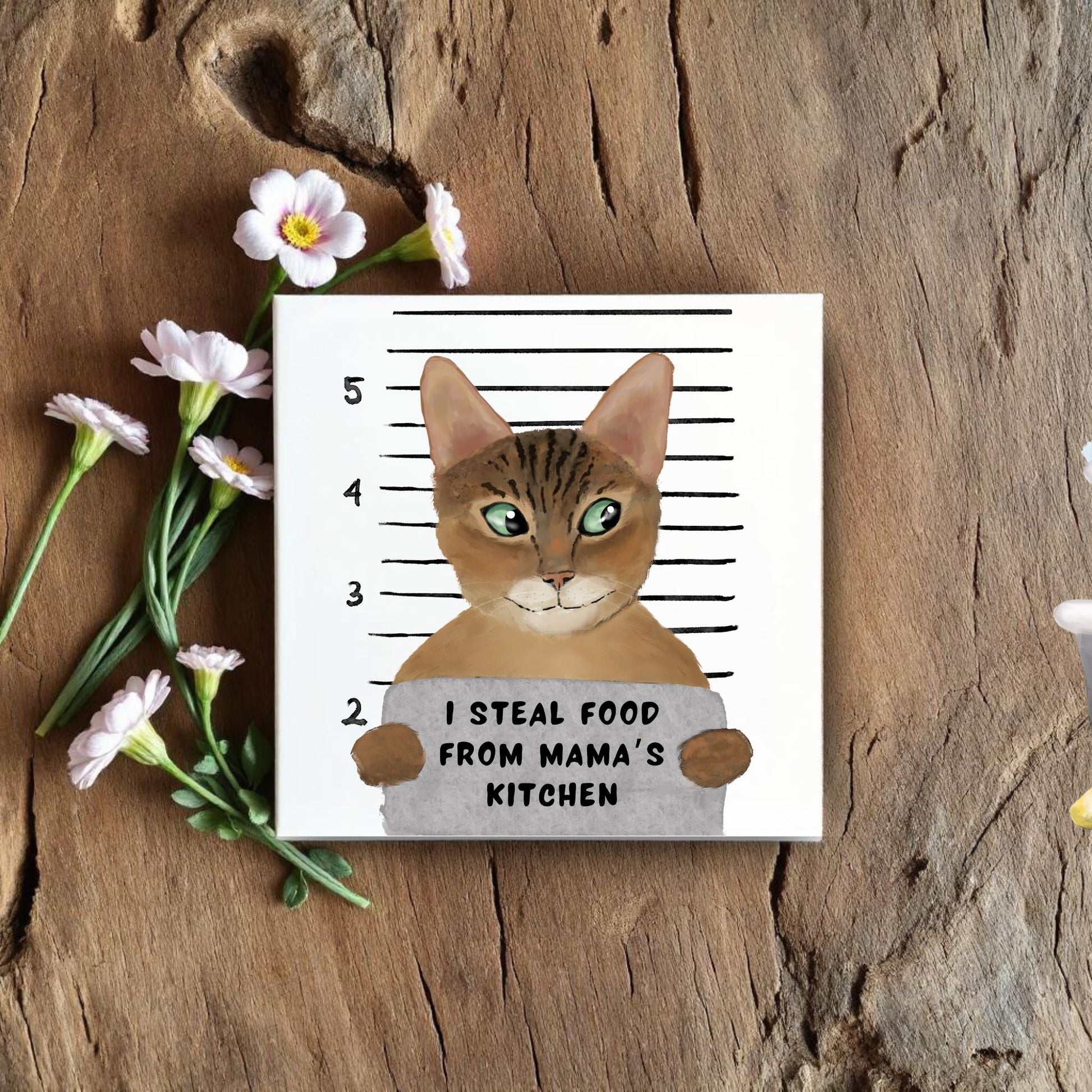 Fierce, fabulous, and totally guilty! This 4.25x4.25-inch ceramic tile showcases a stunning Bengal cat in a hilarious mugshot scene, holding a sign that reads “I Steal Food From Mama’s Kitchen.” With mesmerizing green eyes and wild markings, this tile blends humor and elegance perfectly. Ideal for cat lovers, Bengal owners, or anyone who knows that one feline who thinks the countertop is their personal buffet. Glossy finish ensures vibrant color and durability for years to come.