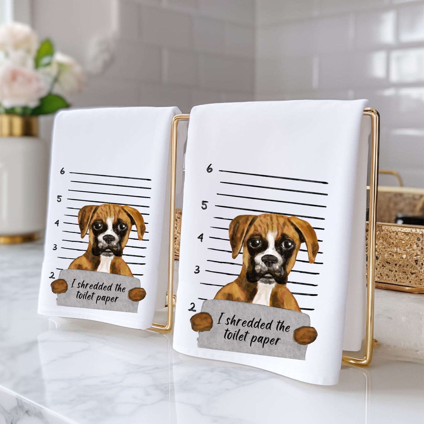Add some canine humor to your bathroom with this funny boxer dog mugshot towel, featuring artwork by Harika Altungun. This guilty pup holds up a sign reading, “I shredded the toilet paper,” capturing the mischievous side of every playful dog. Perfect for dog lovers who can’t stay mad at their four-legged troublemaker!