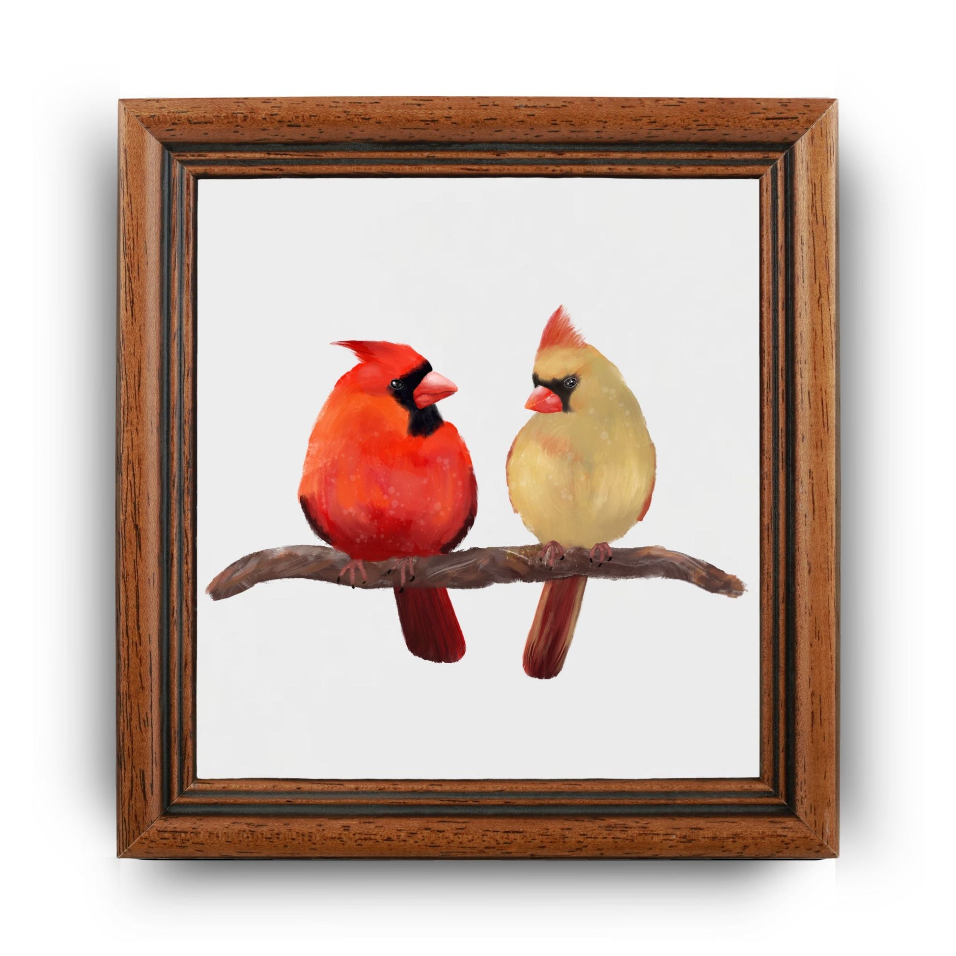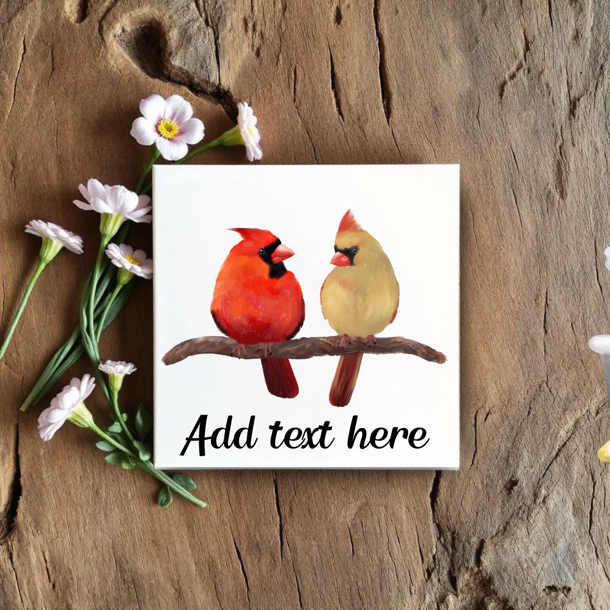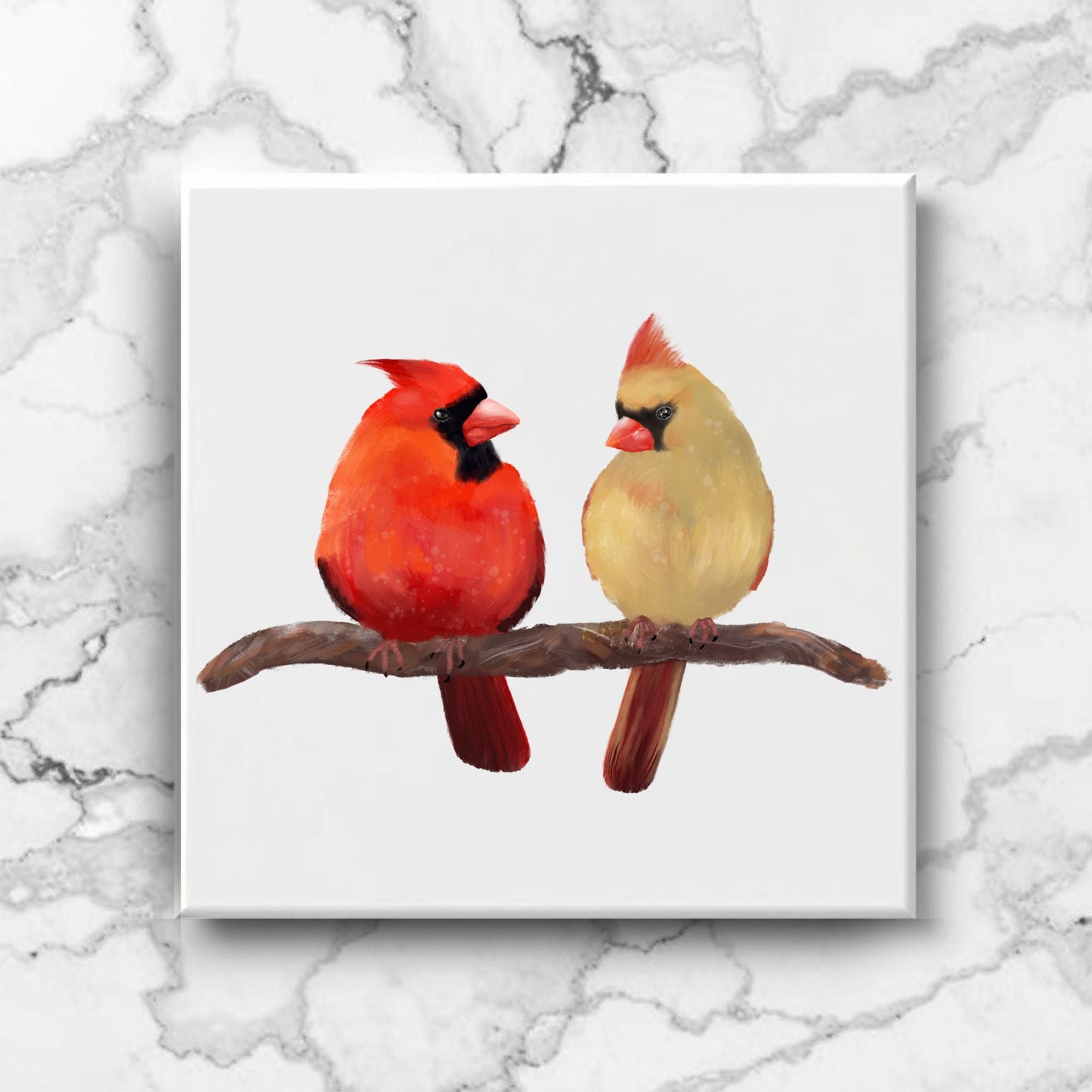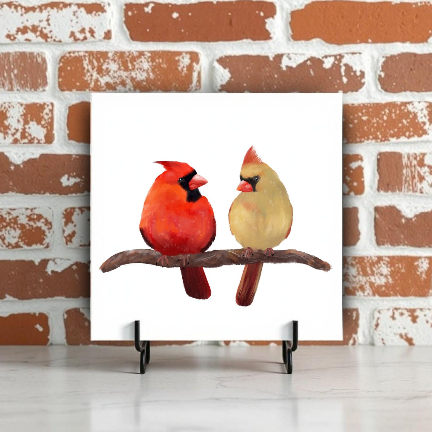 This stunning ceramic tile features a beautifully illustrated pair of Northern Cardinals, one vibrant red male and one soft-toned female, perched together on a branch. Designed by Harika Altungun, this nature-inspired artwork is perfect for bird lovers, birdwatchers, and anyone who appreciates the beauty of backyard birds. A wonderful gift for couples, bird enthusiasts, and home decor lovers.