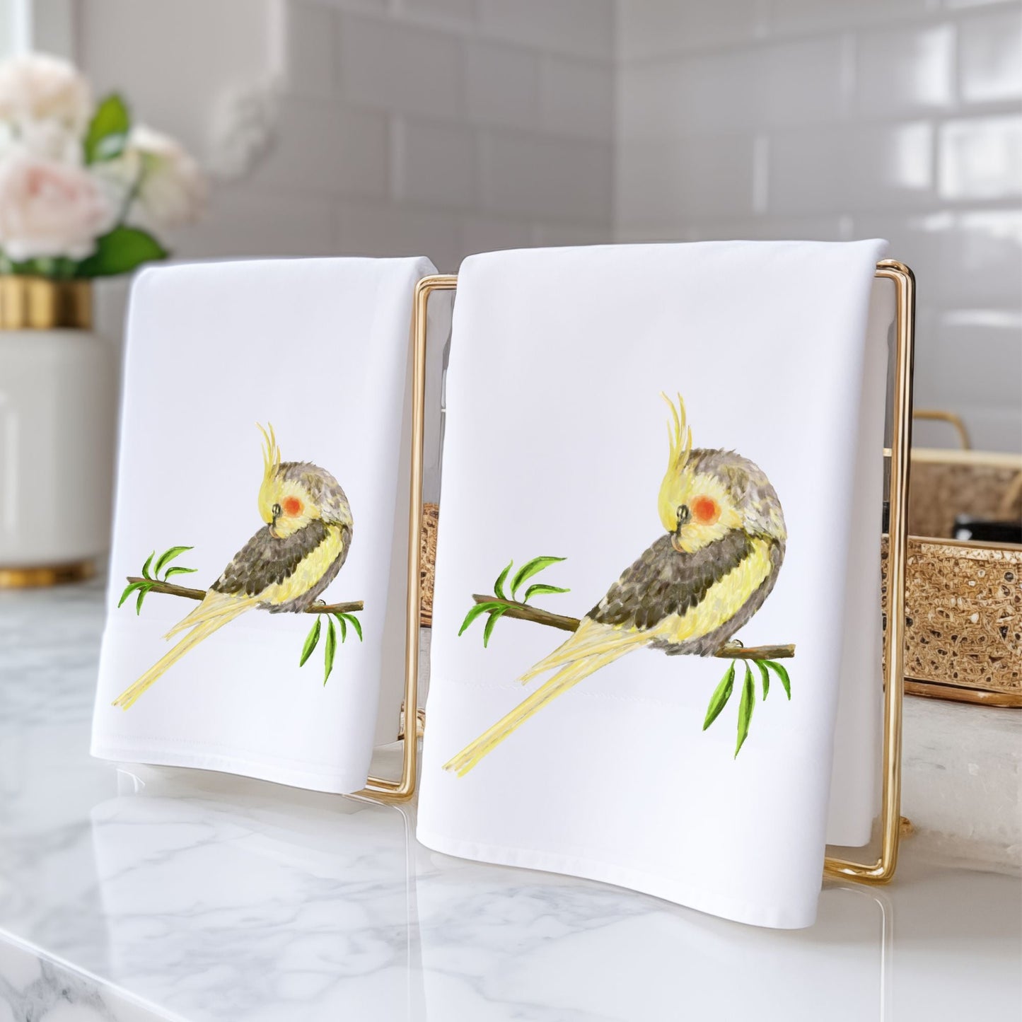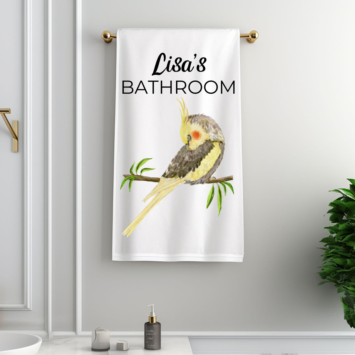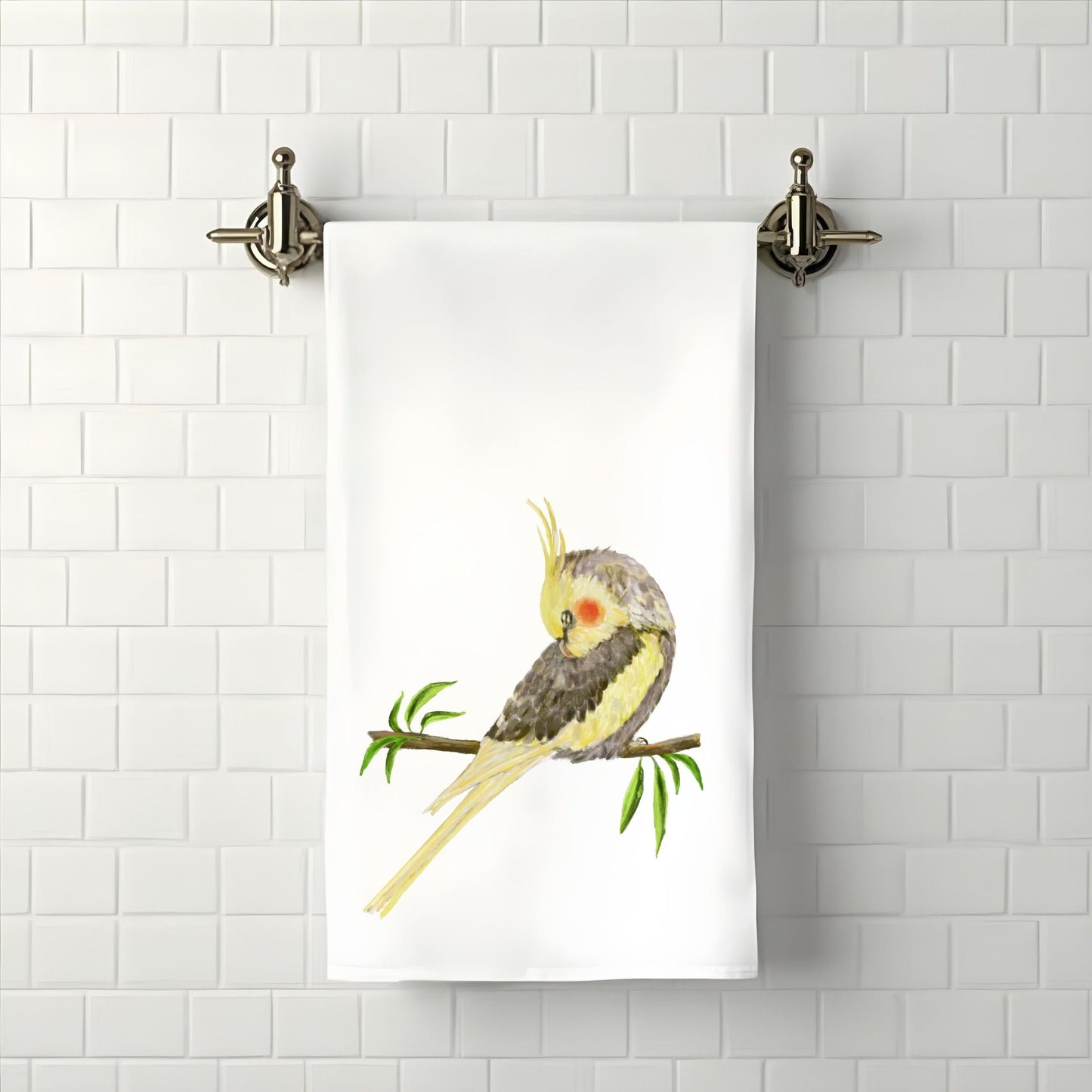 Bring a soft, nature-inspired touch to your space with this beautiful cockatiel bathroom towel, featuring artwork by Harika Altungun. The peaceful illustration of a cockatiel perched on a leafy branch adds a gentle charm, perfect for bird lovers, pet cockatiel owners, and those who appreciate elegant avian decor.
