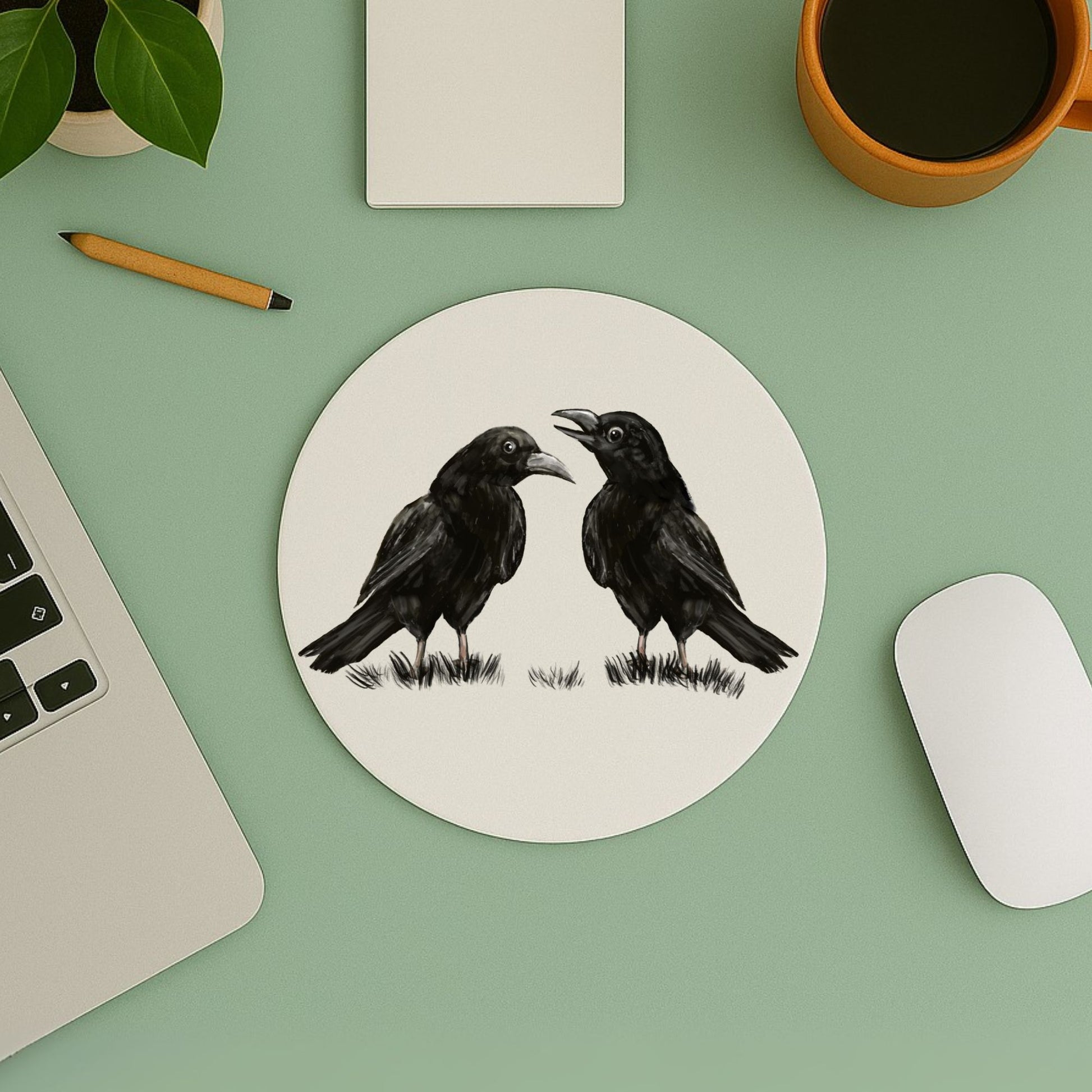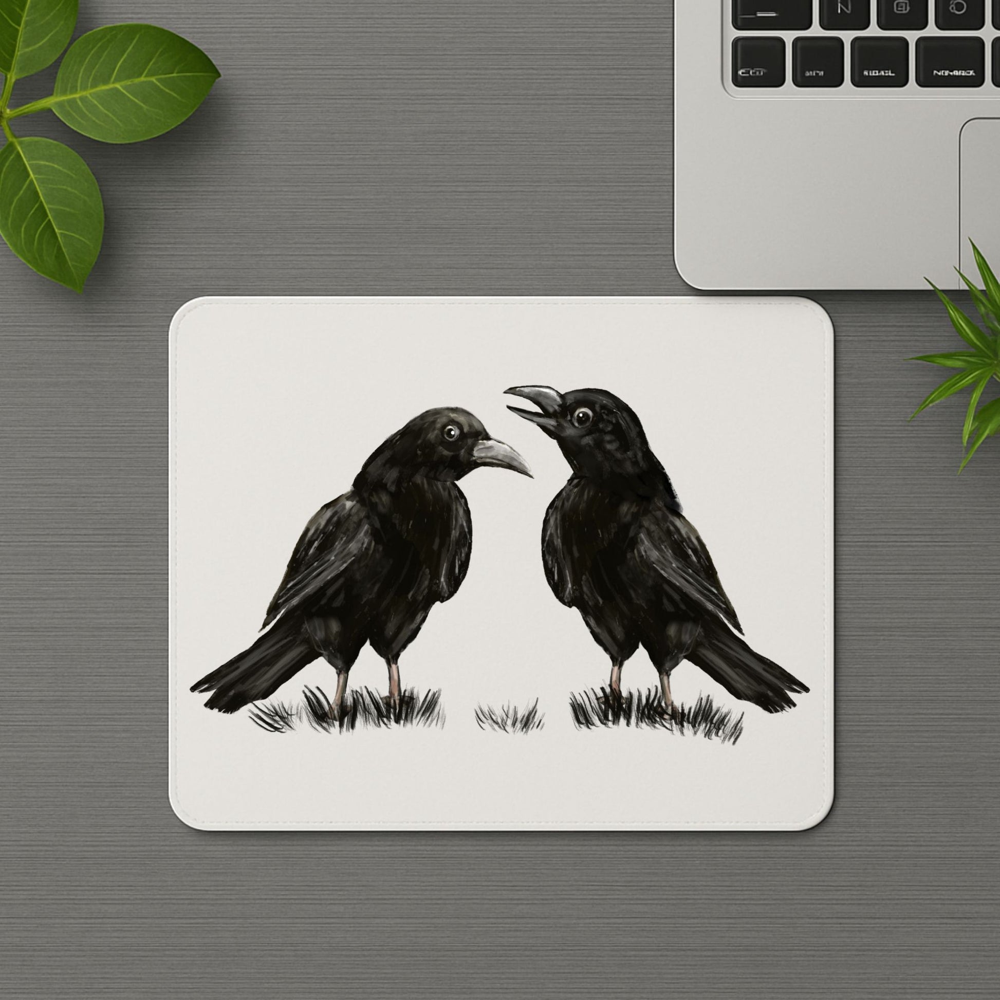 Bring a bit of mysterious charm and personality to your workspace with this crow mousepad featuring two expressive black crows standing on a grassy patch. Their cheeky interaction adds a whimsical and witty vibe to your desk, perfect for crow lovers, gothic aesthetics fans, or anyone who enjoys intelligent birds and unique art.