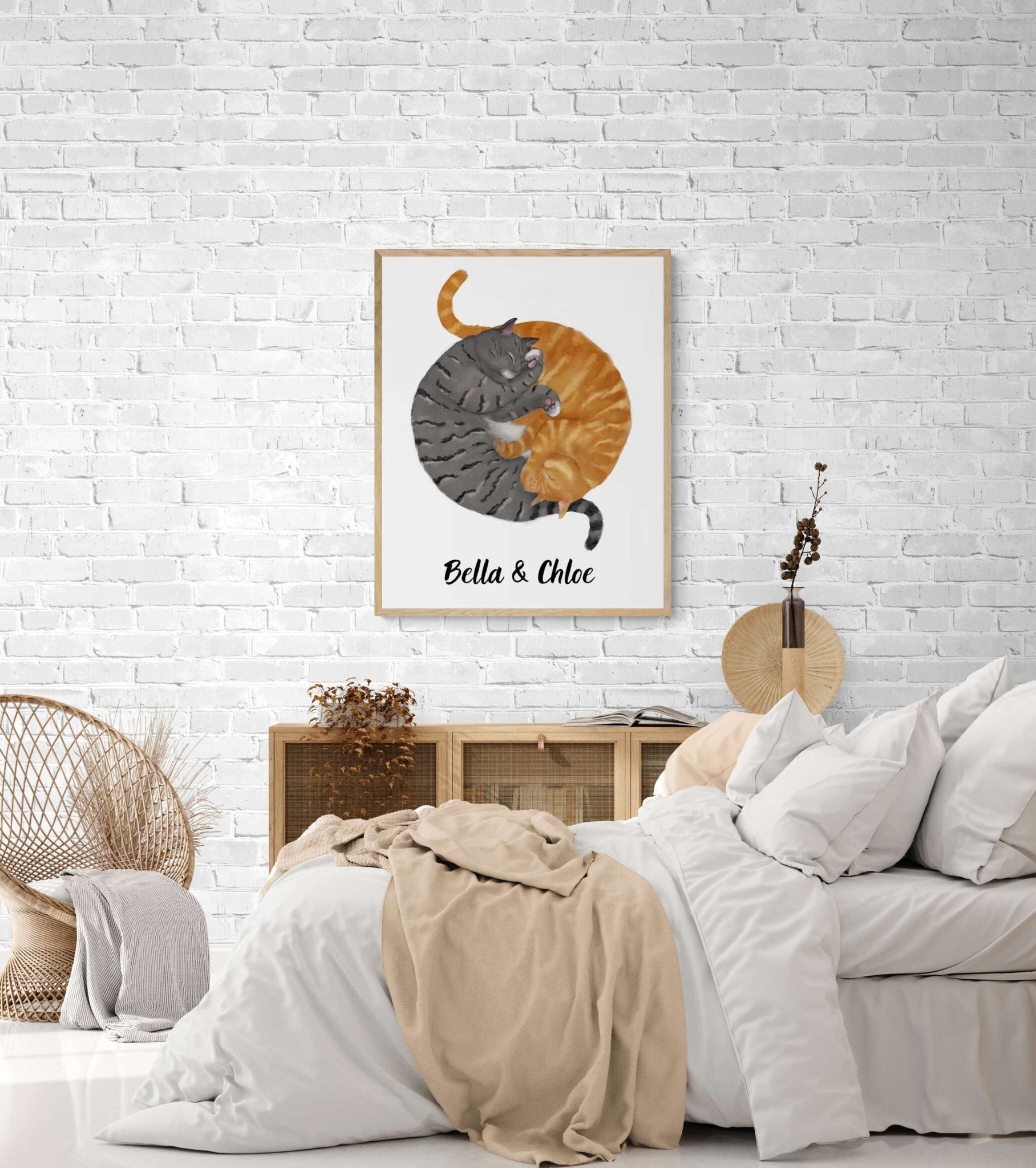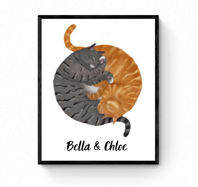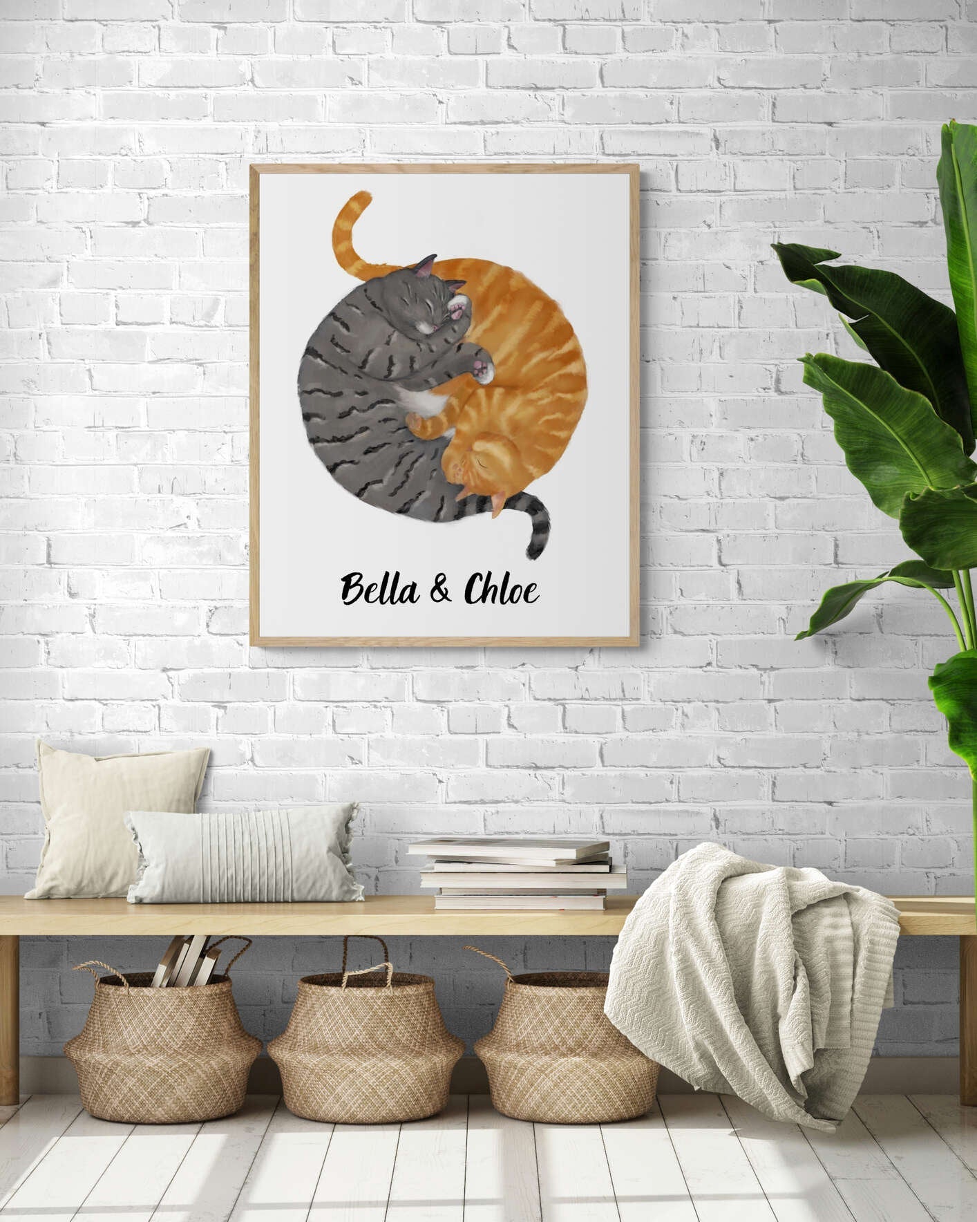 Customized Sleeping Orange And Gray Tabby Cat Print, Custom Cuddling Cats, Cat Illustration, Home Decor, Lazy Cat Painting, Pet Loss Gift