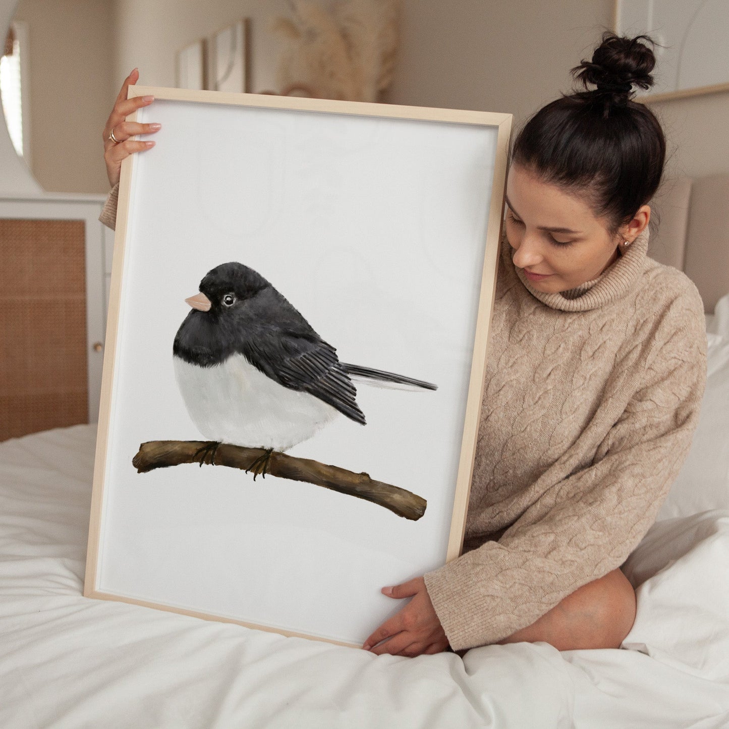 Perfect for bird lovers, backyard birdwatchers, and nature enthusiasts, this artwork makes a warm and quiet statement in your home. Whether you're decorating a living room, study, guest bedroom, or cabin-style space, this junco print adds a touch of soft natural beauty.