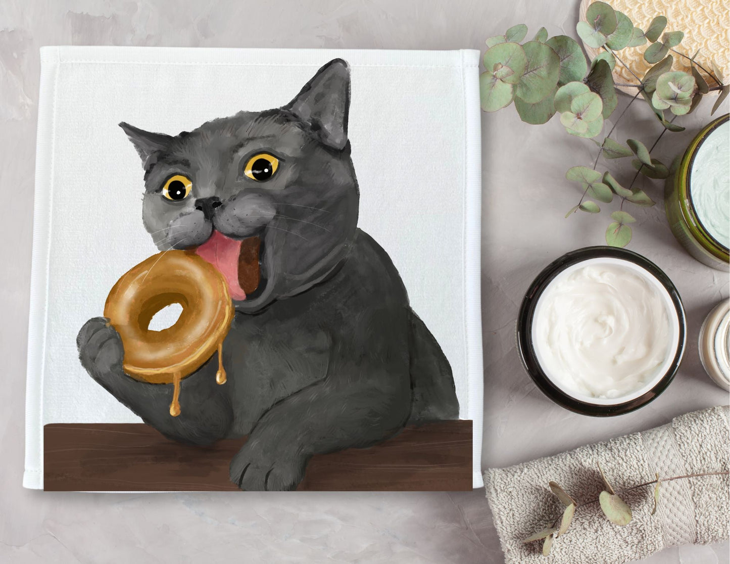Bring a playful twist to your home with this washcloth featuring an enthusiastic gray cat mid-bite into a delicious donut. Illustrated by Harika Altungun, this design is a whimsical blend of sweet cravings and feline charm. Perfect for kitchens, bathrooms, or as a delightful gift for cat and dessert lovers, it adds a splash of personality and humor to any space.