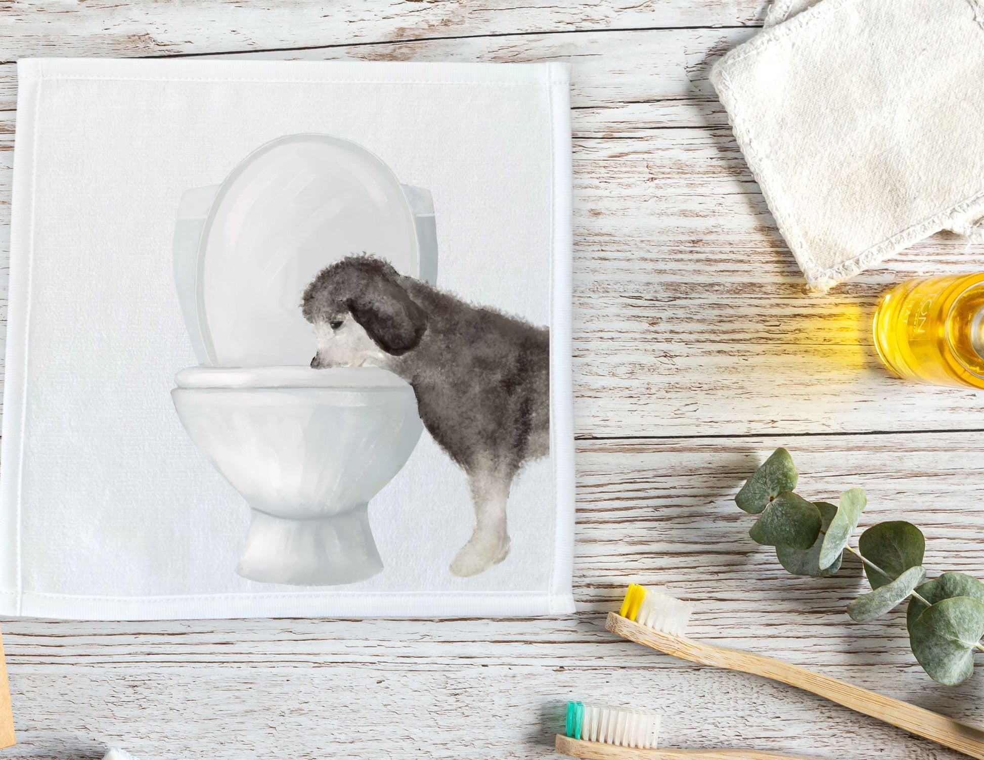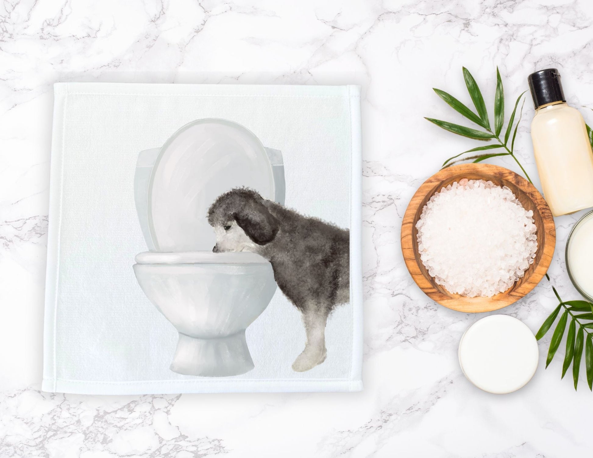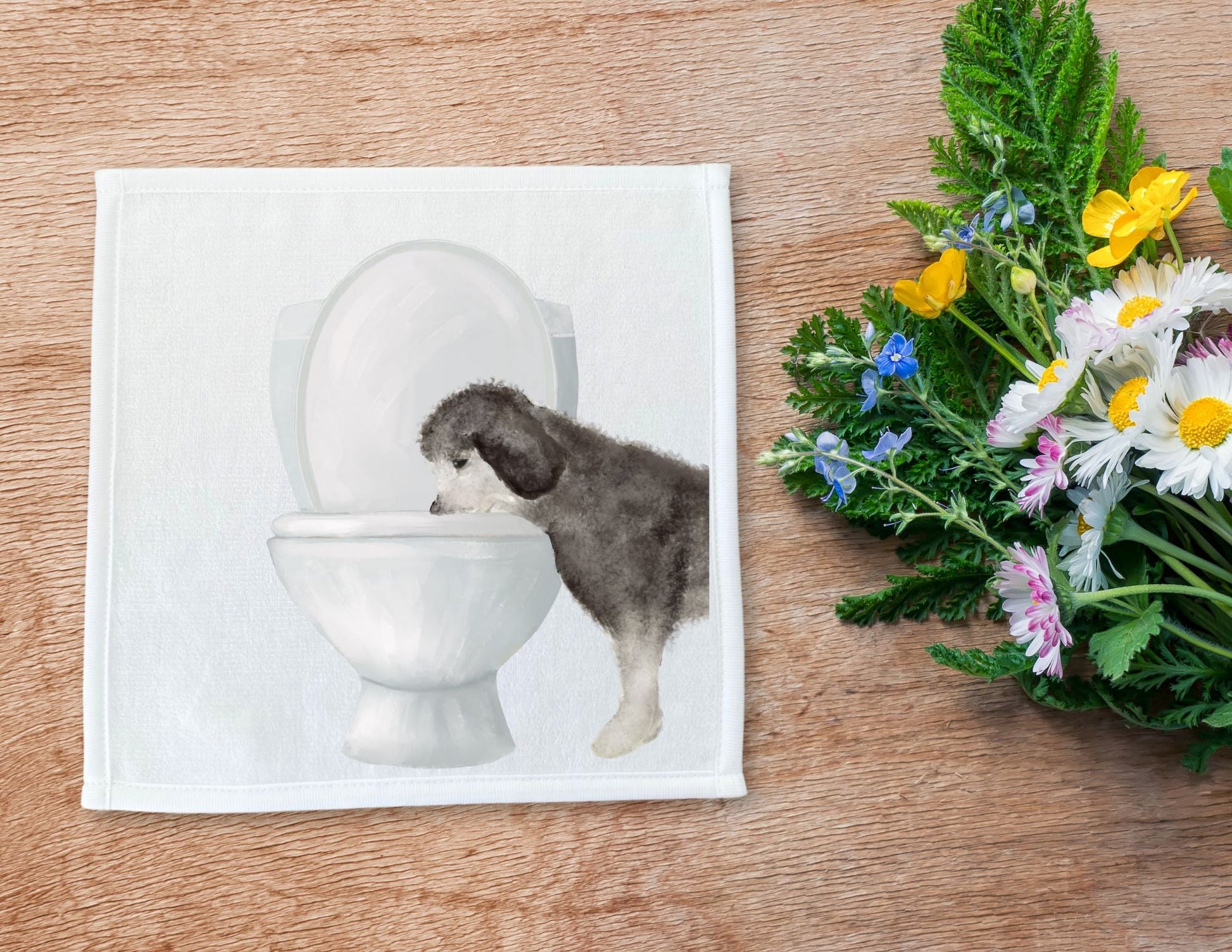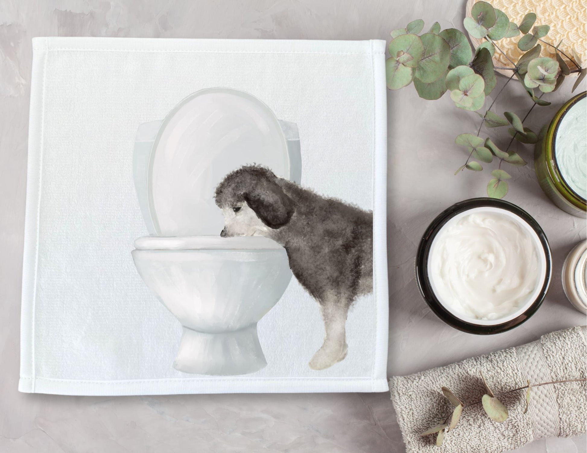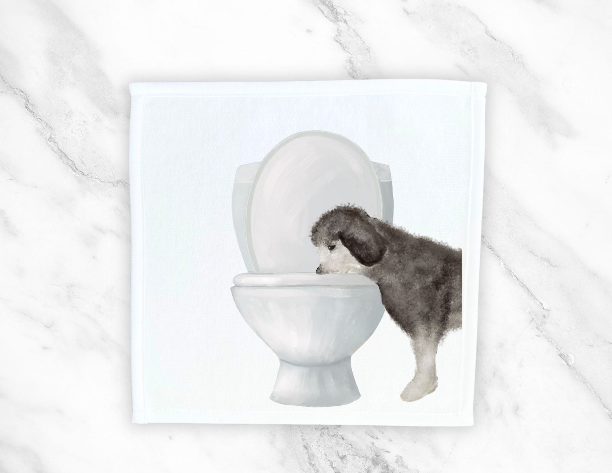 Add a fuzzy splash of fun to your bathroom with this whimsical washcloth featuring a fluffy, curly-haired dog curiously peeking into a toilet, illustrated by Harika Altungun. With its soft texture and puzzled expression, this pup brings extra charm and fluff to your everyday routine. A perfect gift for doodle owners, fluff-lovers, or anyone who enjoys playful and lighthearted home decor.
