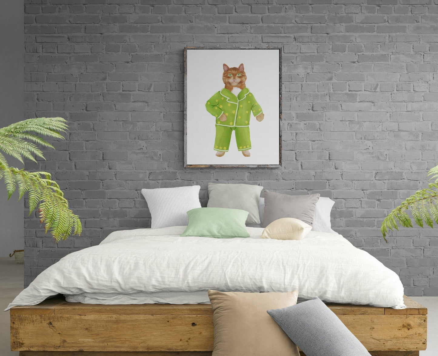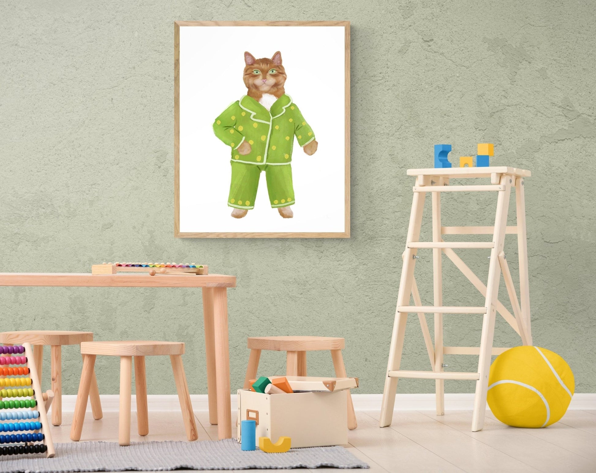 This print is made from my original artwork, featuring an adorable orange cat confidently wearing bright green polka-dot pajamas. This playful and charming design adds a touch of fun to any room, perfect for bedrooms, nurseries, or cozy spaces. Whether you're a cat lover or enjoy whimsical decor, this unique art print will bring personality and joy to your home.