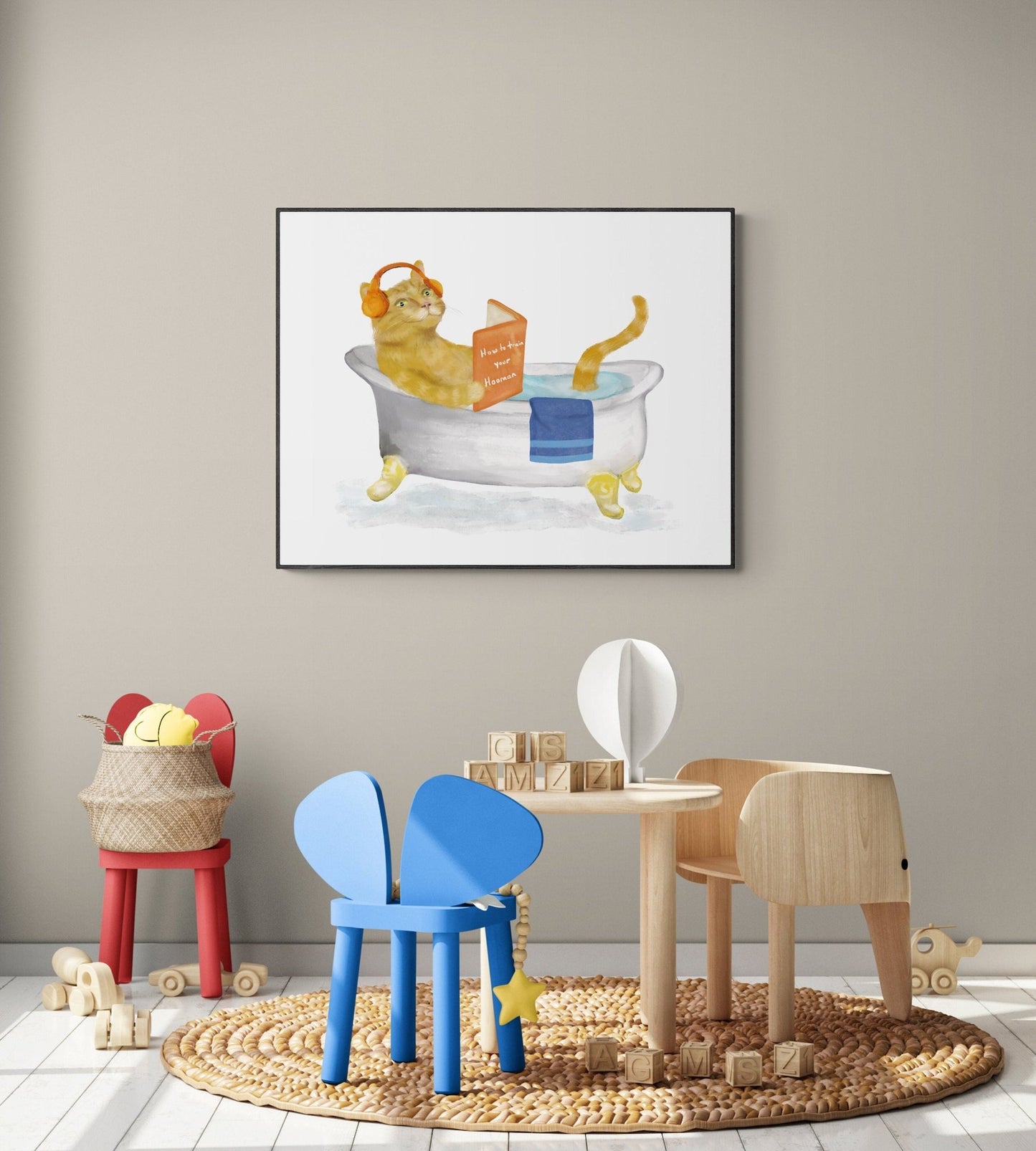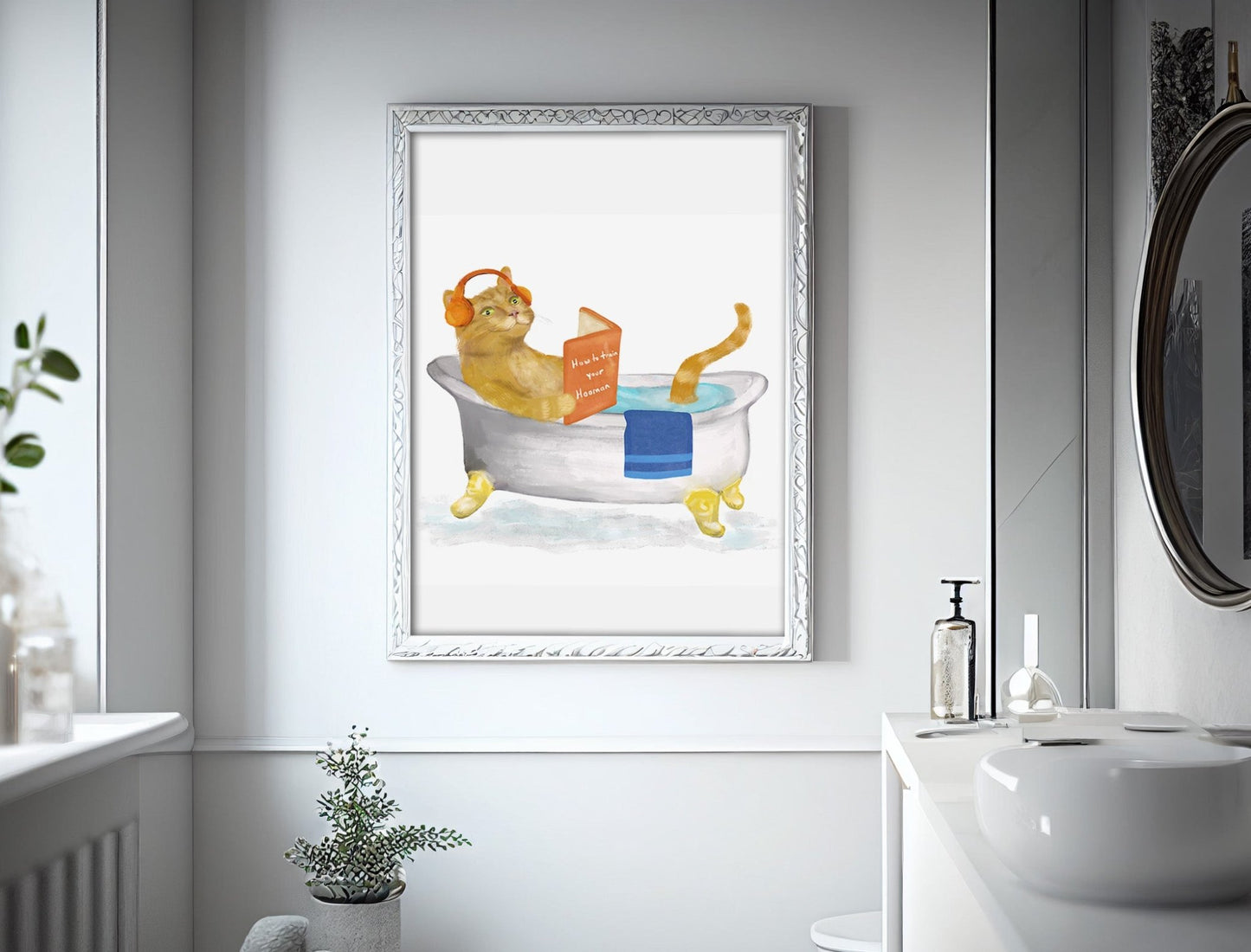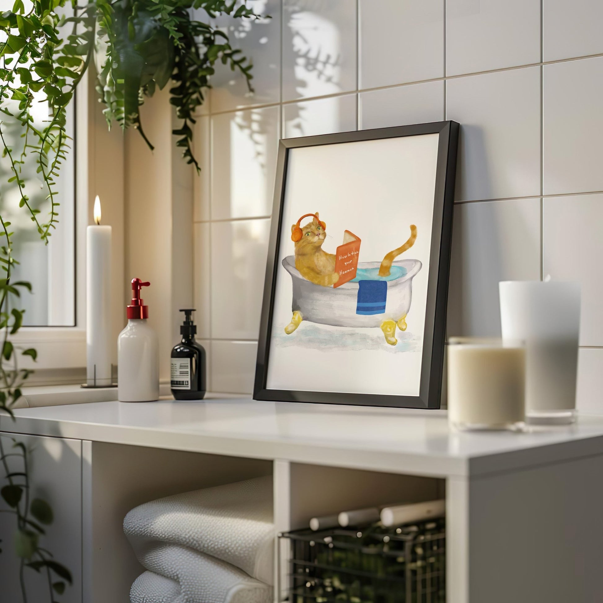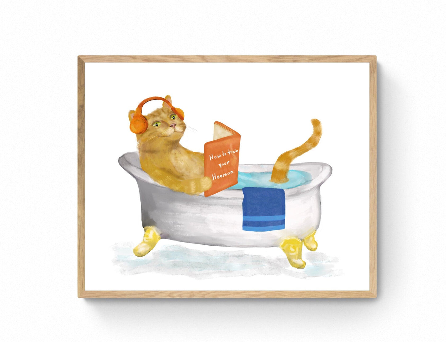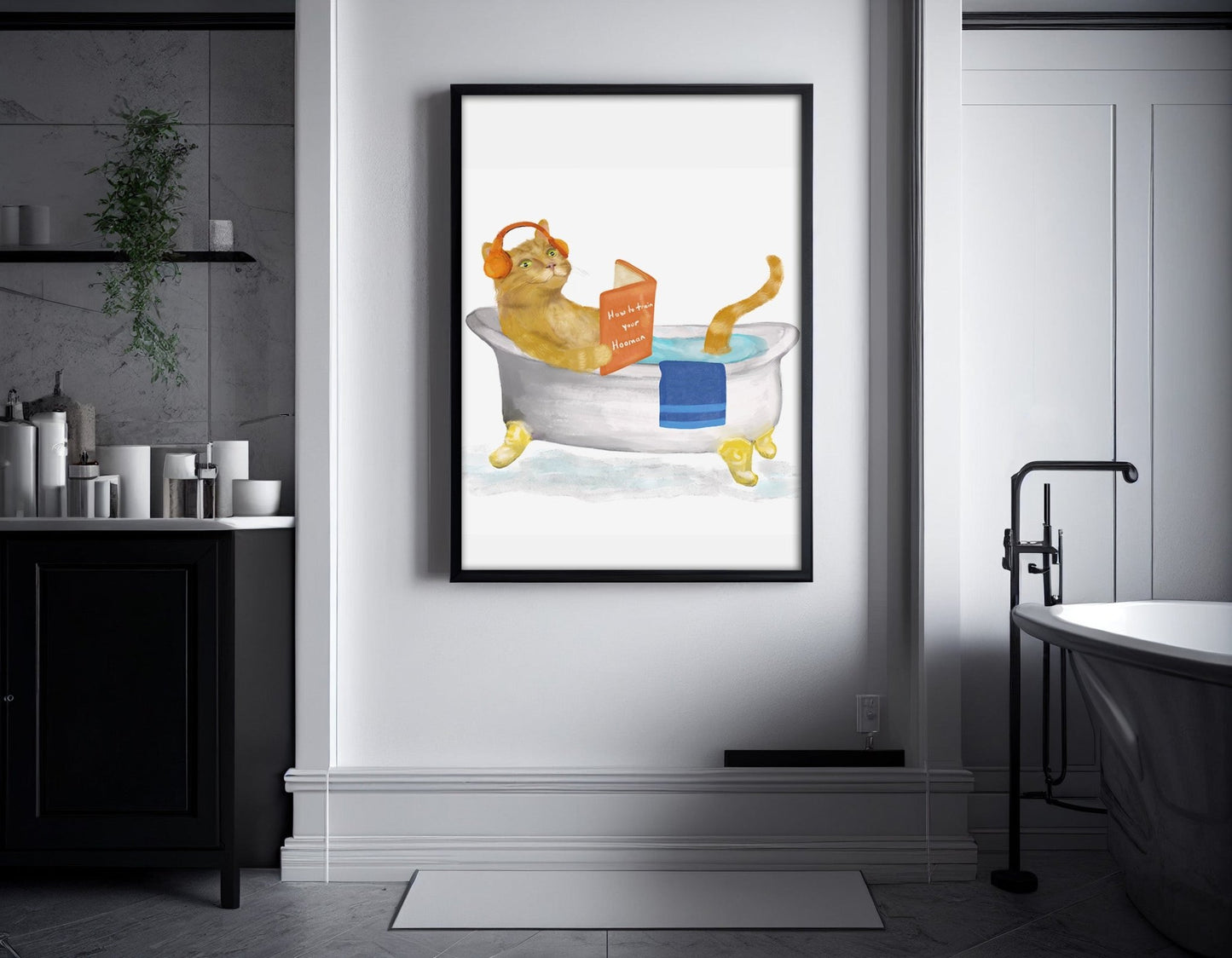 This print is made from my original artwork, featuring a relaxed orange cat enjoying a cozy bath while reading a book titled "How to Train Your Hooman," with headphones on for extra relaxation. The playful and whimsical scene adds charm and personality to any space, making it a delightful addition to your bathroom, reading nook, or living area. Perfect for cat lovers and book lovers alike, this unique artwork brings humor and warmth to your home decor.