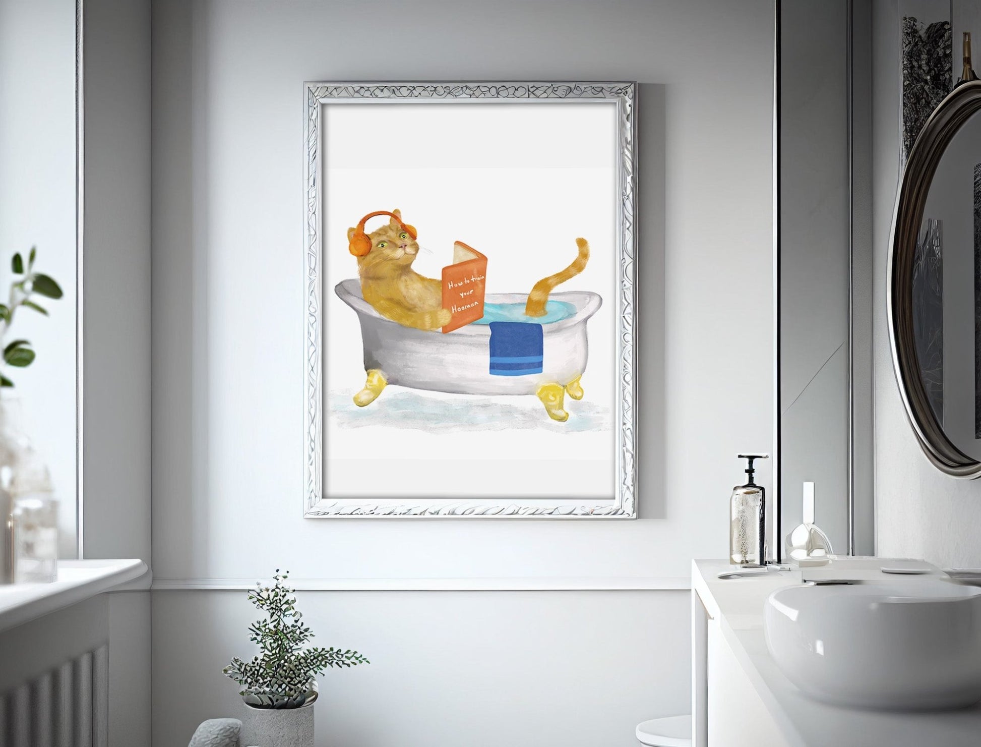 Animal illustrations, cat lover gifts, cute home decor, bathroom wall art, fun reading-themed prints, and pet-themed decor. This artwork is also a thoughtful pet memorial or pet loss gift for those honoring a beloved feline friend.