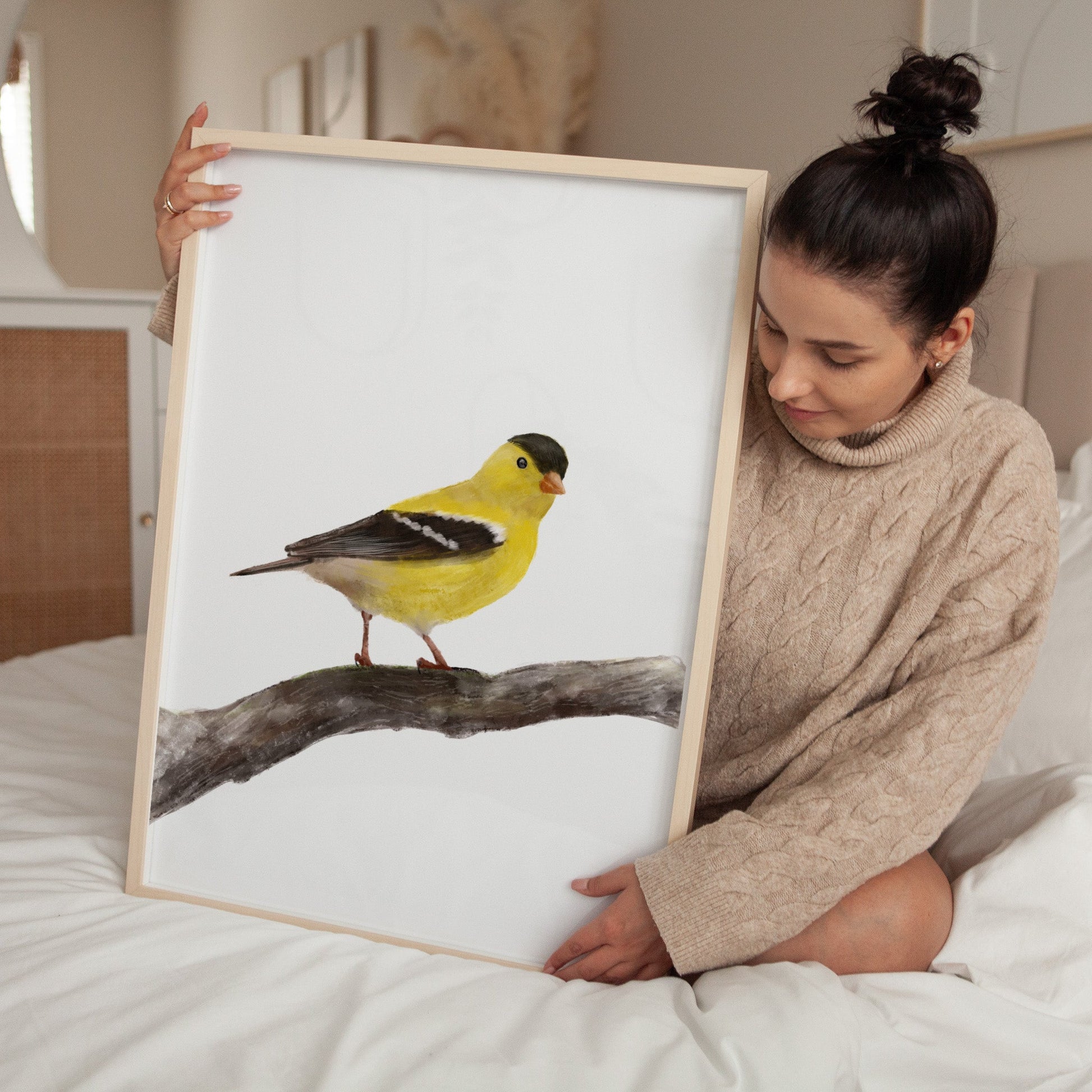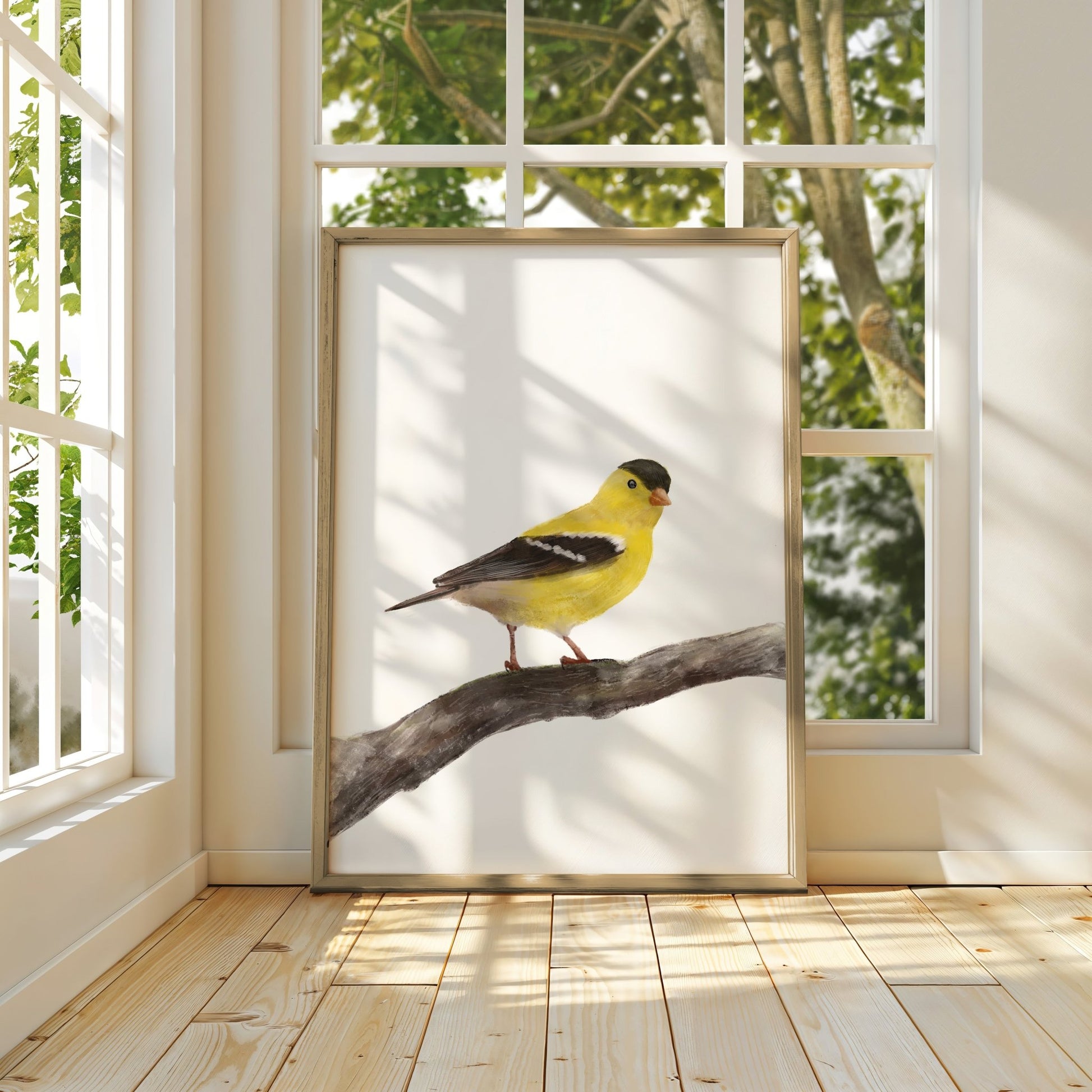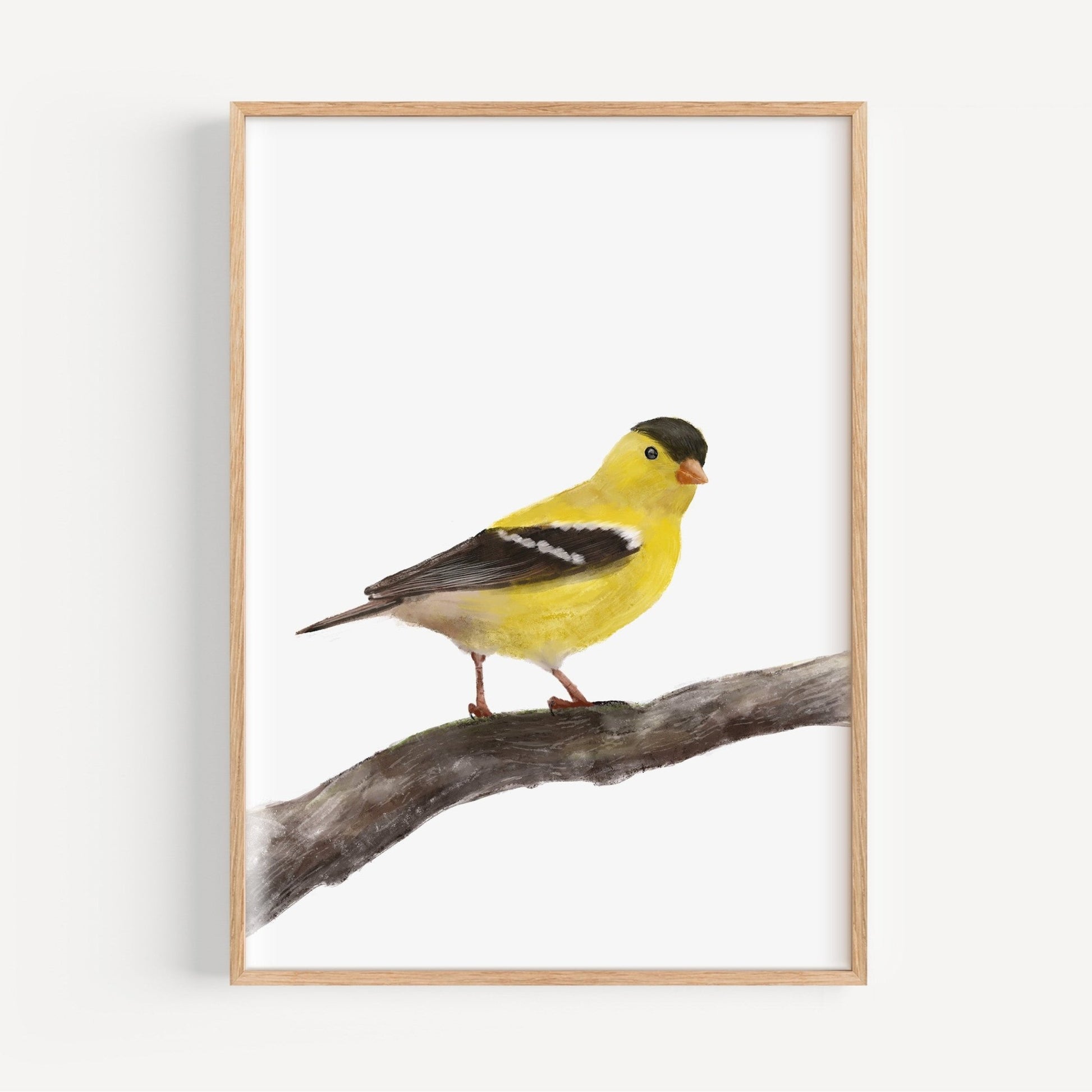 This beautiful art print features a vibrant goldfinch perched gracefully on a branch. With its striking yellow feathers and black markings, this charming bird illustration brings a touch of warmth and cheerfulness to any room. Perfect for bird lovers and nature enthusiasts, this print adds a splash of color to your decor, making it an ideal addition to living rooms, bedrooms, or study spaces.