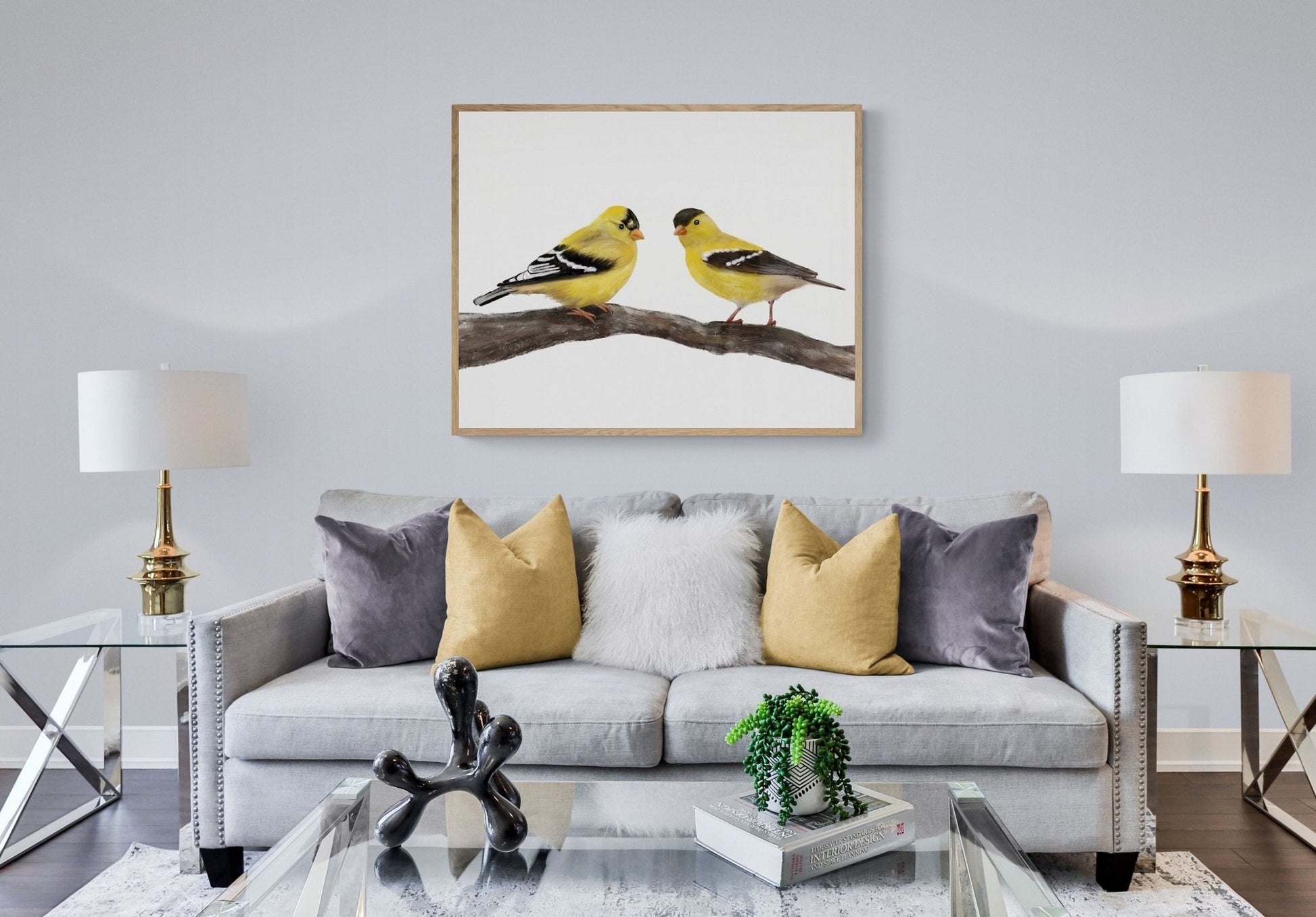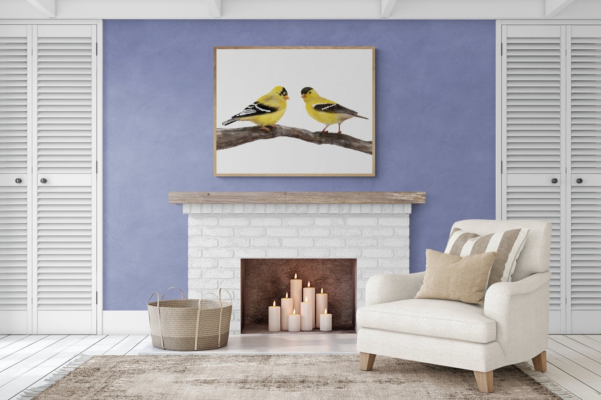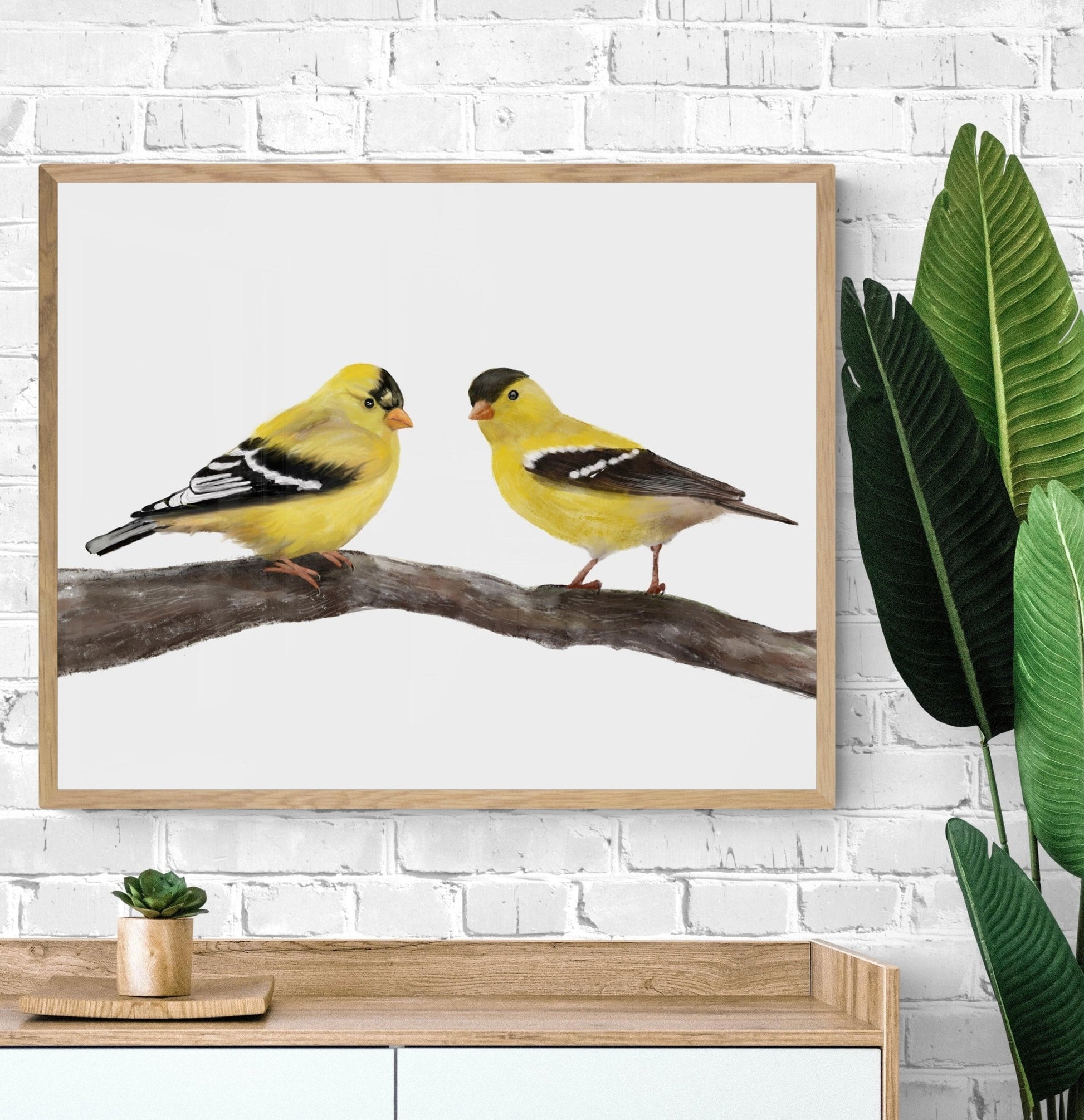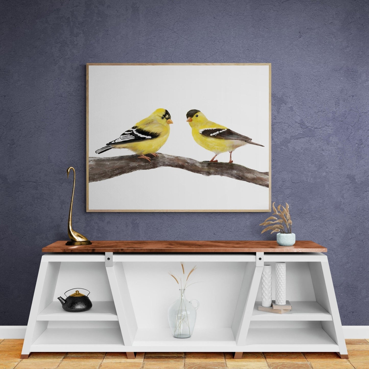This beautiful art print captures a charming pair of goldfinches perched side by side on a branch. With their vibrant yellow feathers and delicate markings, these birds add a touch of natural elegance to any space. Ideal for bird enthusiasts, nature lovers, and art collectors, this piece makes a serene and joyful addition to your home decor.
