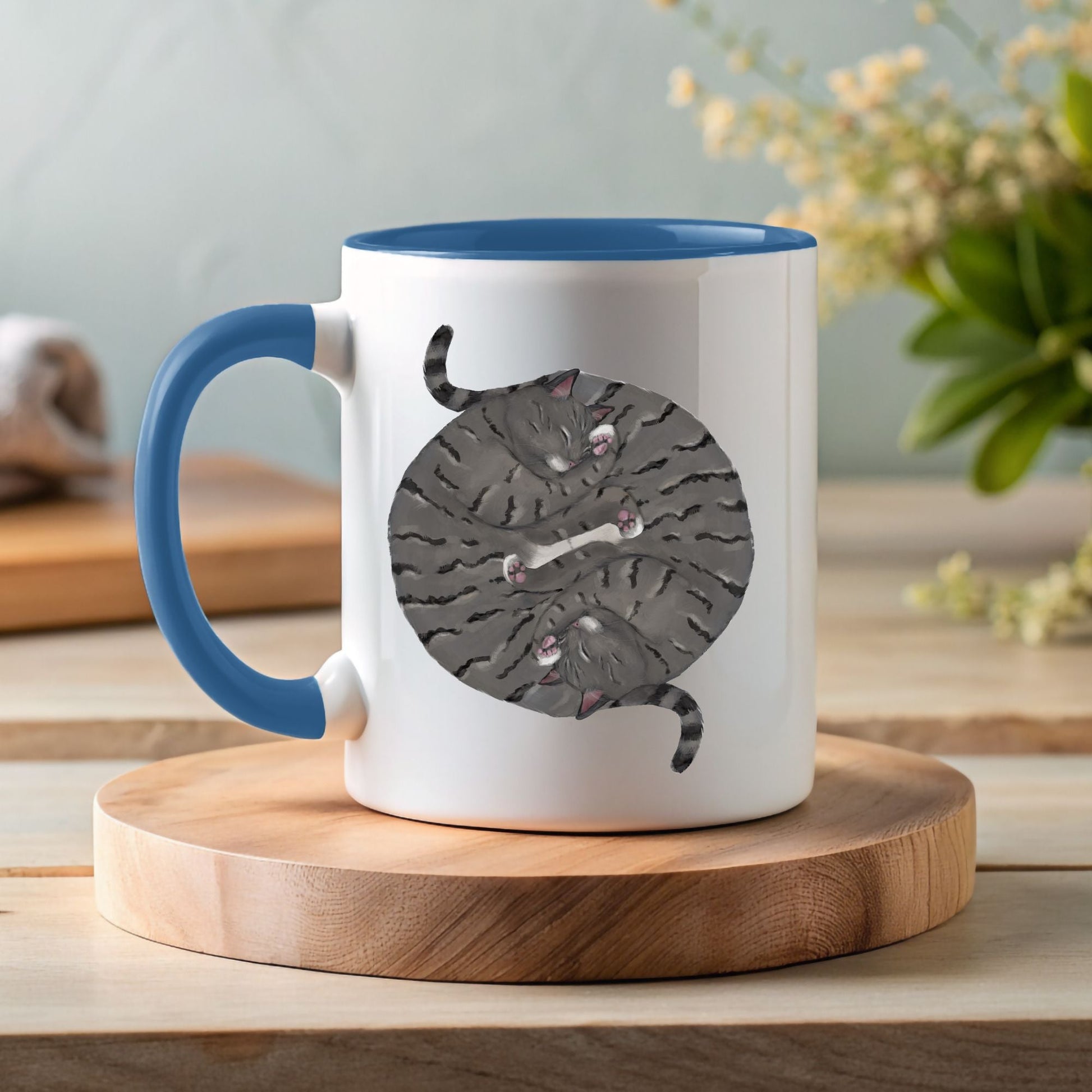 Start your morning with a smile and a dose of feline calm with this Gray Tabby Sleeping Cats Mug. Featuring two snuggled-up gray tabby cats napping in a perfect circle, this cozy design is ideal for cat lovers who cherish peaceful moments with their furry companions.