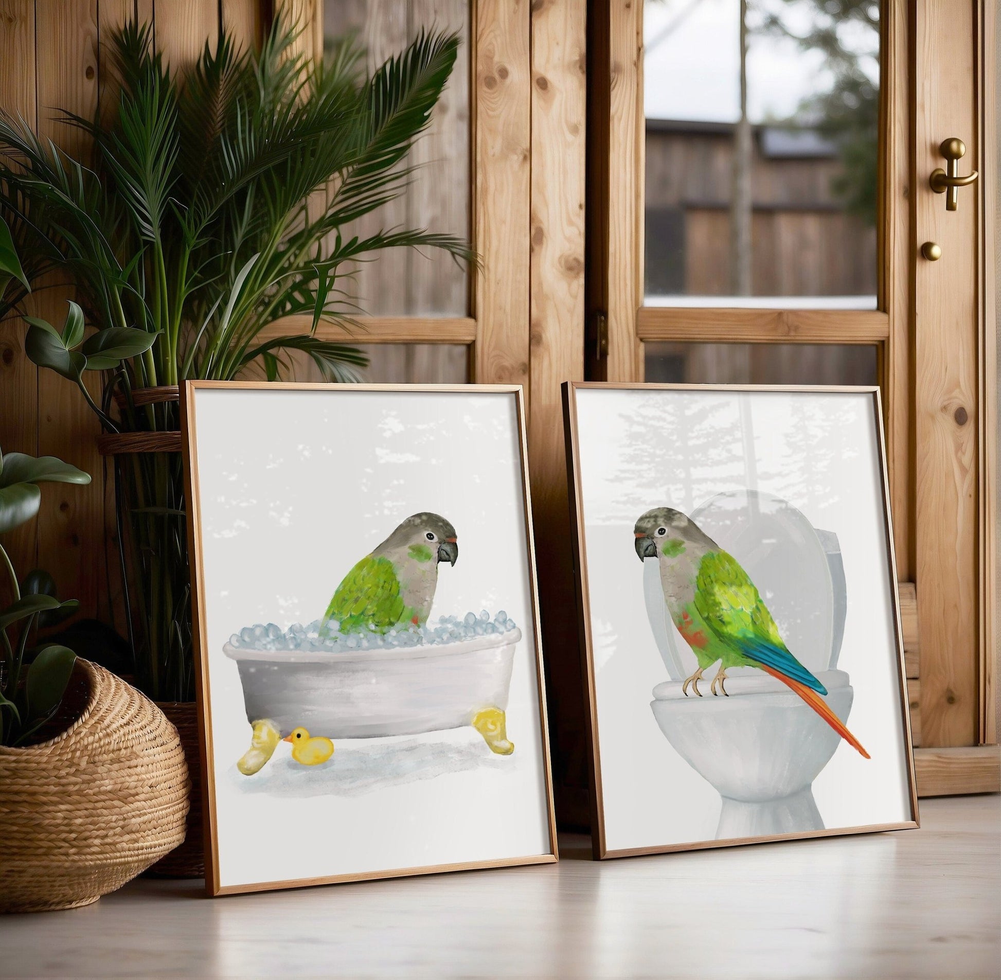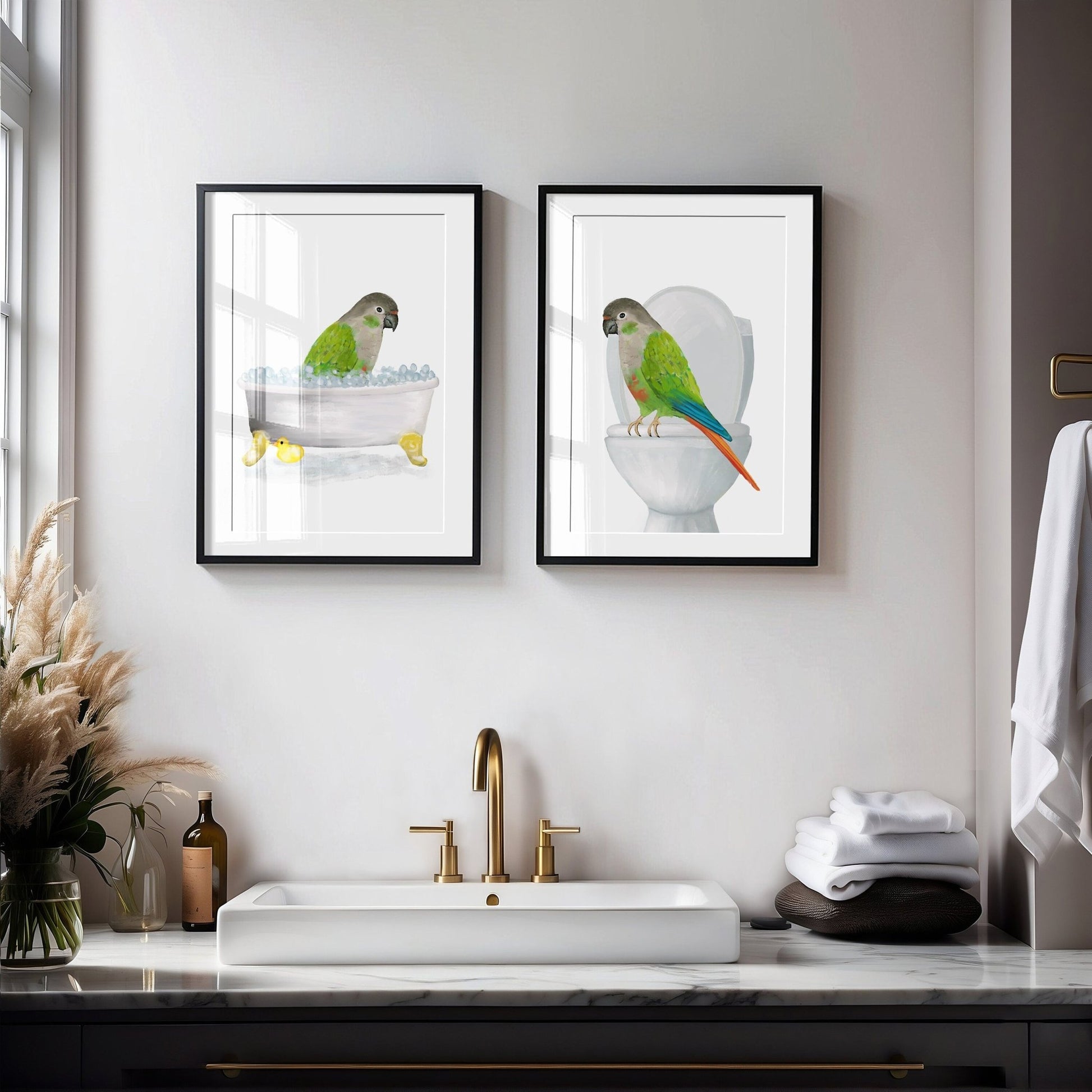 Green Cheek Conure Parrots in bathroom set of 2 illustration ART PRINT. It’s printed after my original artwork.