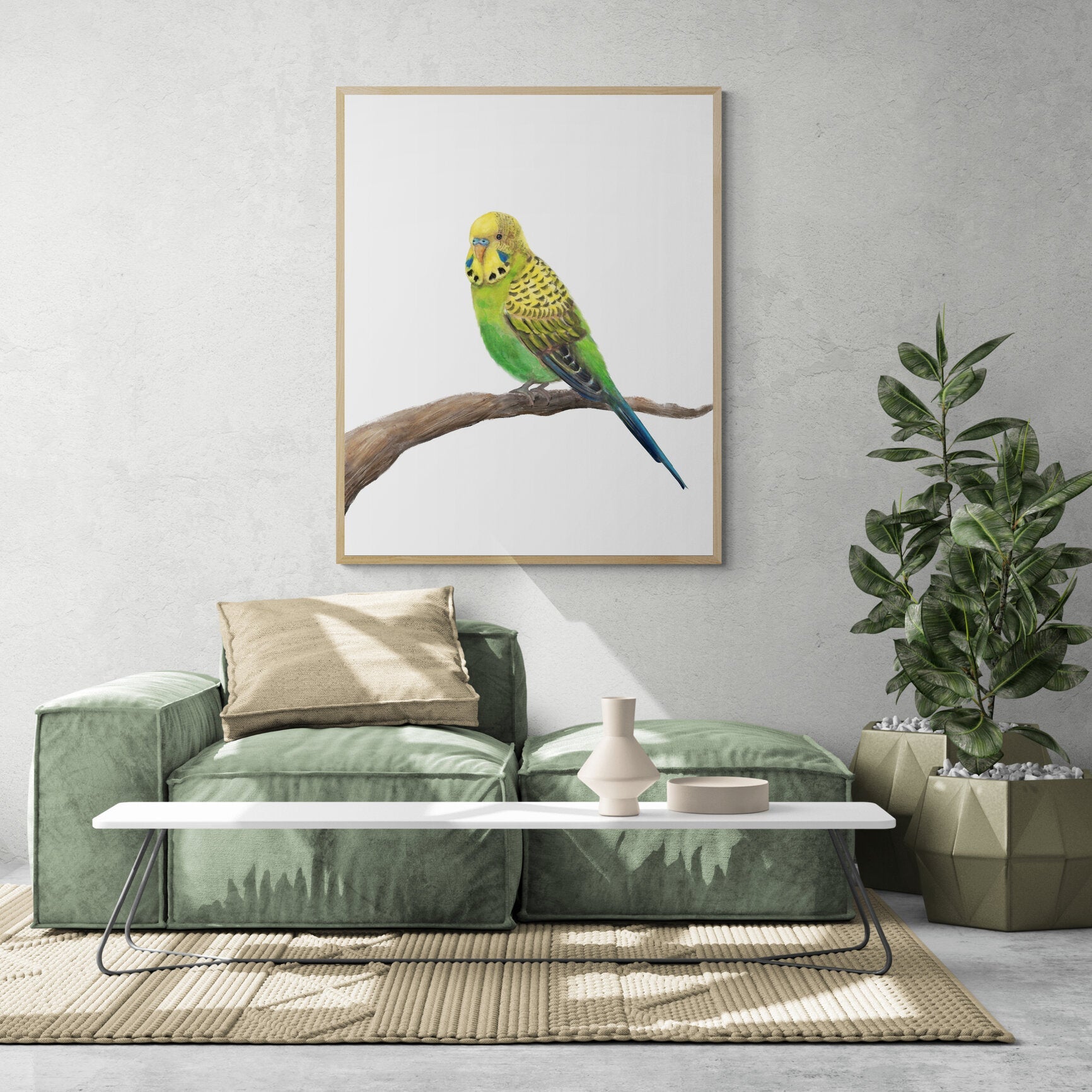 Green Budgie on Branch Art Print – Vibrant Bird Decor for Nature Lovers