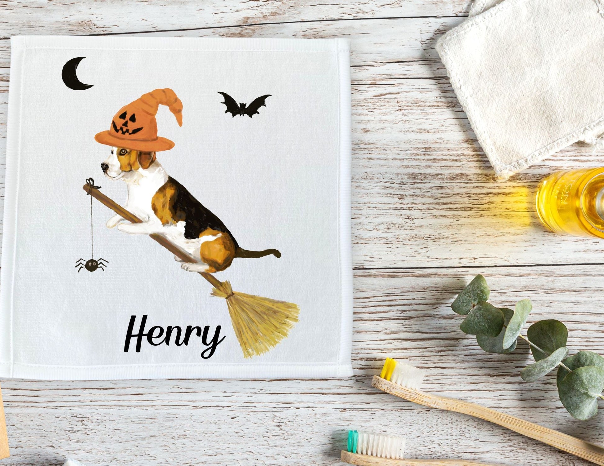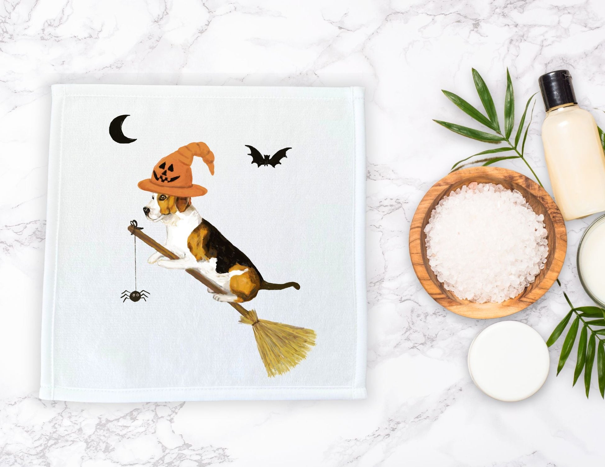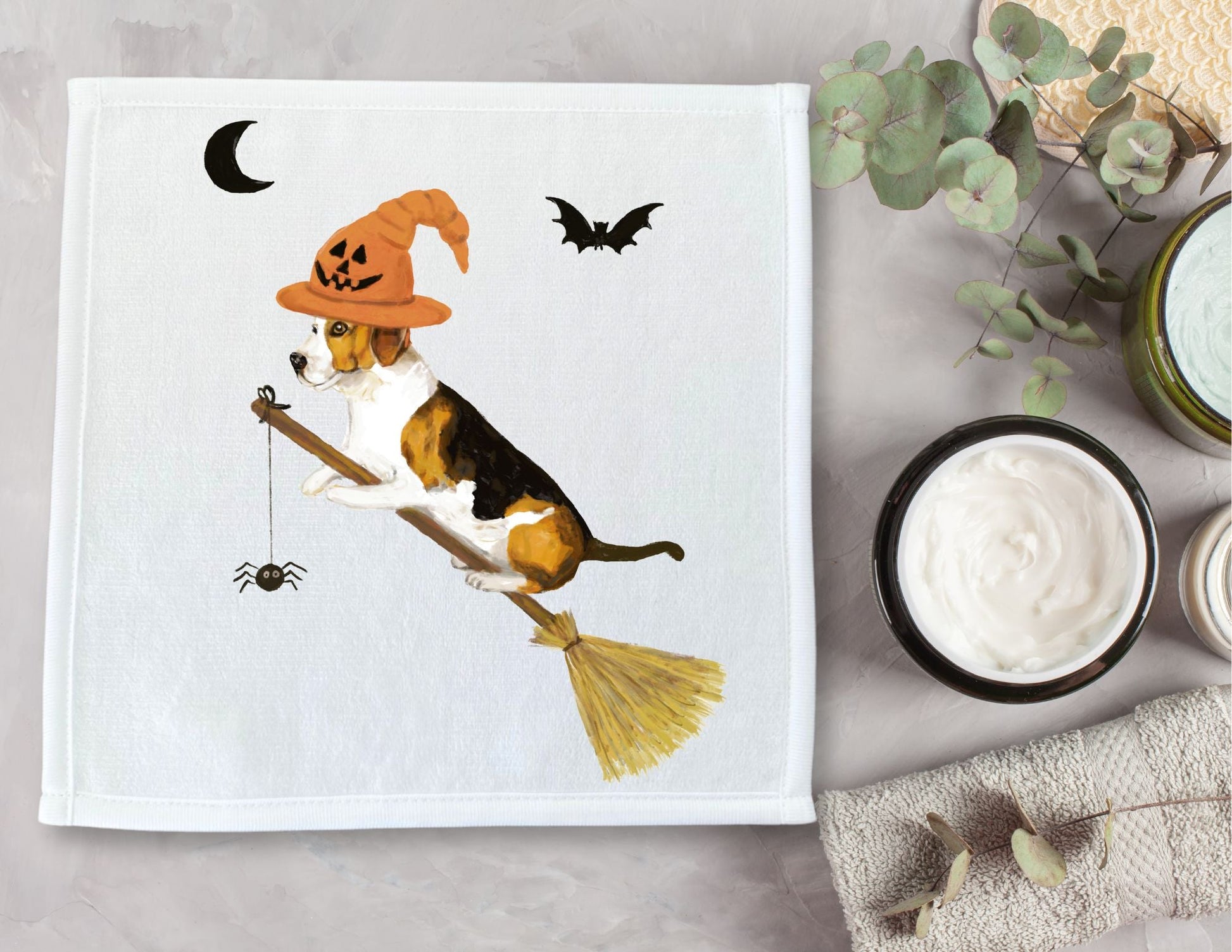Add a dash of spooky charm to your home with this playful washcloth featuring a beagle dressed as a witch, flying on a broomstick under a crescent moon. With an orange pumpkin hat and a dangling spider, this design by Harika Altungun captures Halloween fun with a canine twist. Perfect for dog lovers and festive souls, it brings seasonal delight to any room or gift basket.