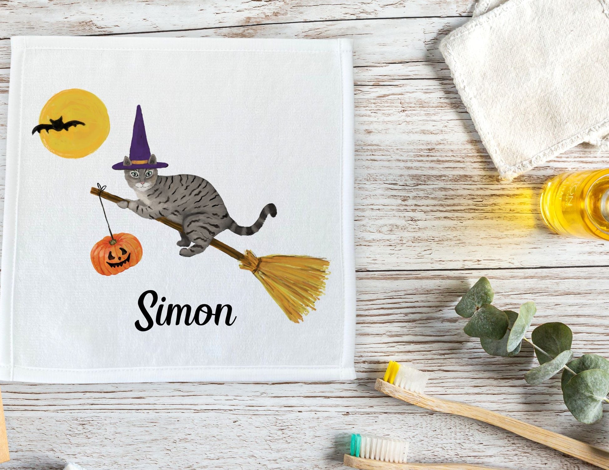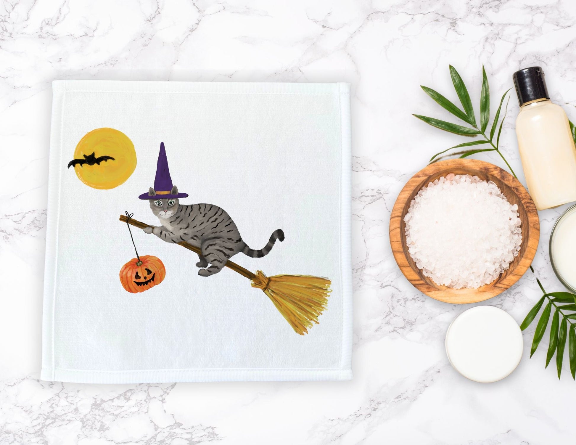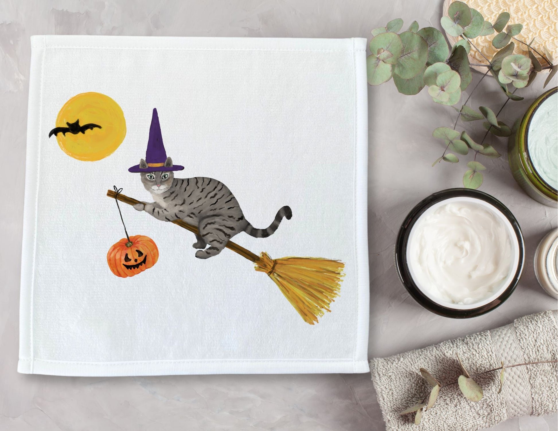 Embrace the magic of spooky season with this delightful washcloth featuring a gray tabby cat soaring through the night sky on a broomstick. With a purple witch hat, jack-o’-lantern in paw, and a bat flying across a golden moon, this playful design by Harika Altungun brings Halloween charm with a whimsical feline twist. Whether for your own festive decor or as a quirky seasonal gift, this washcloth will cast a spell of joy.
