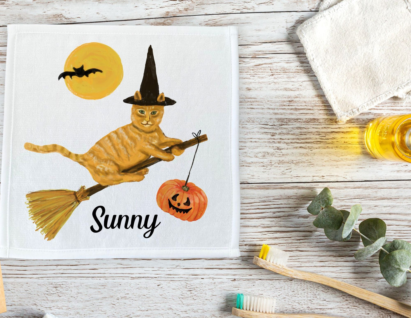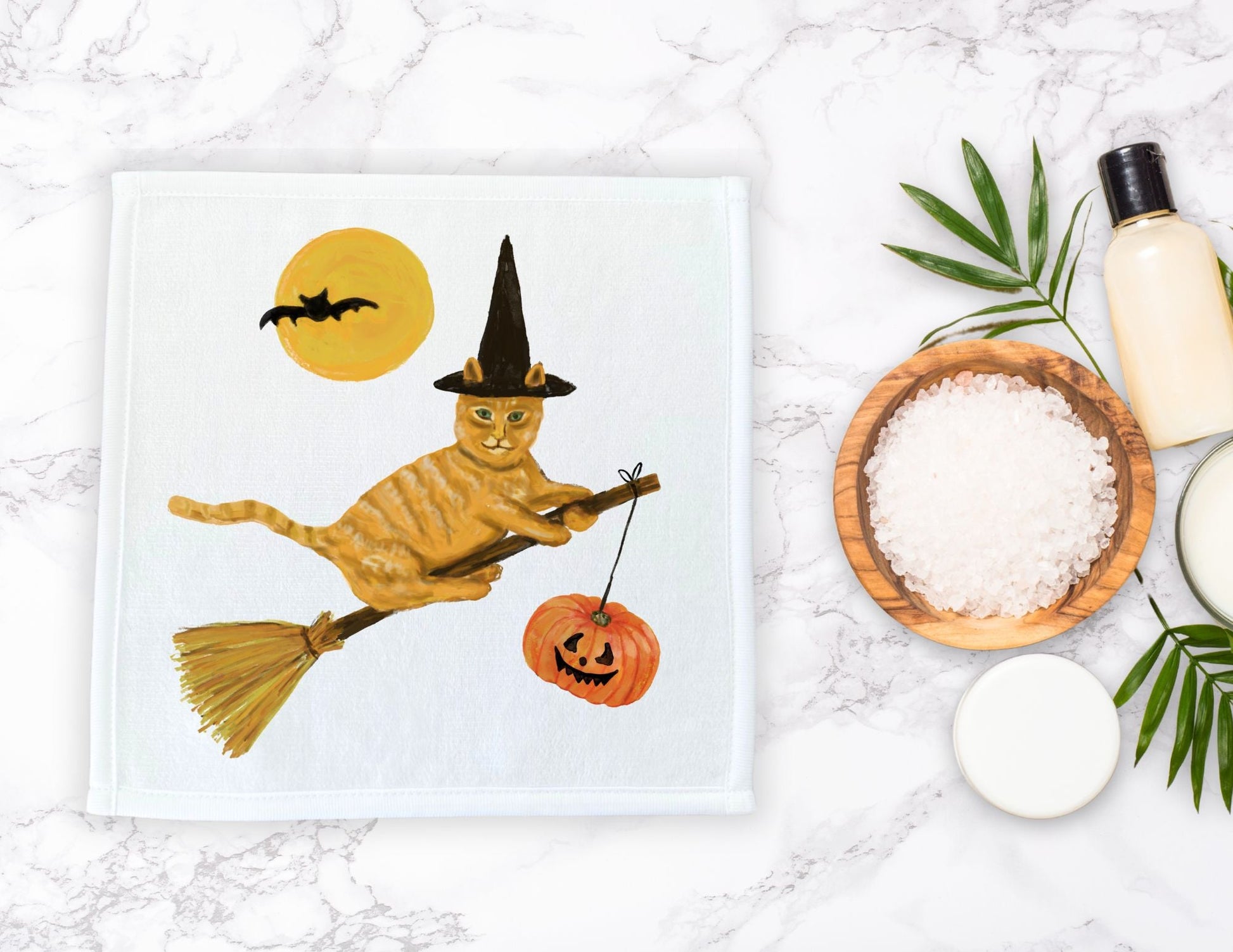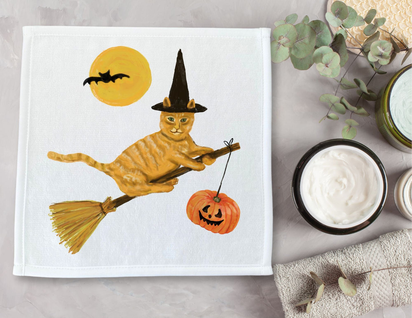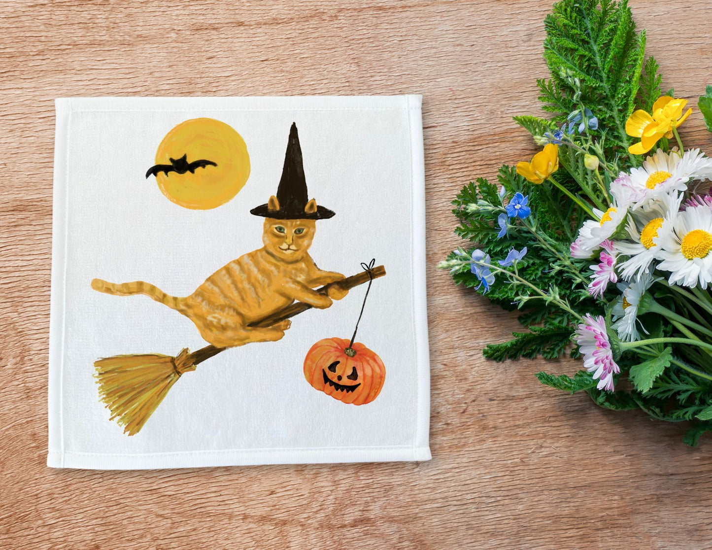 Celebrate spooky season with this fun and whimsical washcloth featuring an orange tabby cat dressed as a witch, flying across the sky on a broomstick. Illustrated by Harika Altungun, this design captures Halloween charm with playful details—a pointed hat, jack-o’-lantern, bat, and a bright yellow moon. A perfect seasonal accent or gift for cat lovers and Halloween enthusiasts alike!