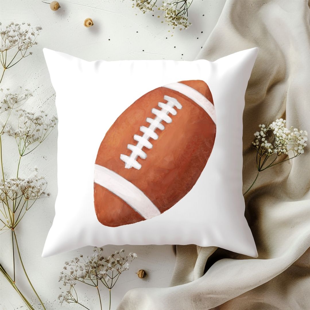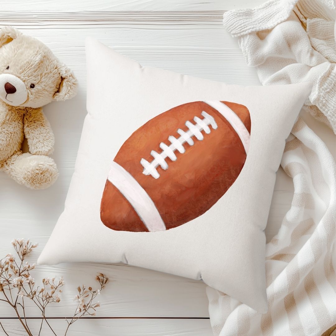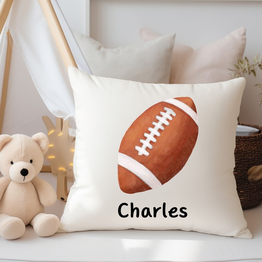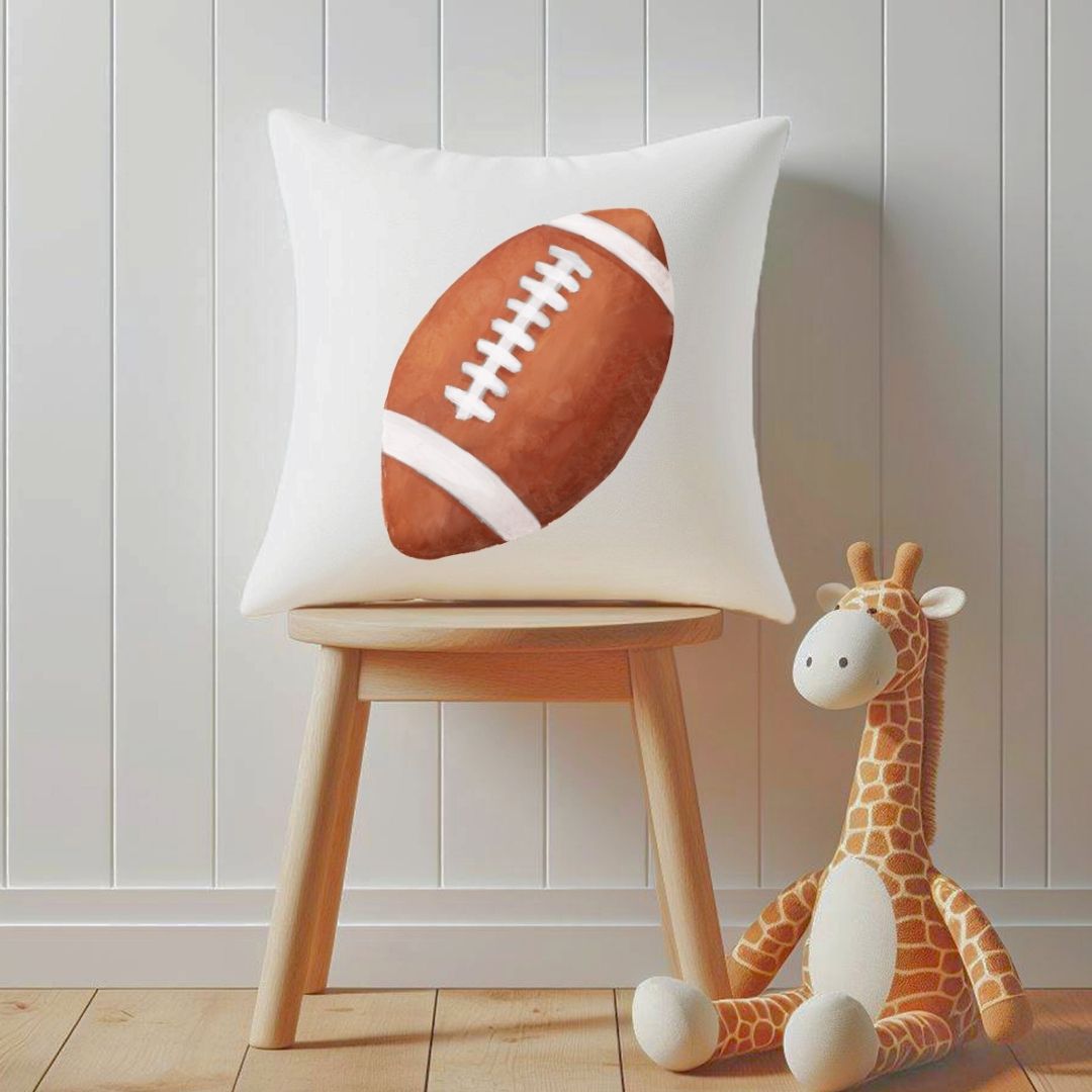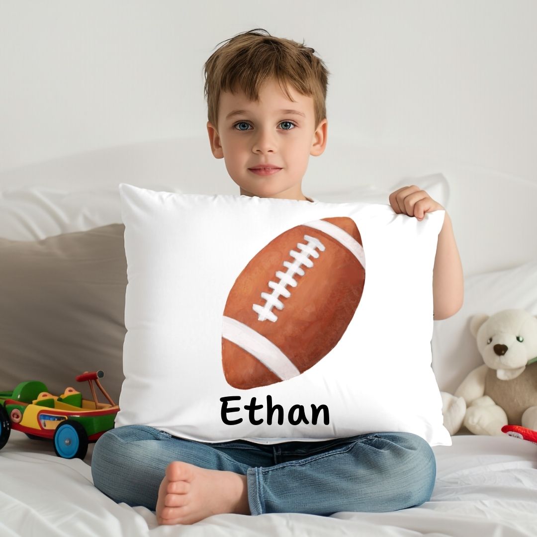 Score a touchdown with this sporty pillow featuring a classic football illustration. Perfect for young athletes and football fans, this design adds a fun and athletic touch to any space. Personalize it with your child’s name to create a unique keepsake or a thoughtful gift for birthdays, baby showers, or any special occasion.