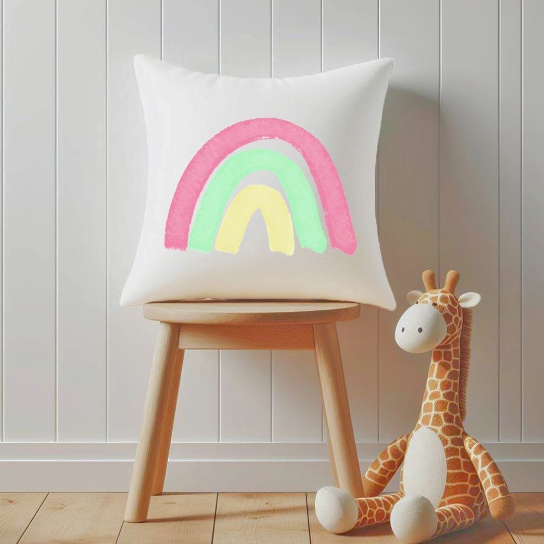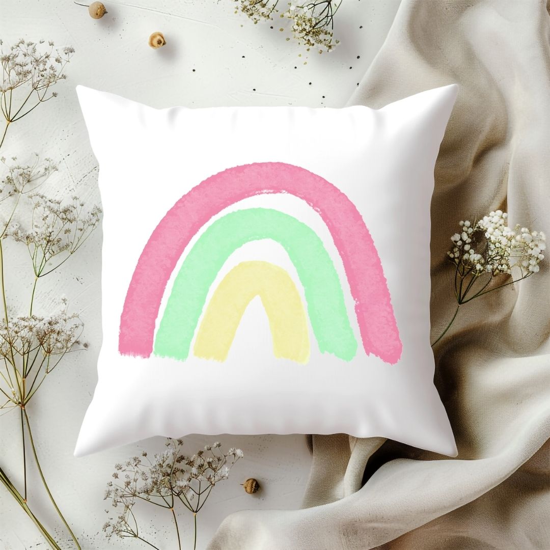 Add a splash of color to your child’s room with this delightful pillow featuring a soft pastel rainbow illustration. Perfect for creating a cheerful and calming atmosphere, this design is sure to brighten their space. Personalize it with your child’s name to create a unique keepsake or a thoughtful gift for birthdays, baby showers, or any special occasion.