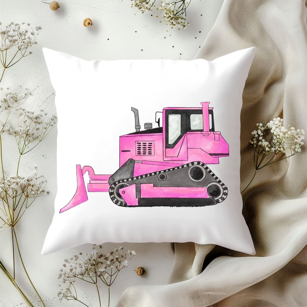 Add a splash of bold fun to your child’s room with this vibrant pillow featuring a cheerful pink bulldozer illustration. Perfect for kids who love construction vehicles and imaginative play, this design brings creativity and excitement to their space. Personalize it with your child’s name to make it a unique keepsake or a thoughtful gift for birthdays, baby showers, or any special occasion.