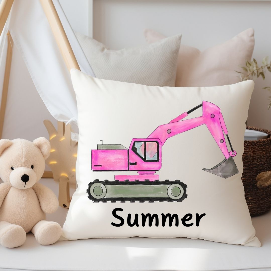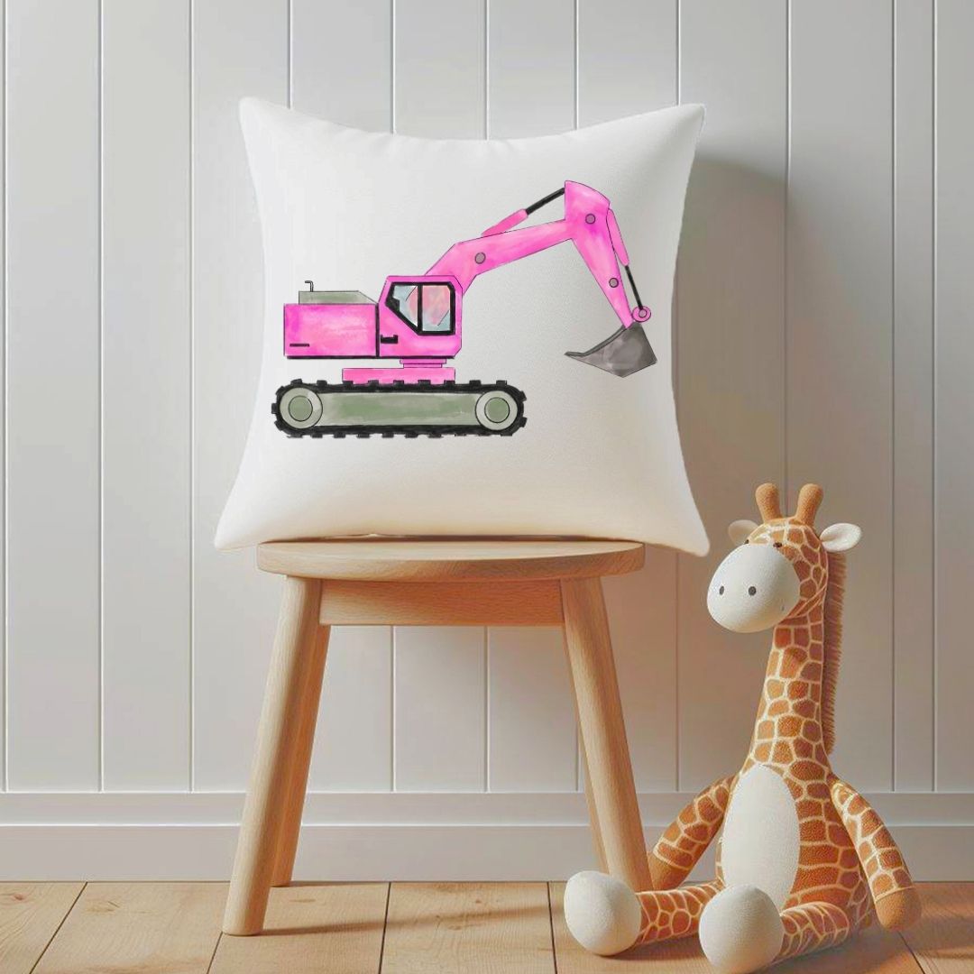 Dig into fun with this vibrant pillow featuring a playful pink excavator illustration. Perfect for kids who love construction vehicles and imaginative play, this design adds an adventurous and creative touch to their space. Personalize it with your child’s name to create a unique keepsake or a thoughtful gift for birthdays, baby showers, or any special occasion.