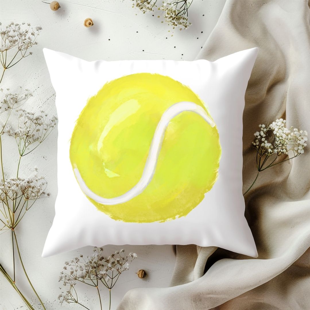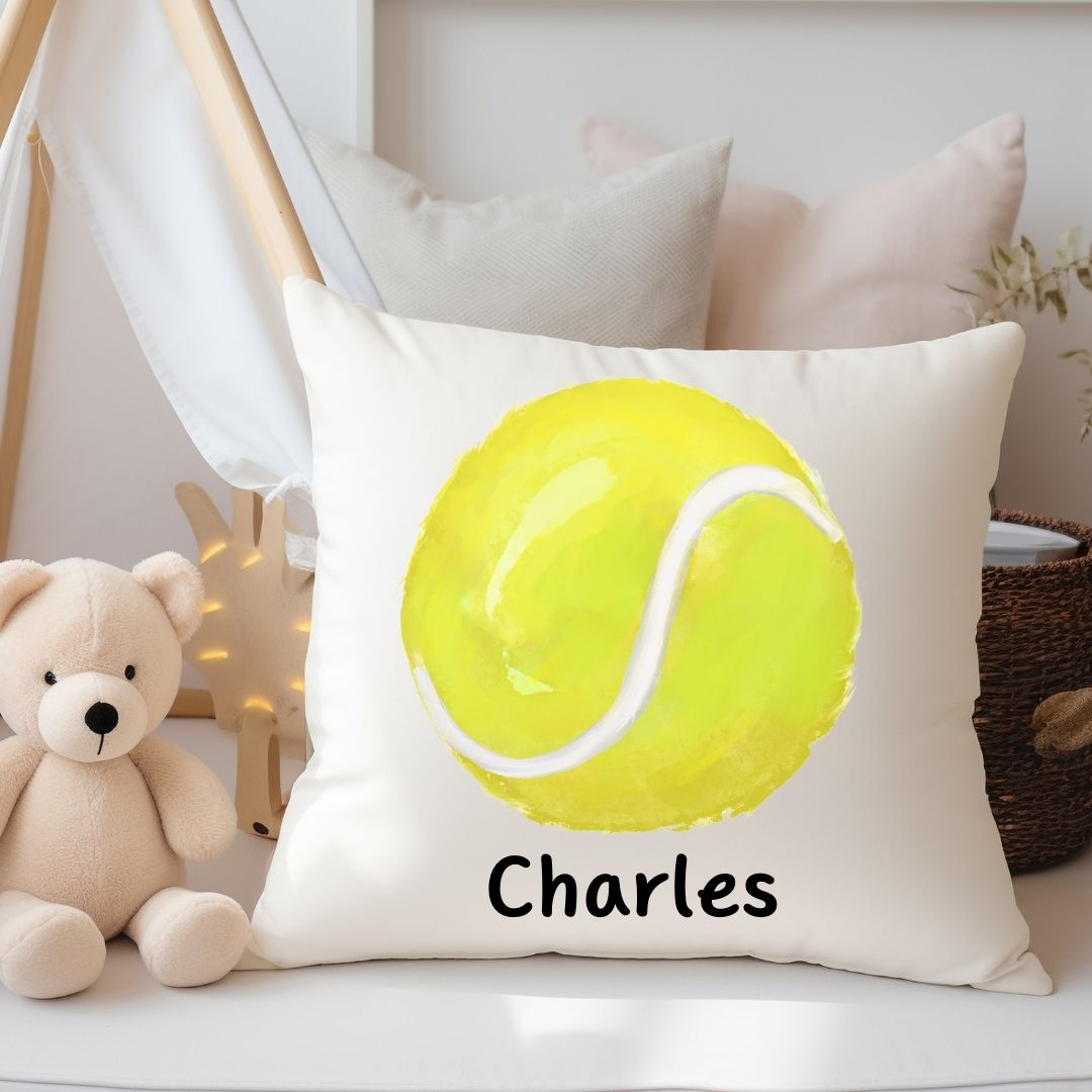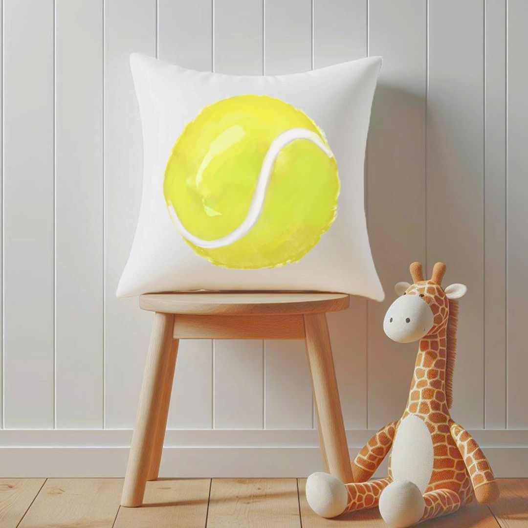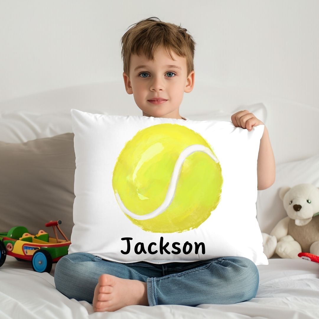 Serve up some fun with this sporty pillow featuring a bright and cheerful tennis ball illustration. Perfect for young sports enthusiasts and aspiring tennis players, this design adds a vibrant and athletic touch to any room. Personalize it with your child’s name to create a unique keepsake or a thoughtful gift for birthdays, baby showers, or any special occasion.