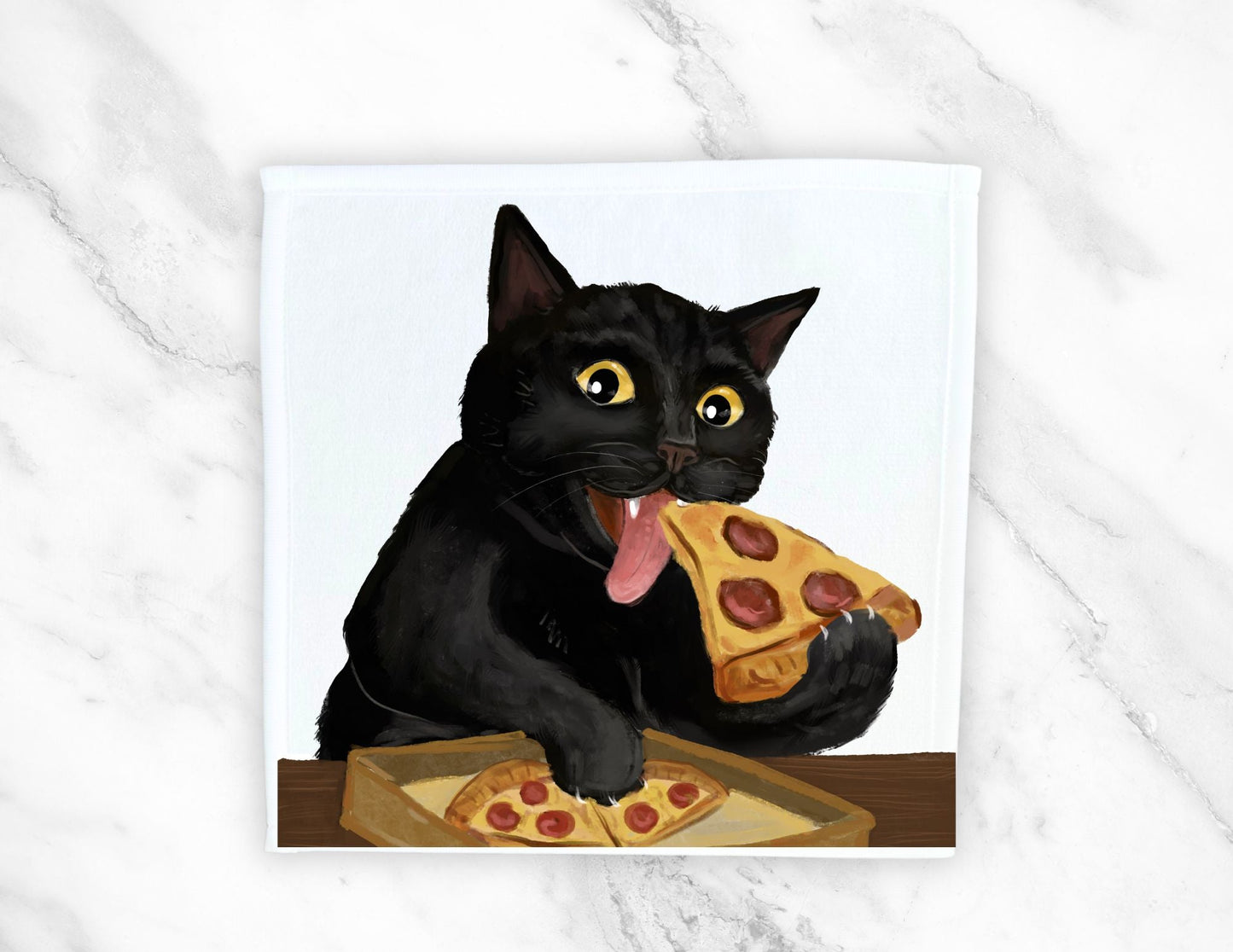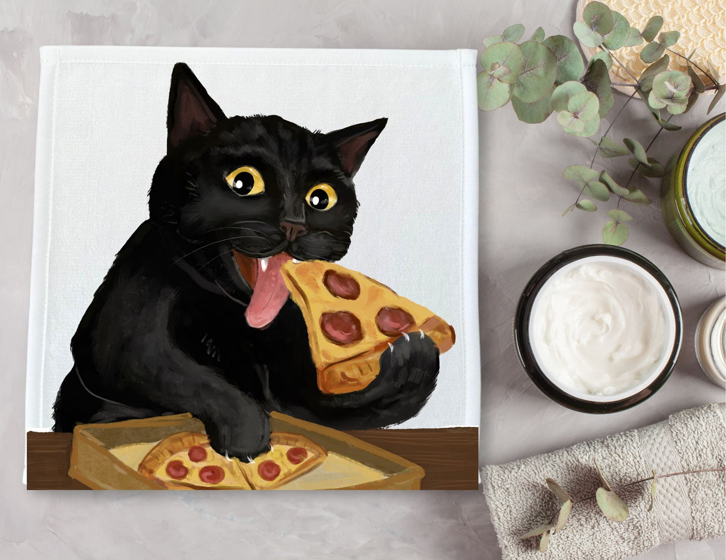 Meet your new favorite kitchen companion – a playful washcloth featuring a wide-eyed black cat enjoying a delicious slice of pepperoni pizza. Illustrated by Harika Altungun, this design adds a pop of humor and personality to your space. Perfect for foodies, cat lovers, and those who believe meals are better with feline flair. Whether for your own kitchen or as a quirky gift, this washcloth is guaranteed to bring smiles.