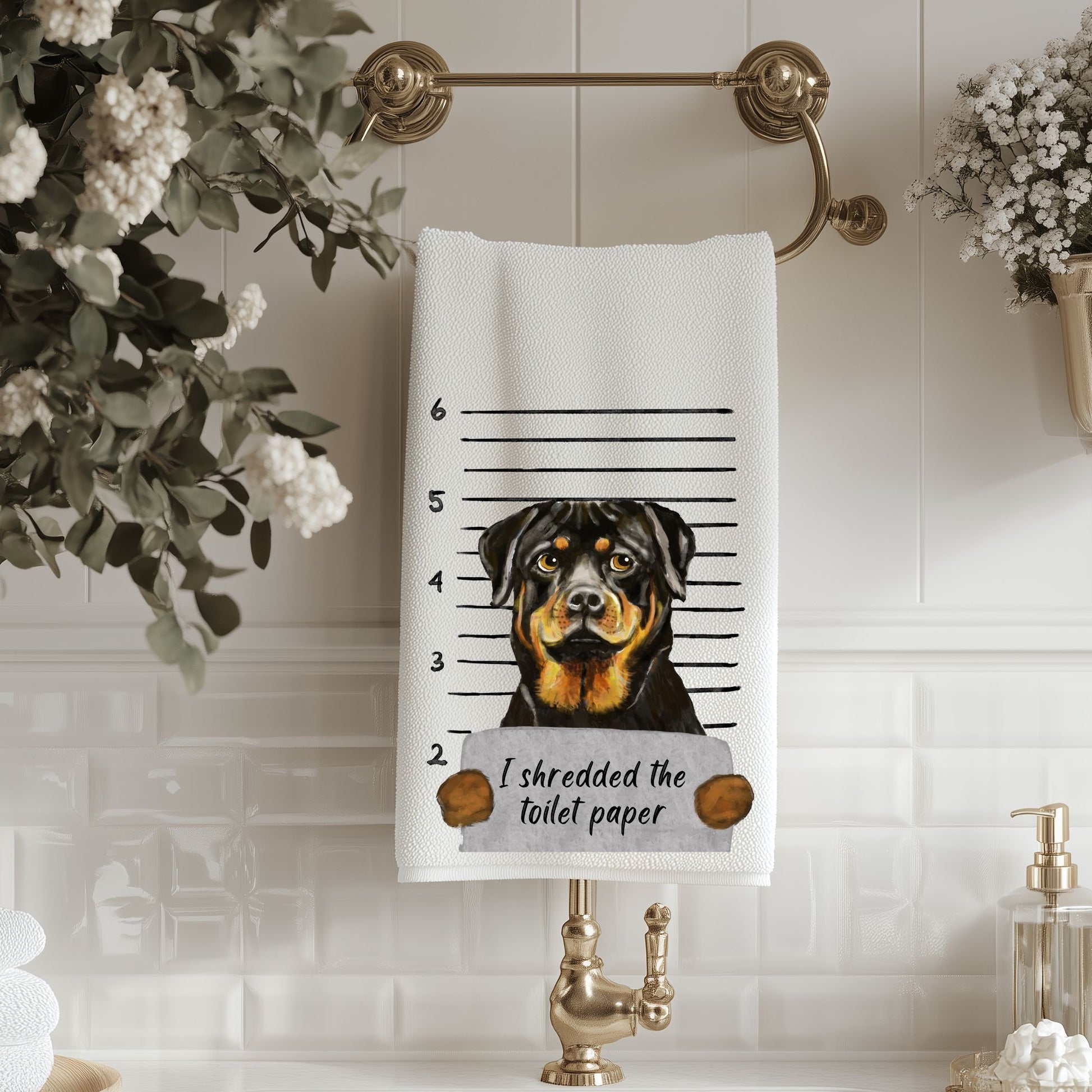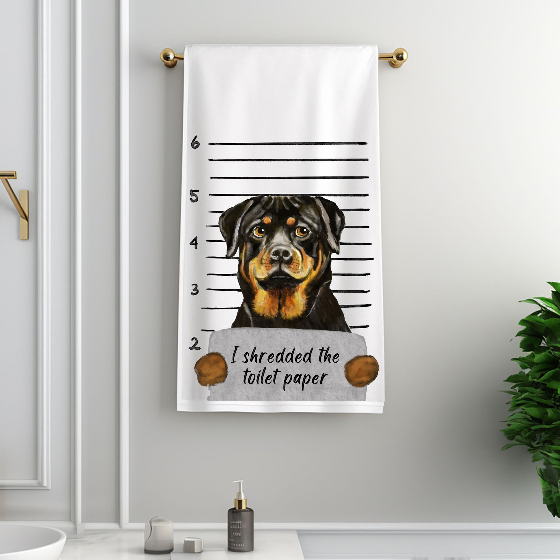 Add a bold touch of humor to your bathroom with this Funny Rottweiler Mugshot Bathroom Towel. The design features a charming Rottweiler posed in a playful police lineup while holding a sign that reads, “I shredded the toilet paper.” It’s a hilarious and relatable moment that perfectly captures the mischievous side of our beloved dogs.