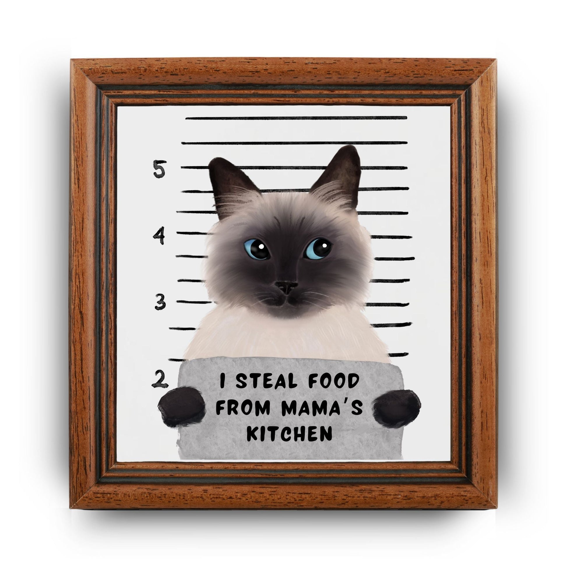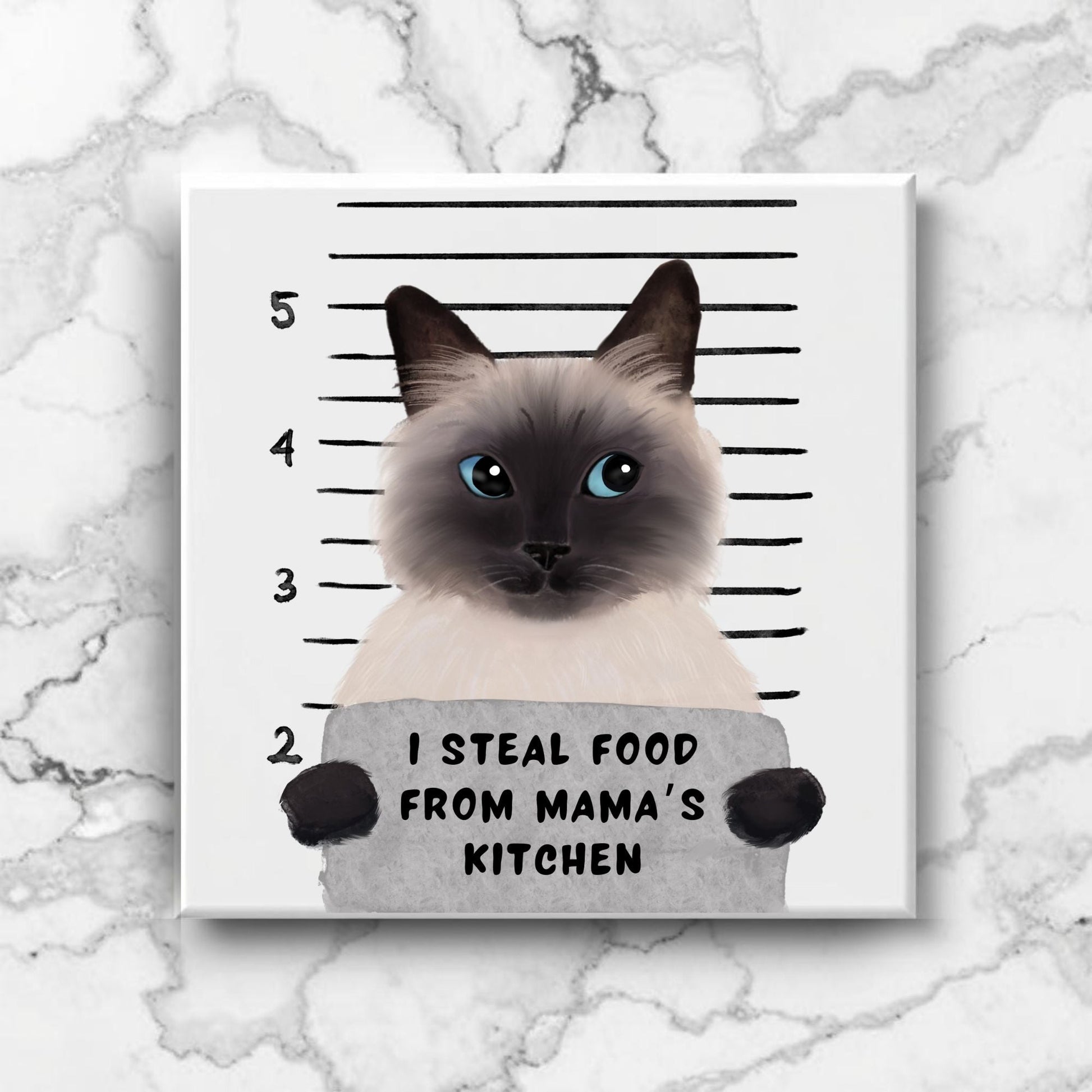 Caught in the act—yet still looking fabulous! This 4.25x4.25-inch ceramic tile features a charming Siamese cat in a cheeky mugshot, holding a sign that reads “I Steal Food From Mama’s Kitchen.” With its signature cream coat, deep points, and piercing blue eyes, this elegant troublemaker brings both beauty and humor to your space. Glossy finish ensures long-lasting color and charm. A purr-fect piece for Siamese lovers, cat parents, and kitchen pranksters alike!