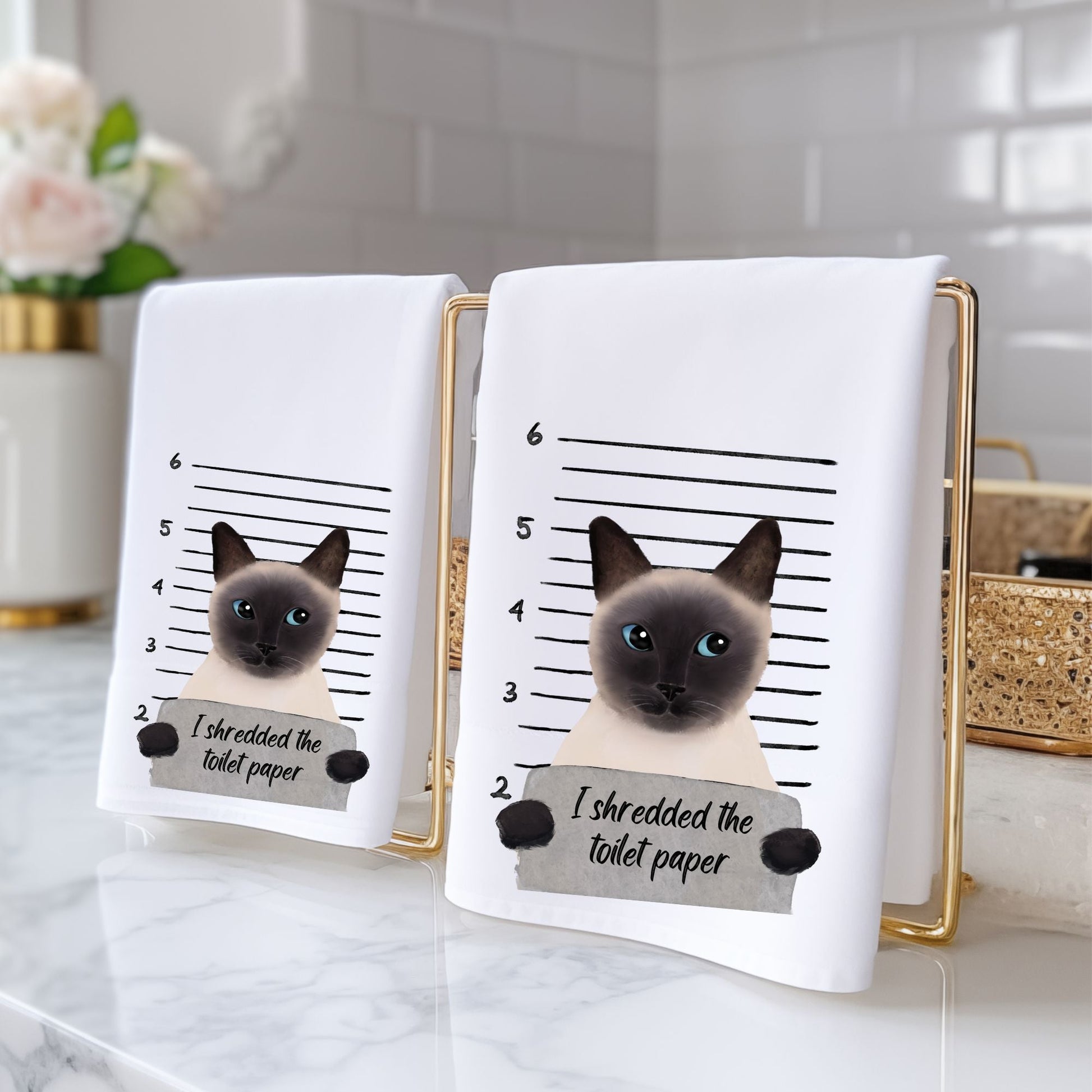 Bring some humor to your bathroom with this hilarious Siamese cat mugshot towel, featuring artwork by Harika Altungun. This cheeky feline, caught in the act with a sign confessing, “I shredded the toilet paper,” adds a playful and lighthearted touch to any cat lover's space. Perfect for those who adore mischievous kitties and want a fun twist in their decor.