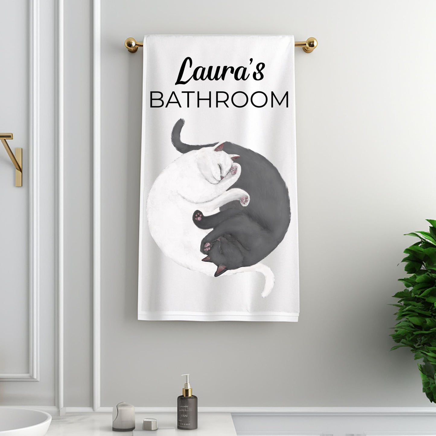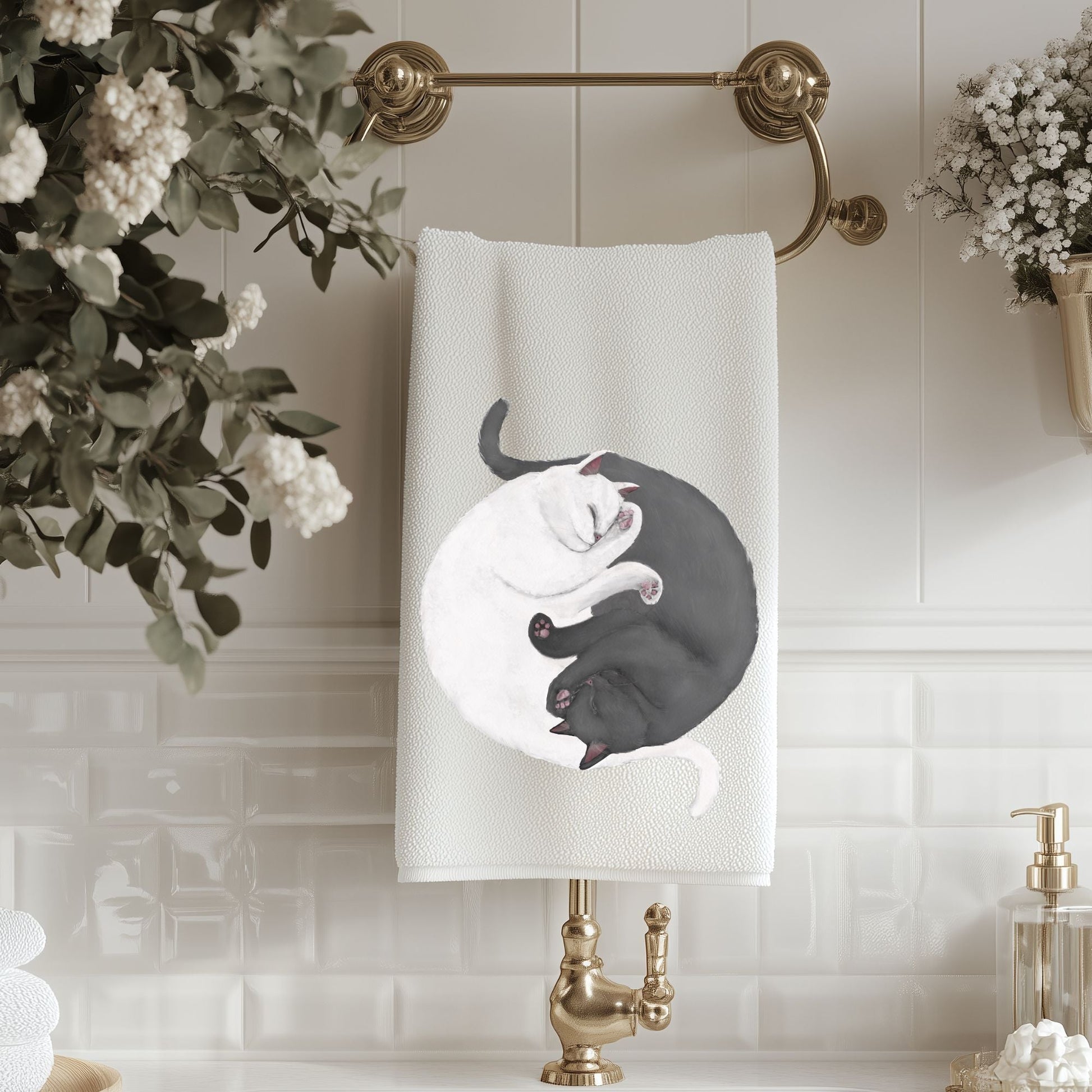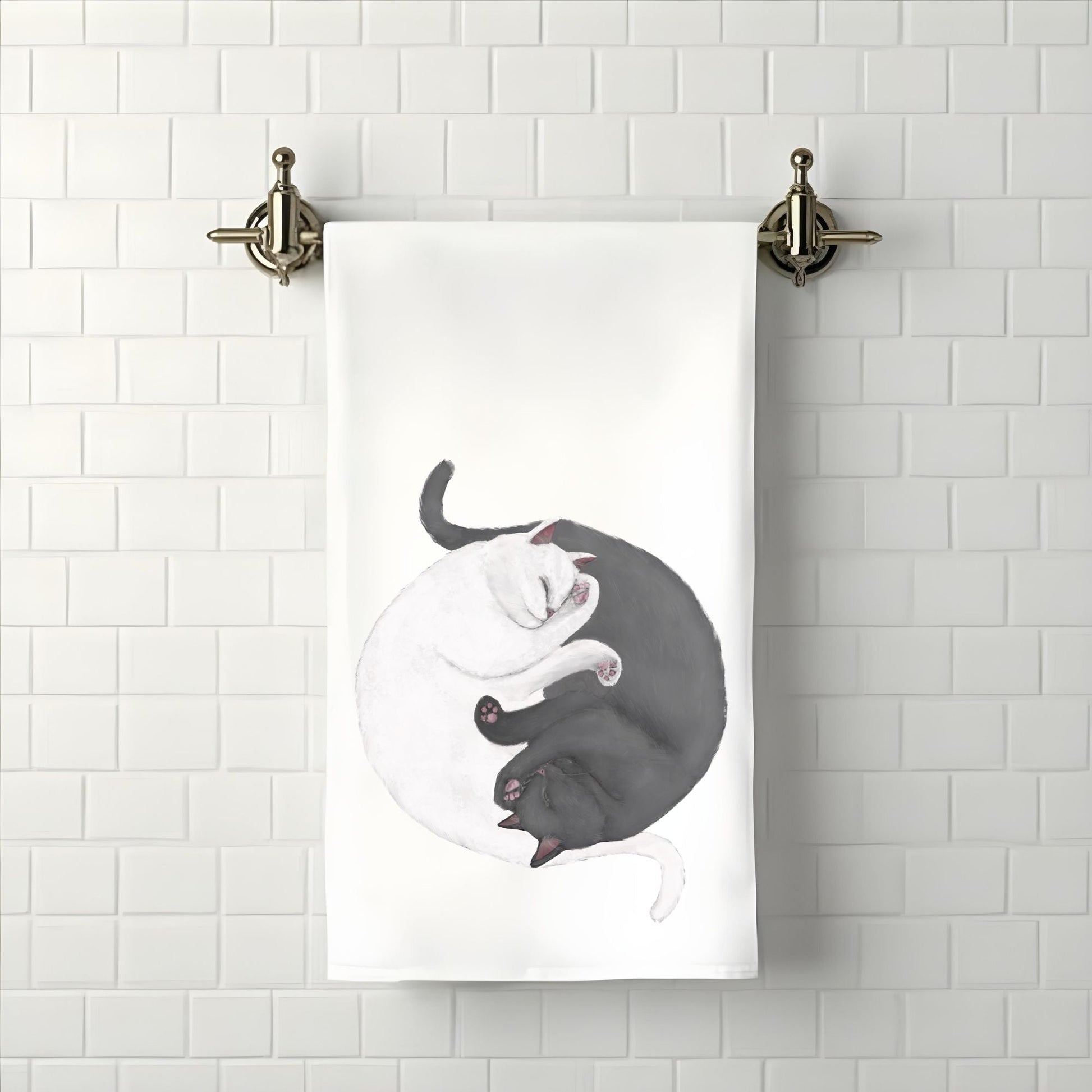 Add a serene and artistic touch to your bathroom with this sleeping cats towel, featuring artwork by Harika Altungun. The peaceful feline design captures two curled-up cats in a cozy embrace, making it a perfect addition for cat lovers and those who enjoy calming, minimalist decor.