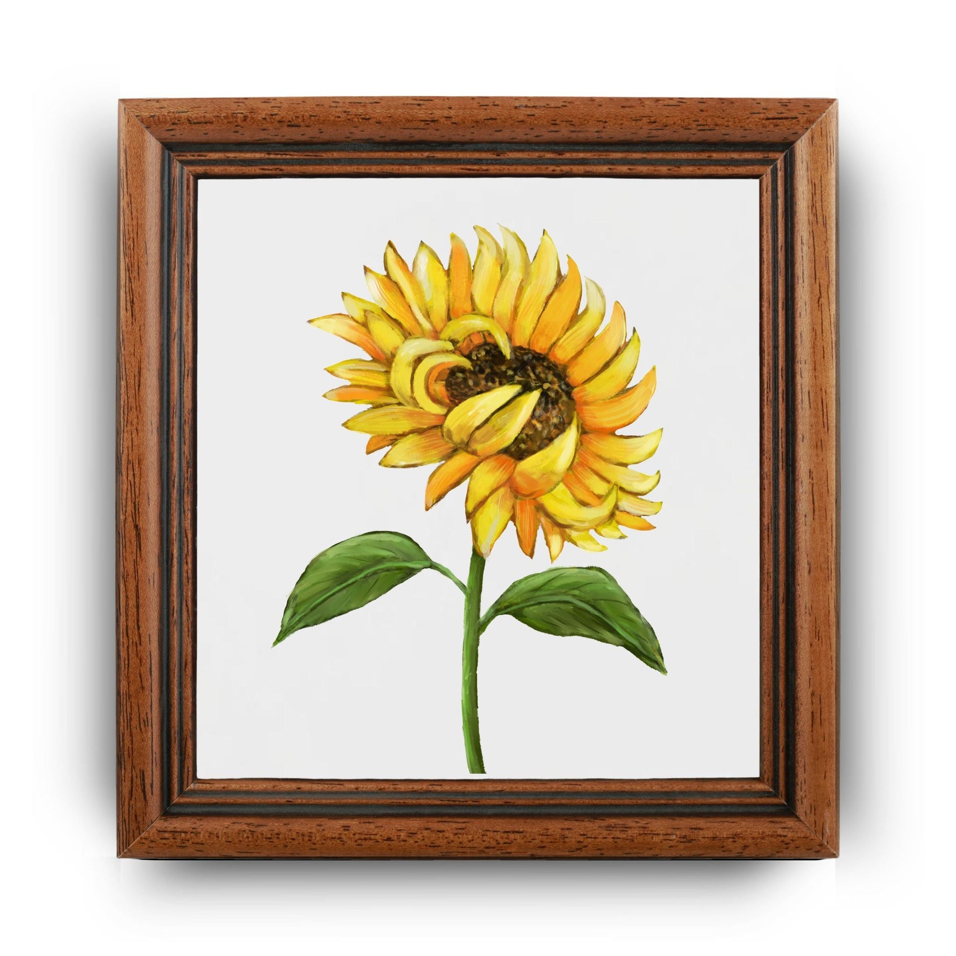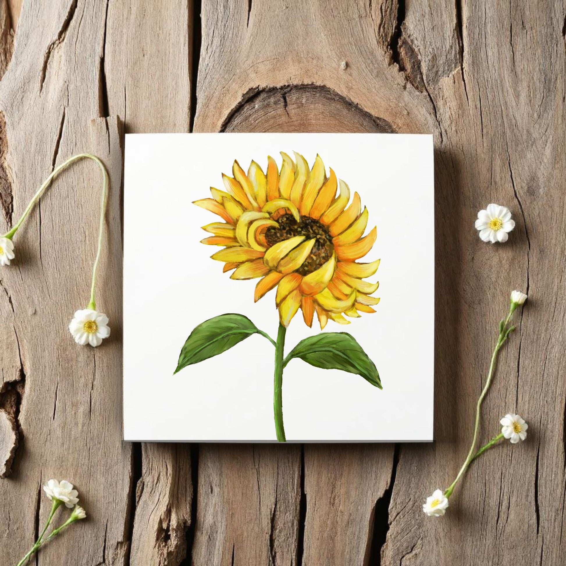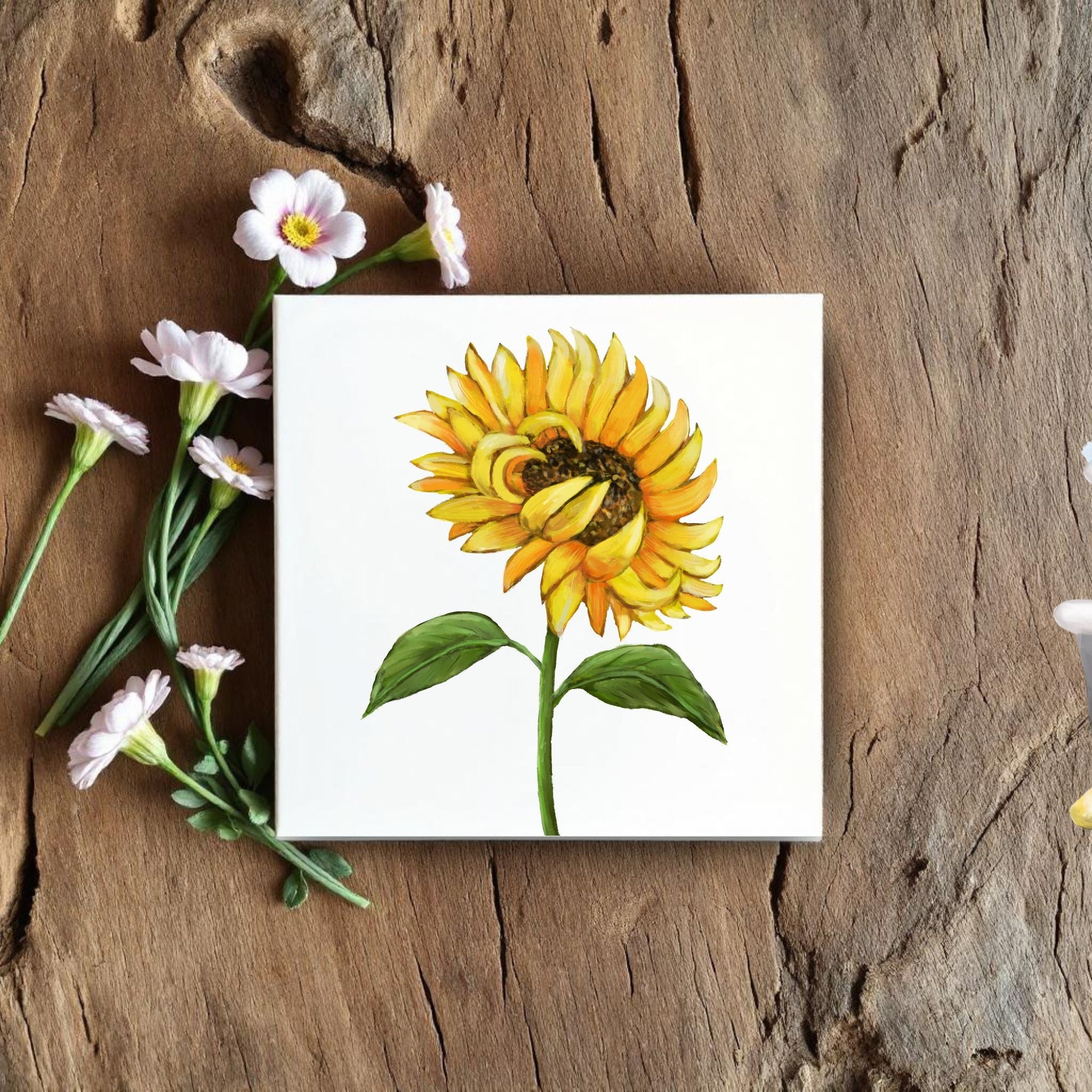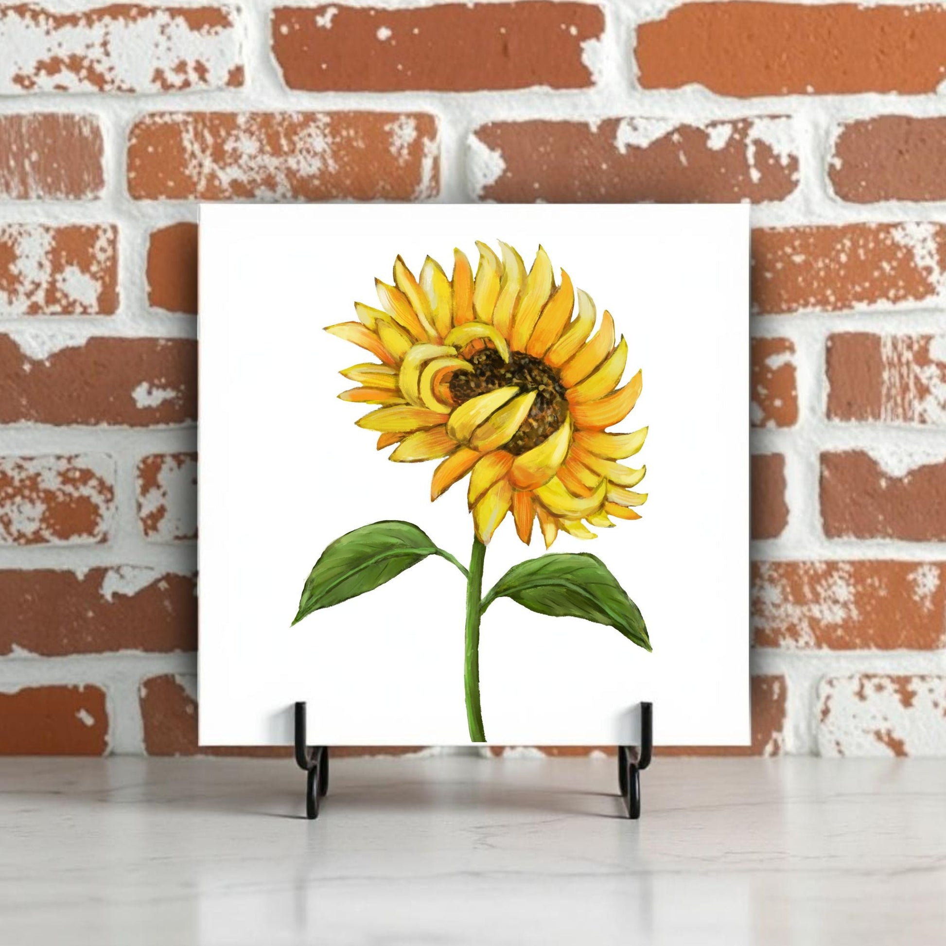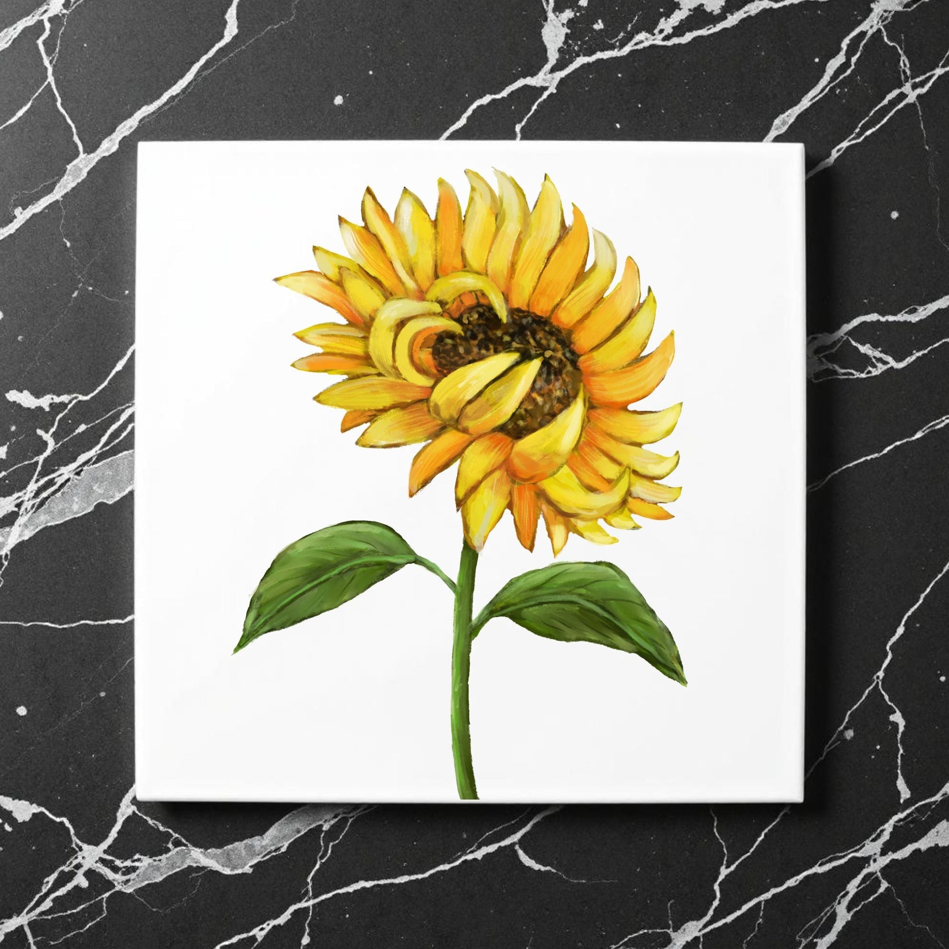 Bring warmth and positivity into your space with this 4.25x4.25-inch ceramic tile featuring a vibrant hand-painted sunflower. With golden yellow petals, a rich brown center, and lush green leaves, this illustration captures the essence of summer sunshine and natural beauty. Perfect as a wall accent, cheerful coaster, or thoughtful gift for flower lovers, this tile radiates happiness and charm. The glossy finish highlights the vivid colors and ensures durability for everyday use or display.