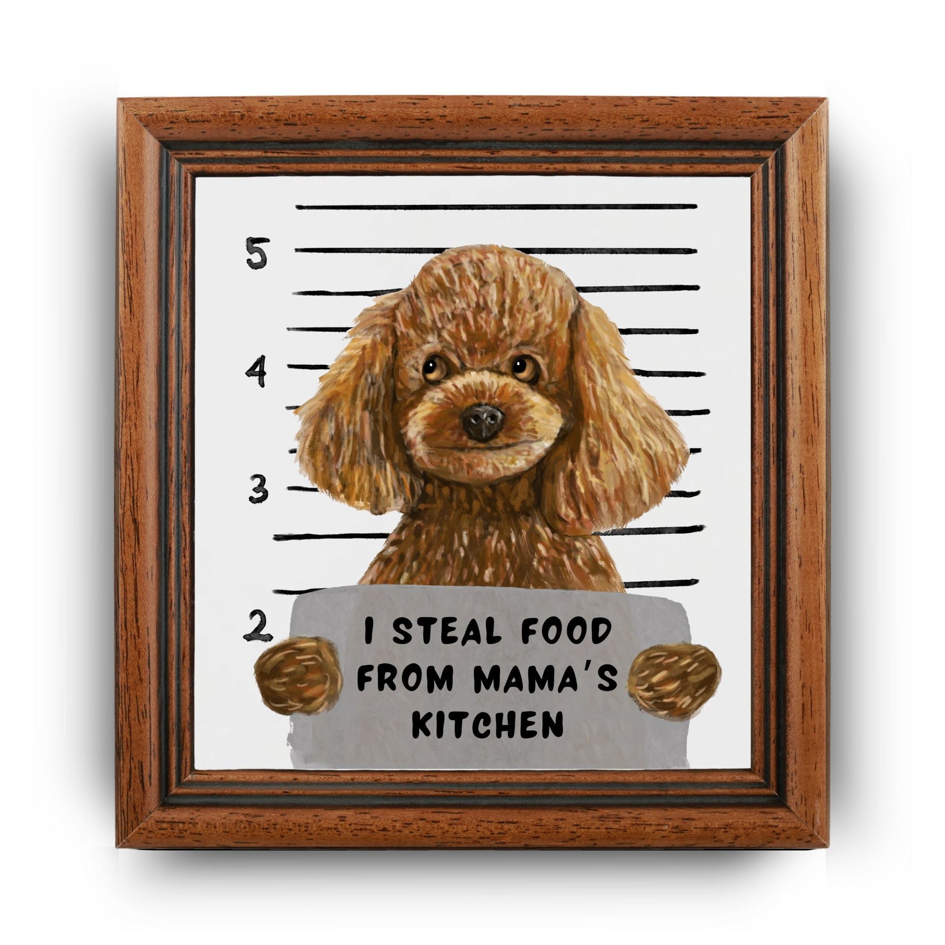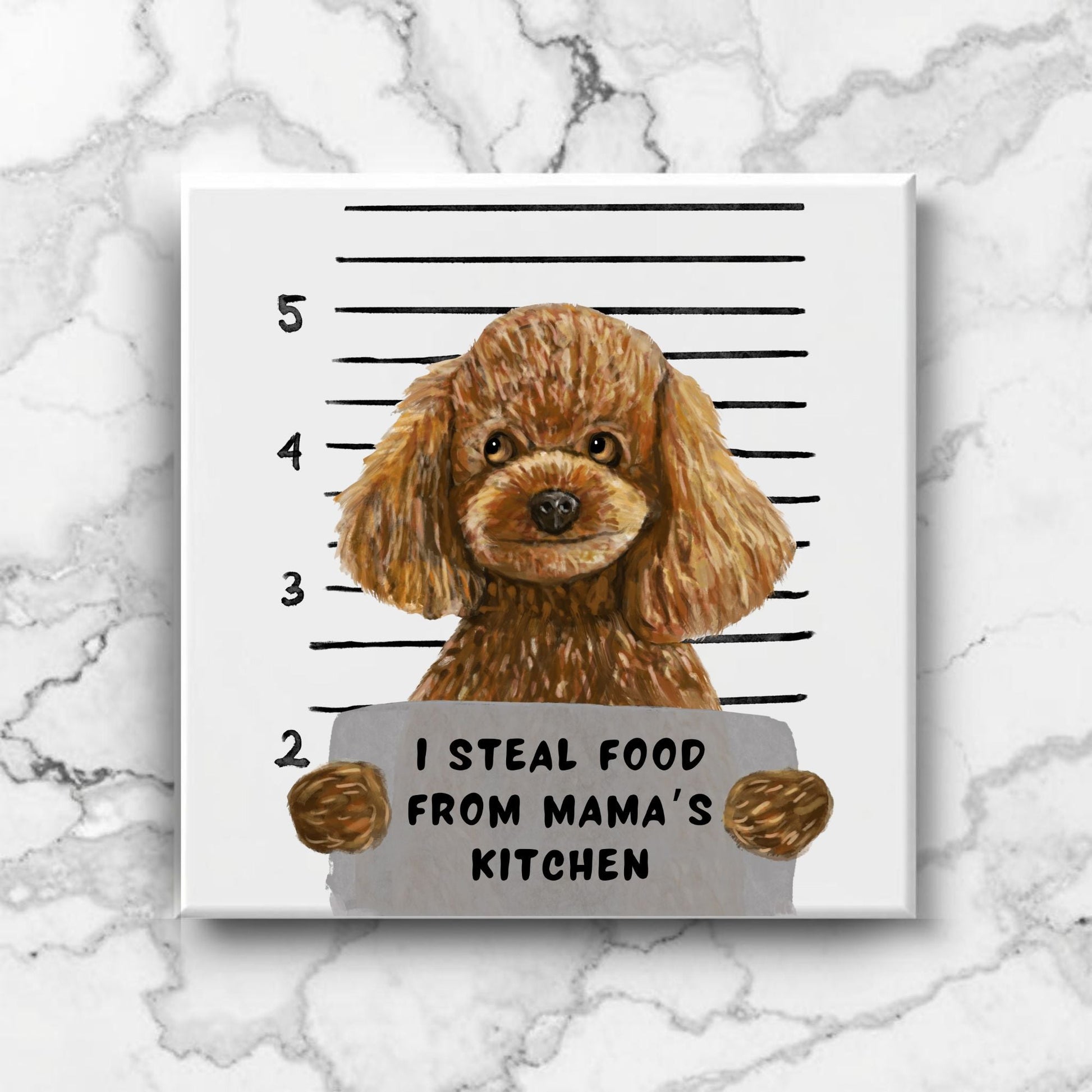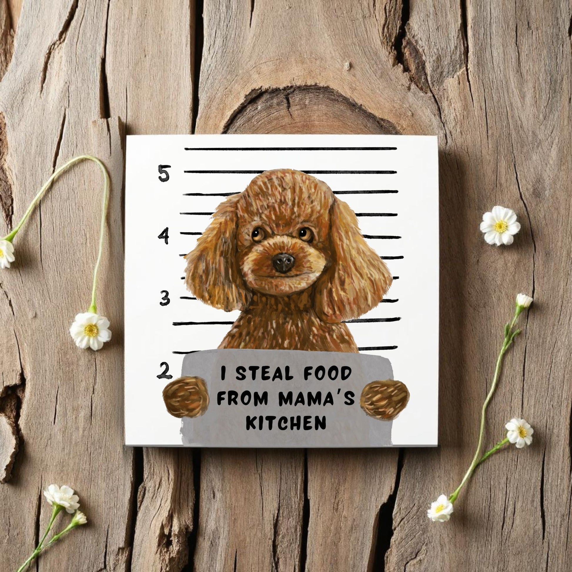 Fluffy, fabulous, and totally guilty! This 4.25x4.25-inch ceramic tile features an adorable Toy Poodle with big innocent eyes and a mugshot sign that reads: “I Steal Food From Mama’s Kitchen.” With its rich curls and sweet expression, this hand-painted tile brings a playful charm to any kitchen or pet-lover’s space. Glossy finish ensures durability and shine. A perfect gift for Toy Poodle fans or anyone who’s ever caught their pup mid-snack heist!