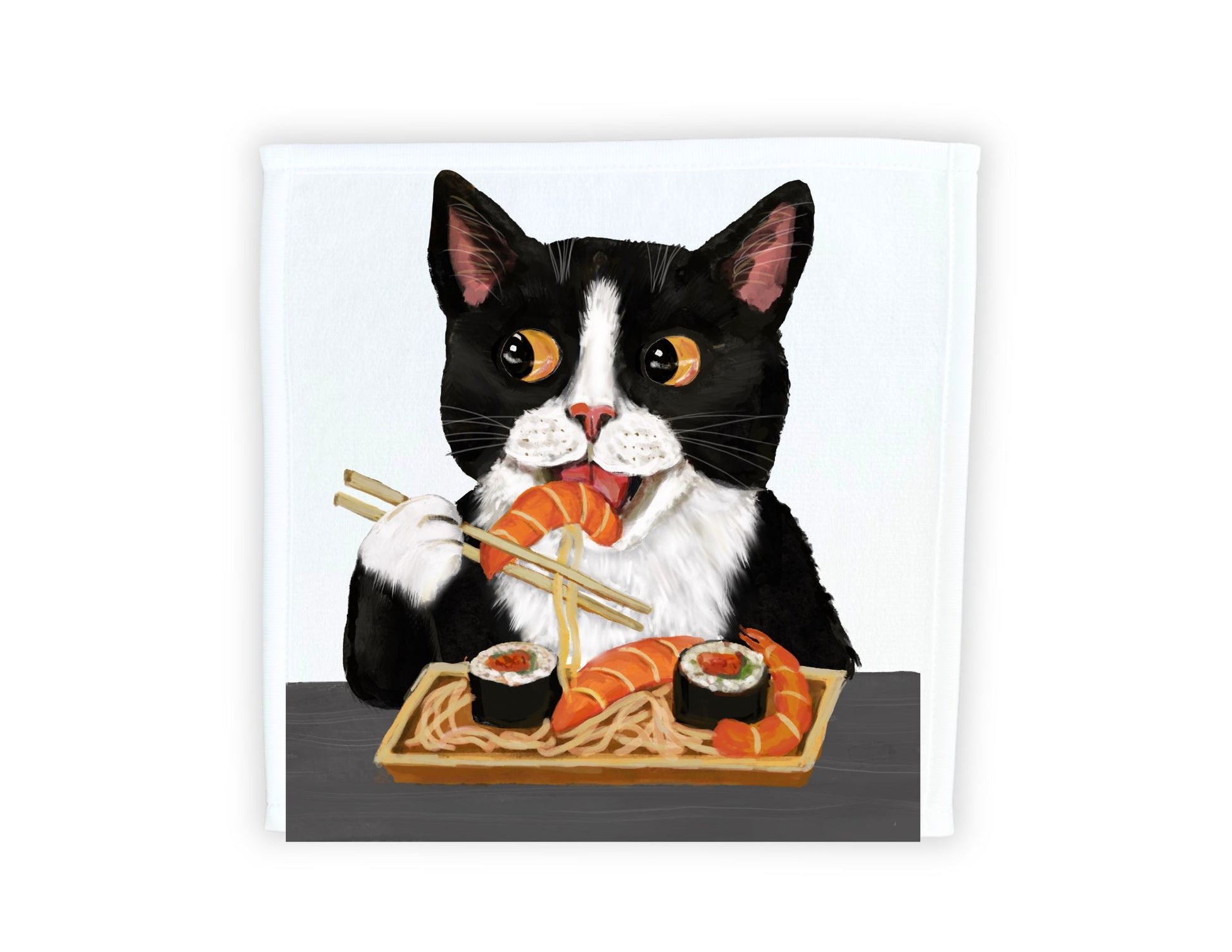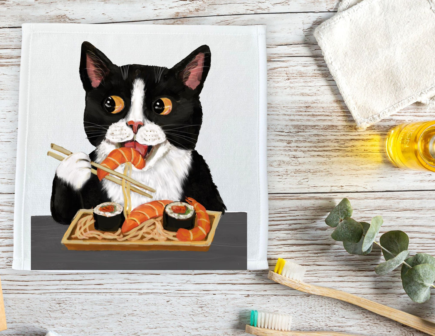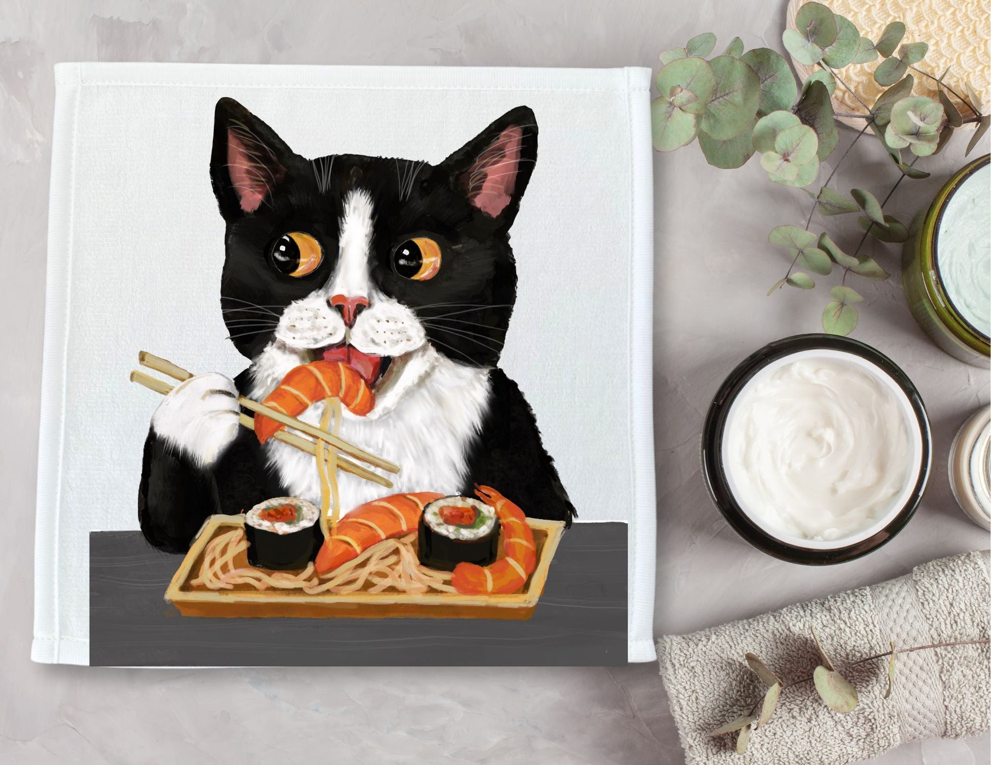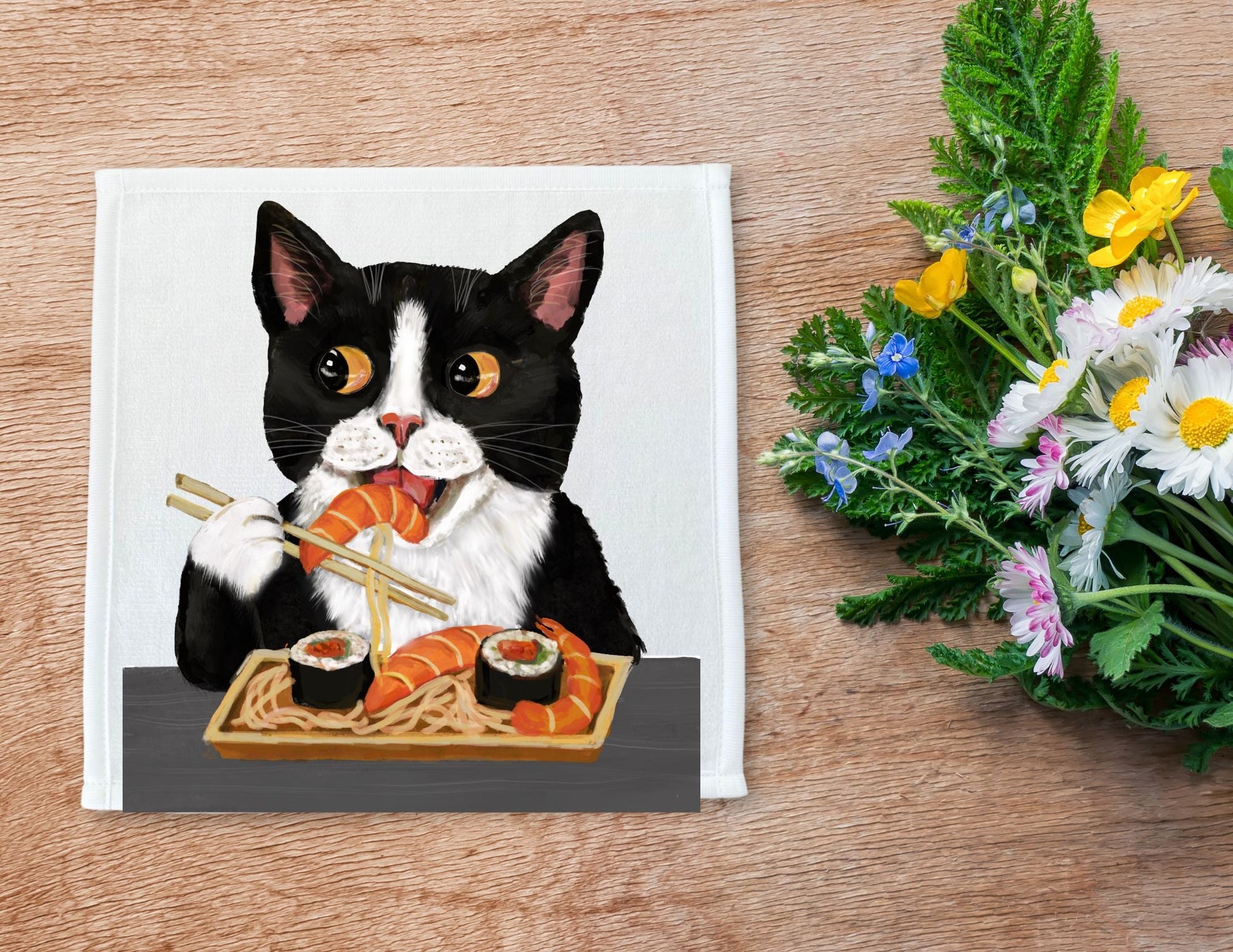 This fun and flavorful washcloth features a tuxedo cat enjoying a sushi feast with chopsticks in paw. Illustrated by Harika Altungun, the design blends humor and elegance—perfect for cat lovers who appreciate a good meal and quirky charm. Whether for your kitchen or as a gift, this washcloth brings a touch of playful sophistication to any space.