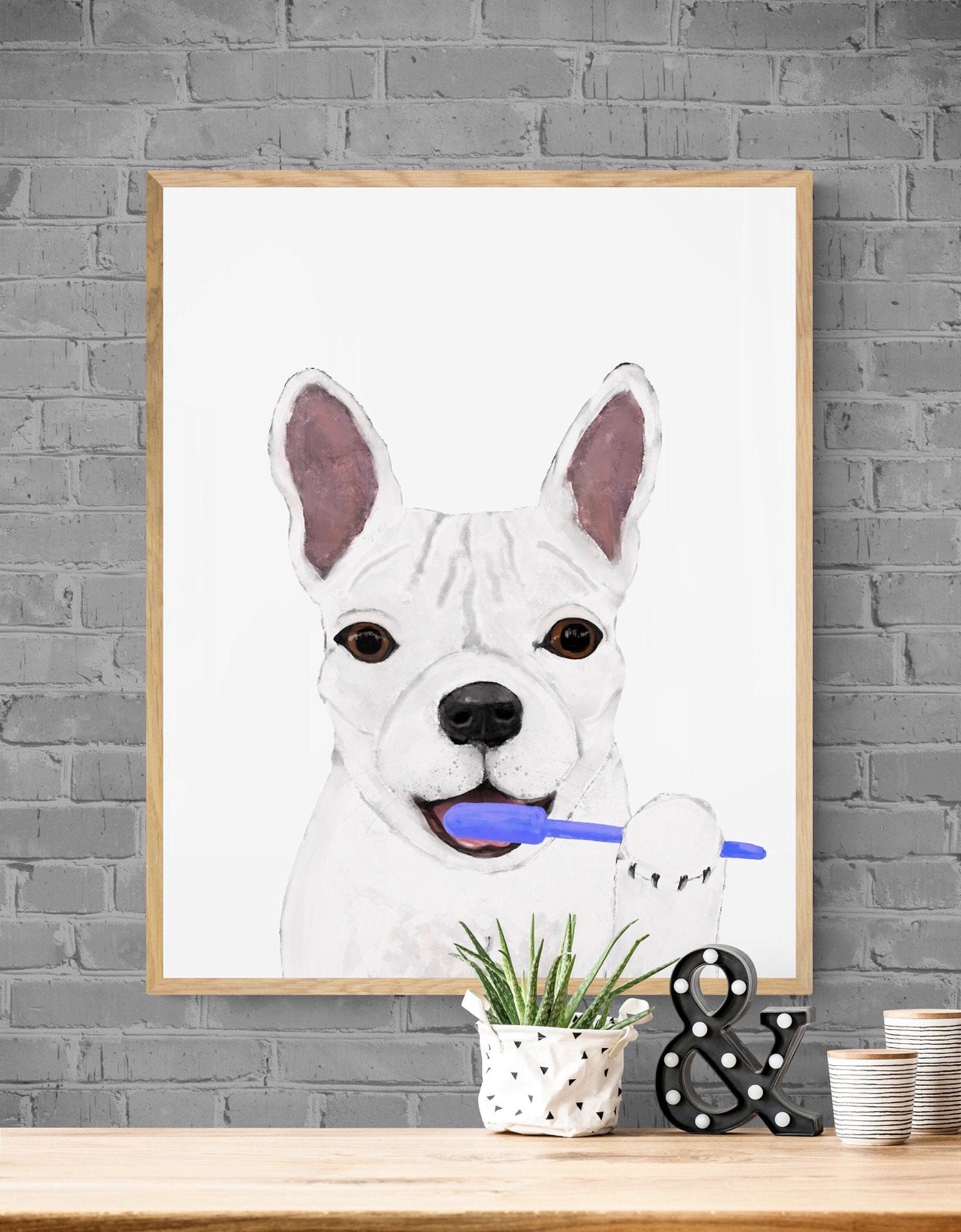 White French Bulldog Brushing Teeth Art Print – Funny Dog Wall Decor